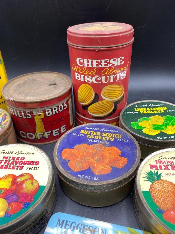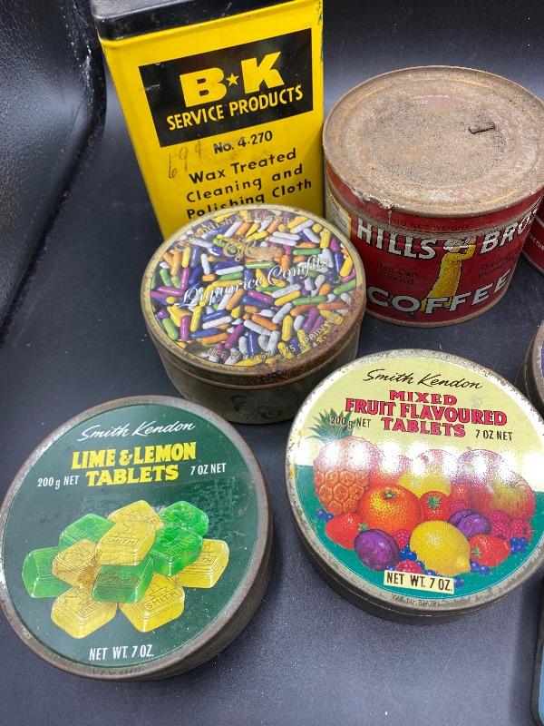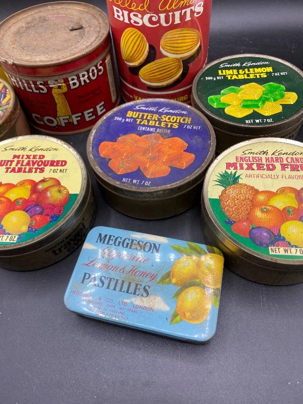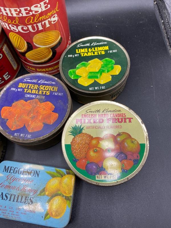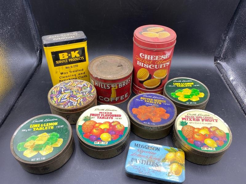 Mixed lot of vintage tins. Most of them are vintage hard candy tins. All show their age to some degree with scratches and rust. Great for display or repurpose. 10 tins total.