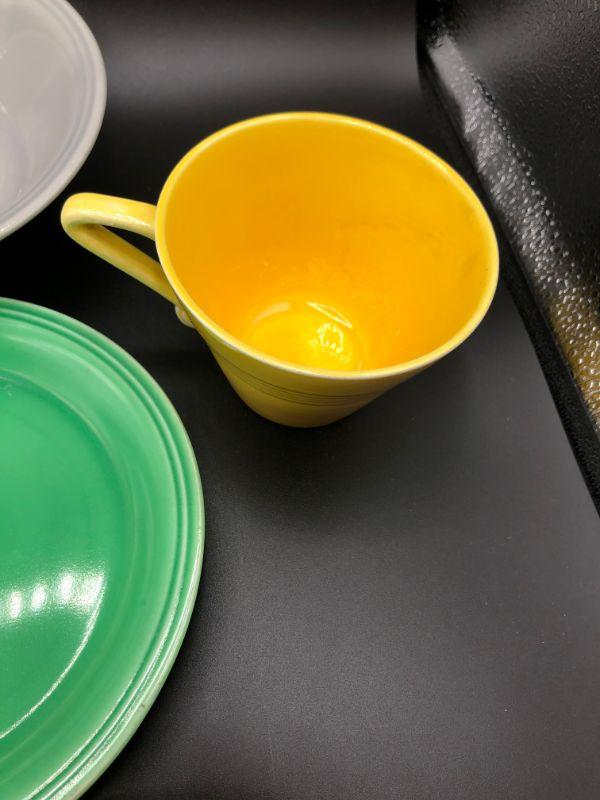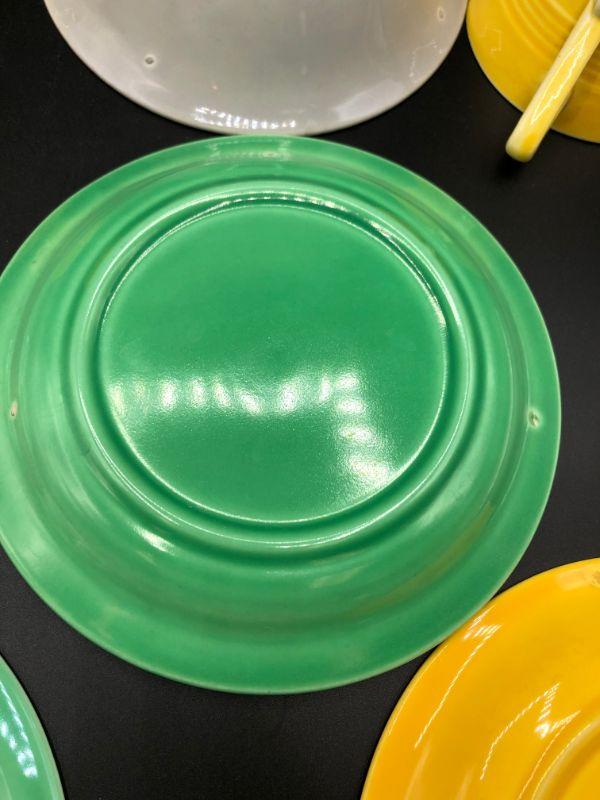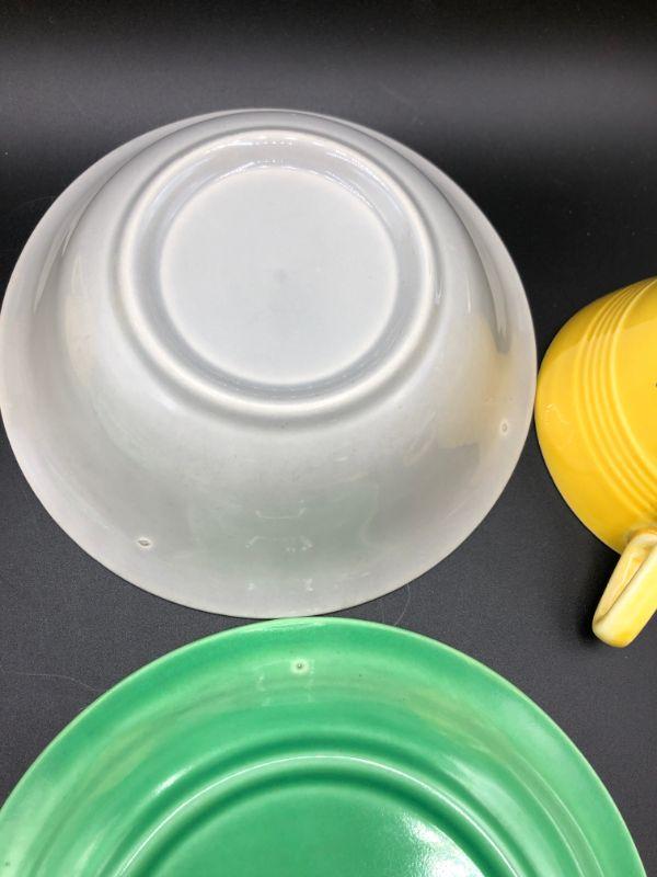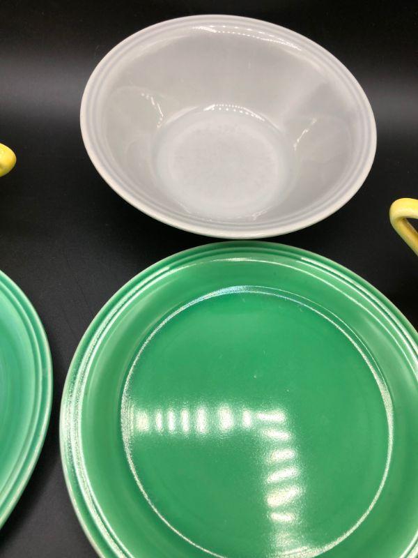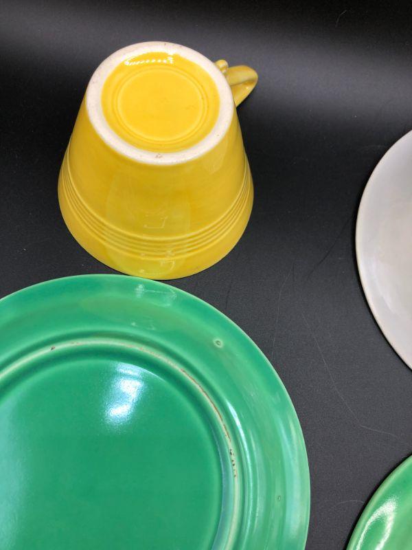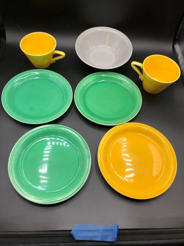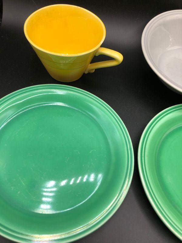 7 pieces of unmarked vintage Homer Laughlin pottery. Harlequin & Fiestaware pattern dishware in green, yellow, and white. The cups are yellow harlequin. The cereal bowl and plates are early Fiestaware I believe. Signs from normal use but in good condition otherwise.