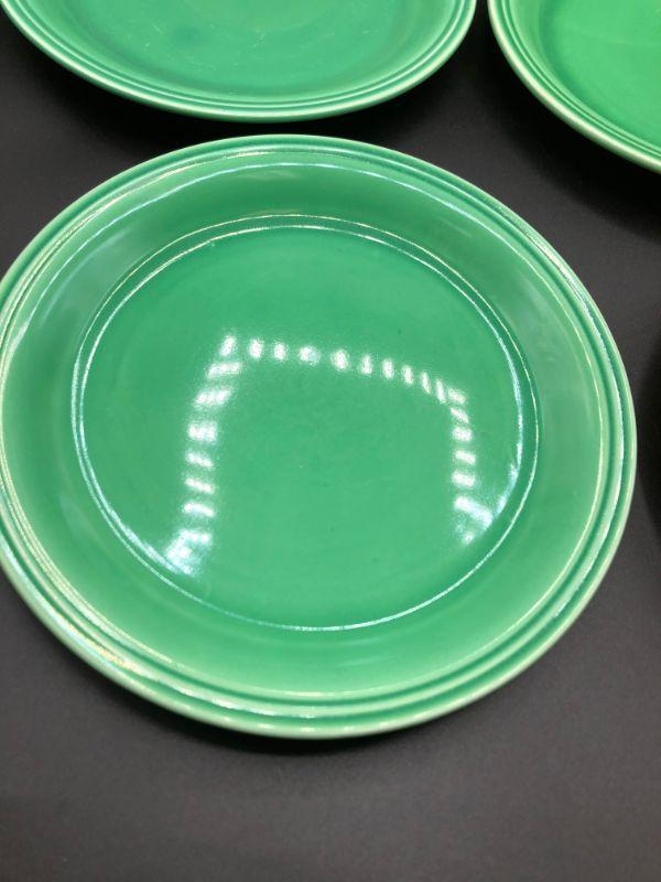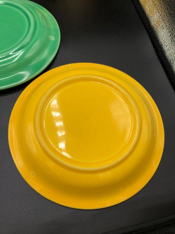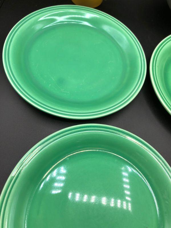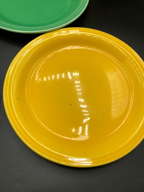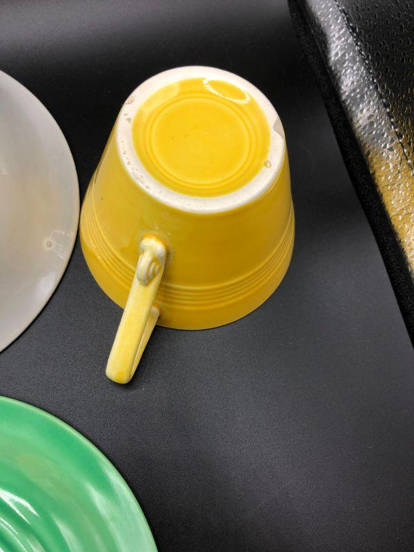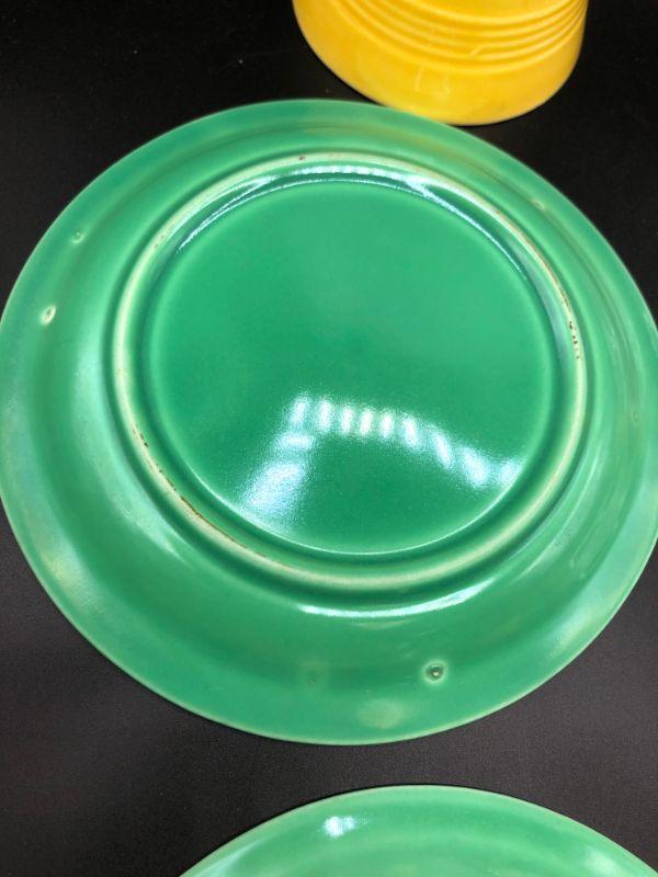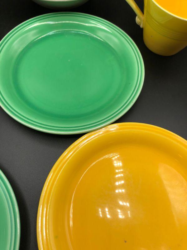 7 pieces of unmarked vintage Homer Laughlin pottery. Harlequin & Fiestaware pattern dishware in green, yellow, and white. The cups are yellow harlequin. The cereal bowl and plates are early Fiestaware I believe. Signs from normal use but in good condition otherwise.