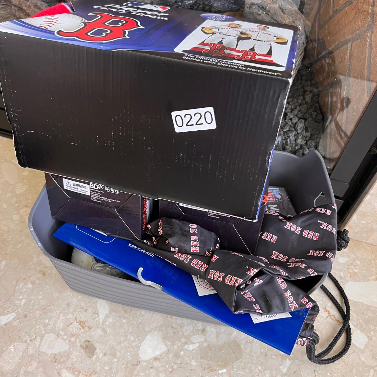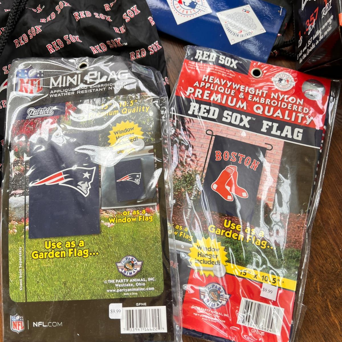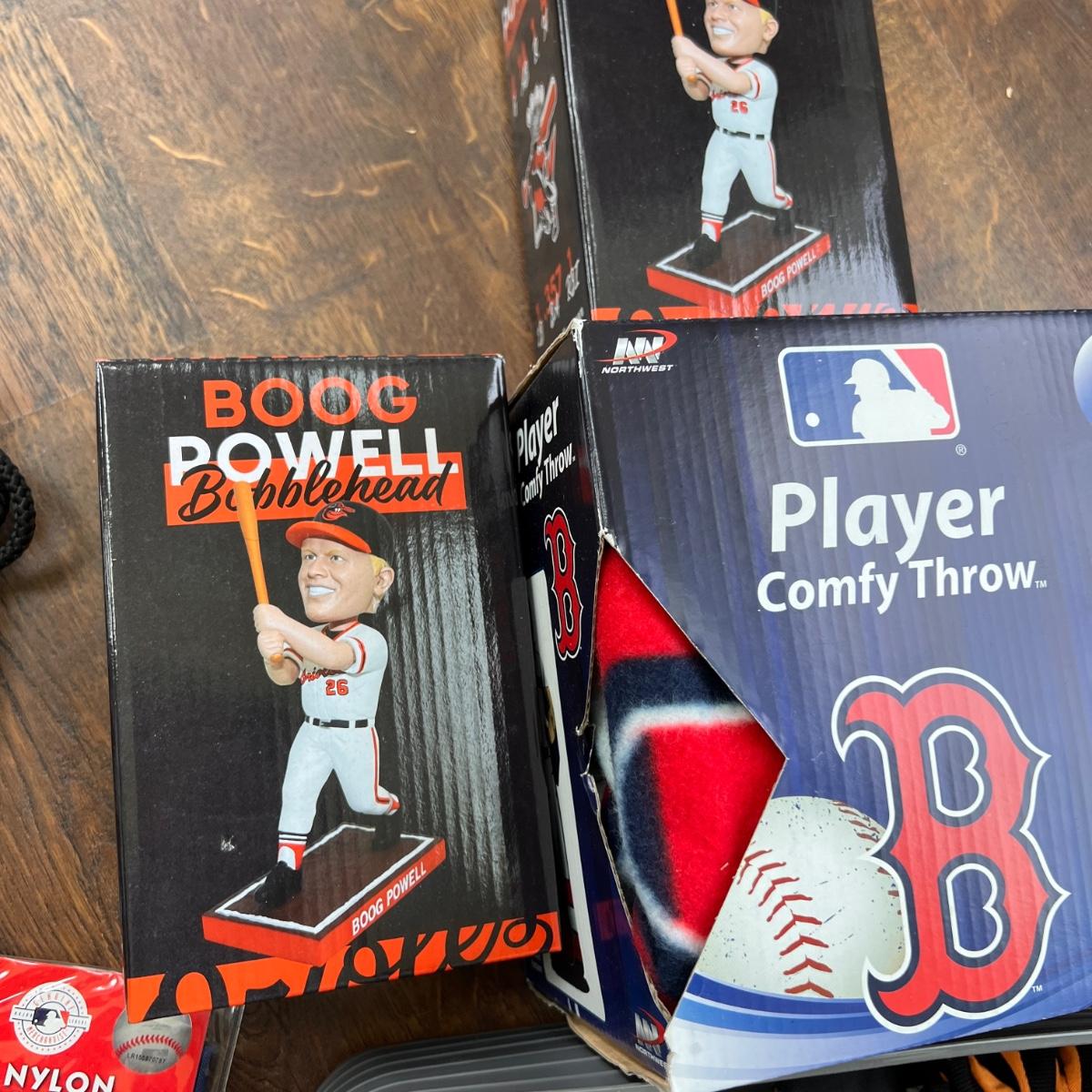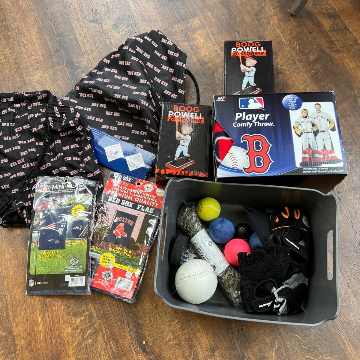2 Boog Powell Stadium Bobble Heads Baltimore Orioles, Red Sox drawstring bags, Patriots and Red Sox flags, Red Sox throw blanket, miscellaneous balls, etc.