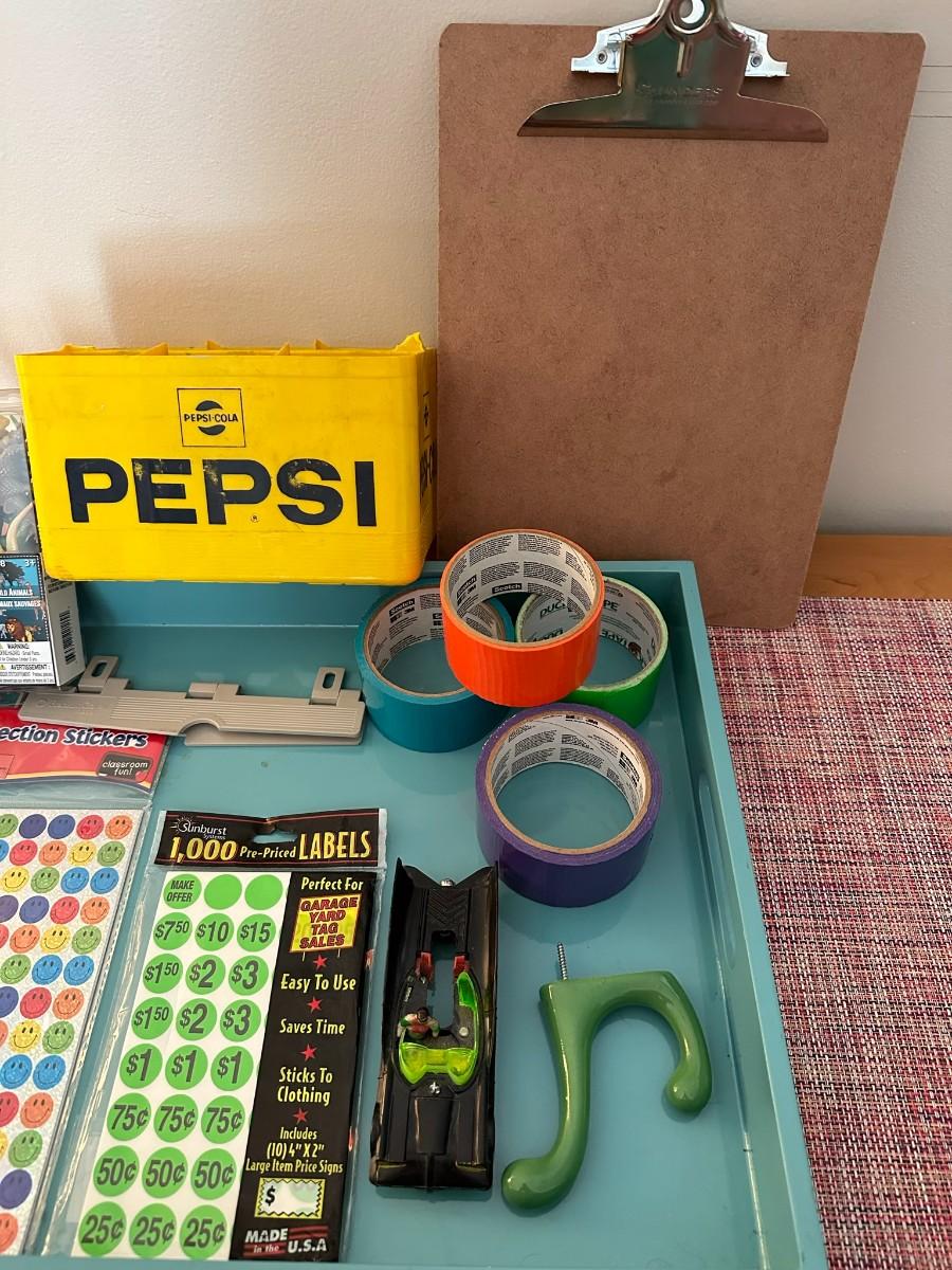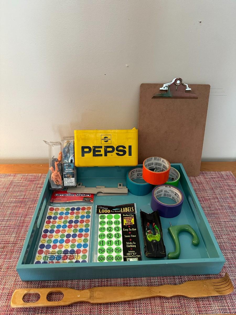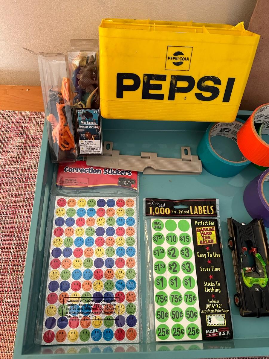 Tourquoise/Aqua Tray 18"x 14", yellow plastic Pepsi-Cola 6-pack holder w/broken handle, wood back scratcher, plastic animals, colored duck tape, clip board, green wall hook, Batman car with Robin, smiley face stickers, yard sale pricing stickers.