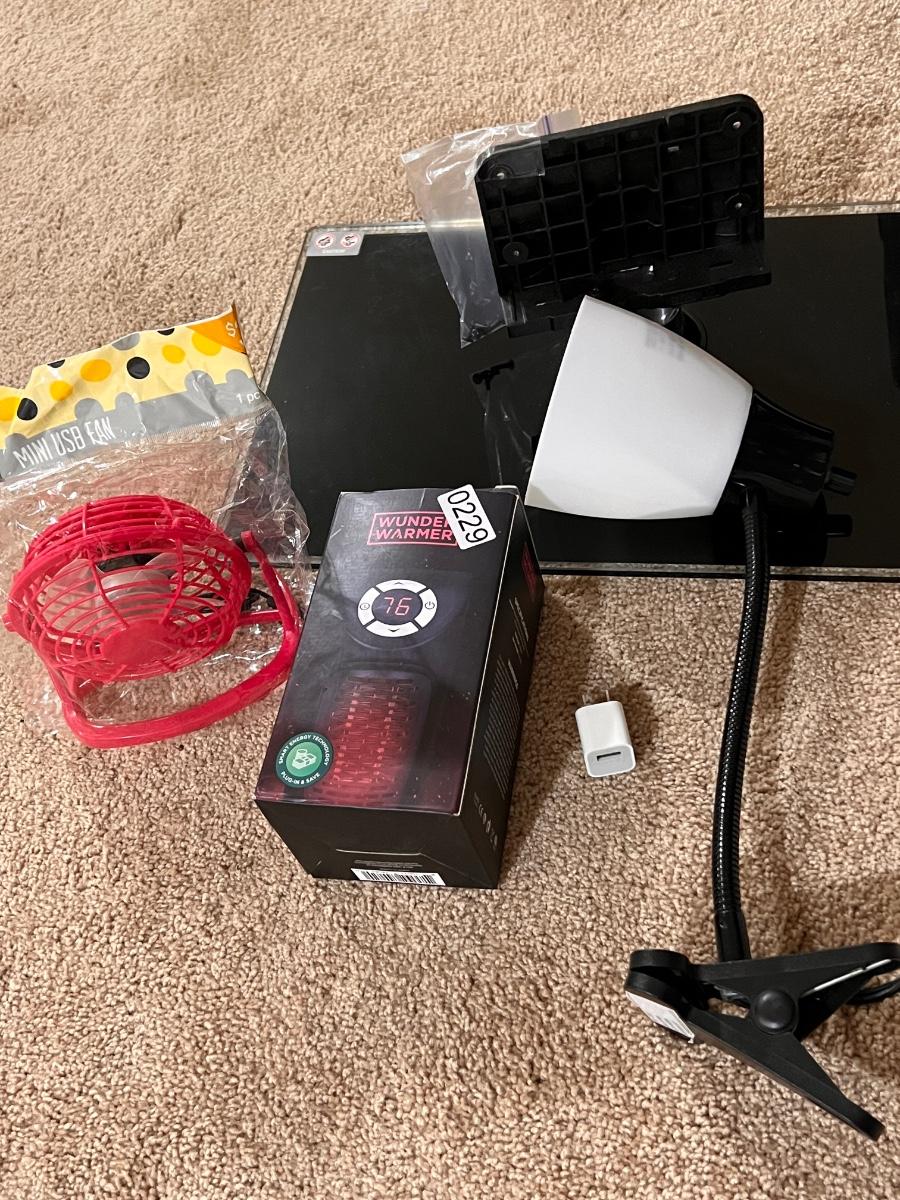 New mini usb fan, new wunder warmer portable space heater, working clip on light, base for tv.