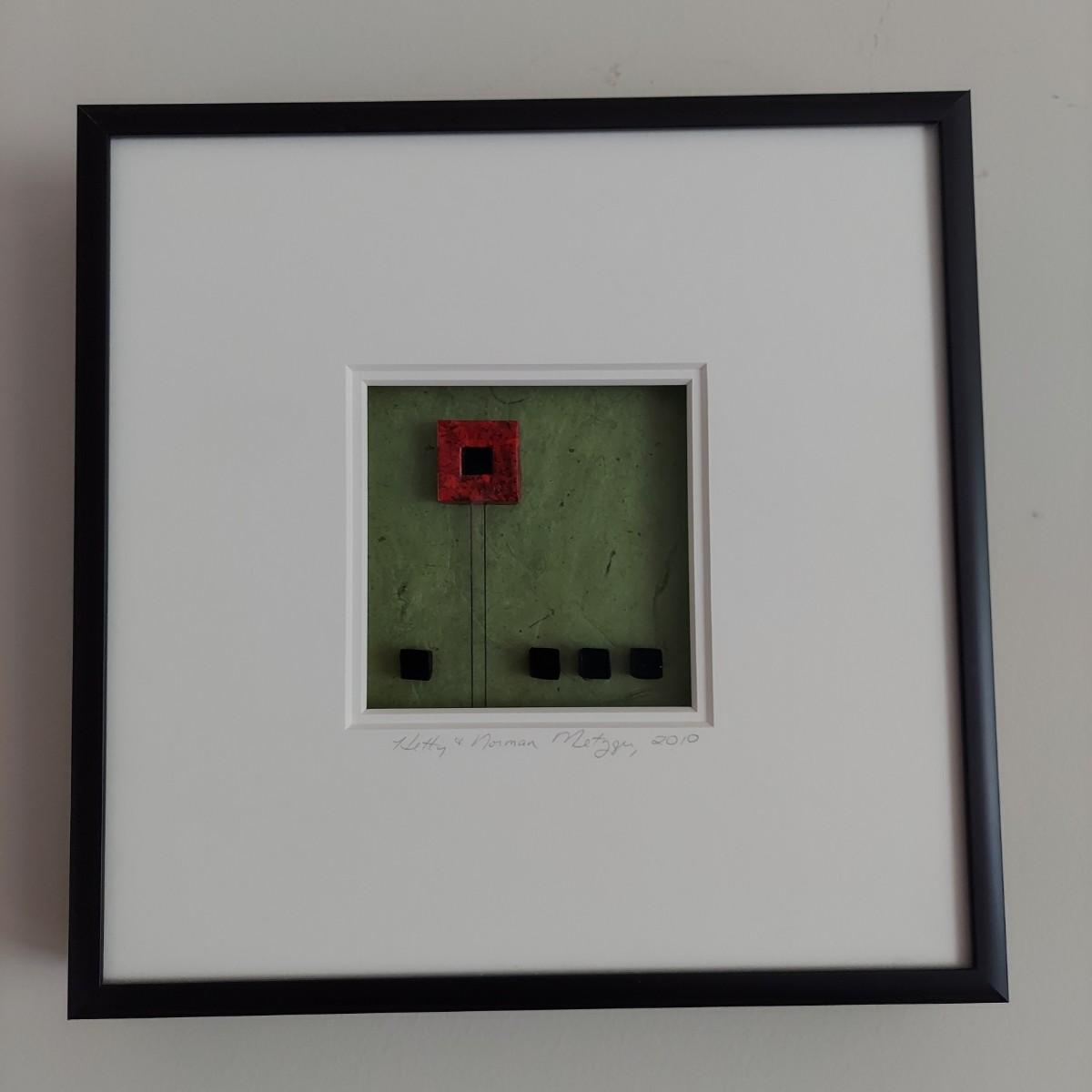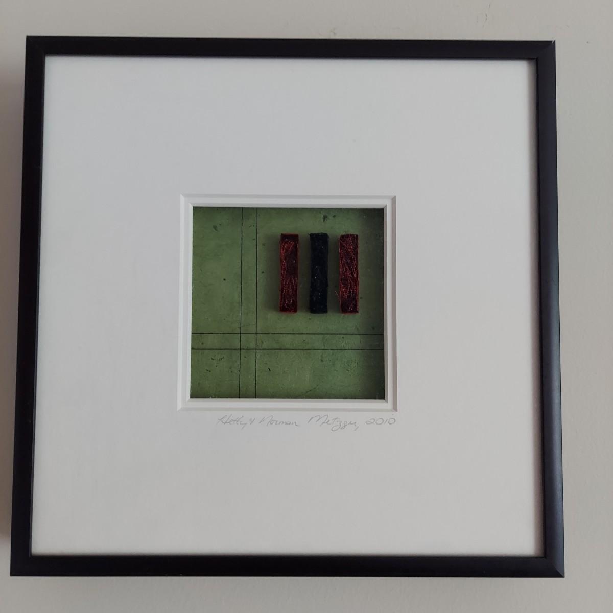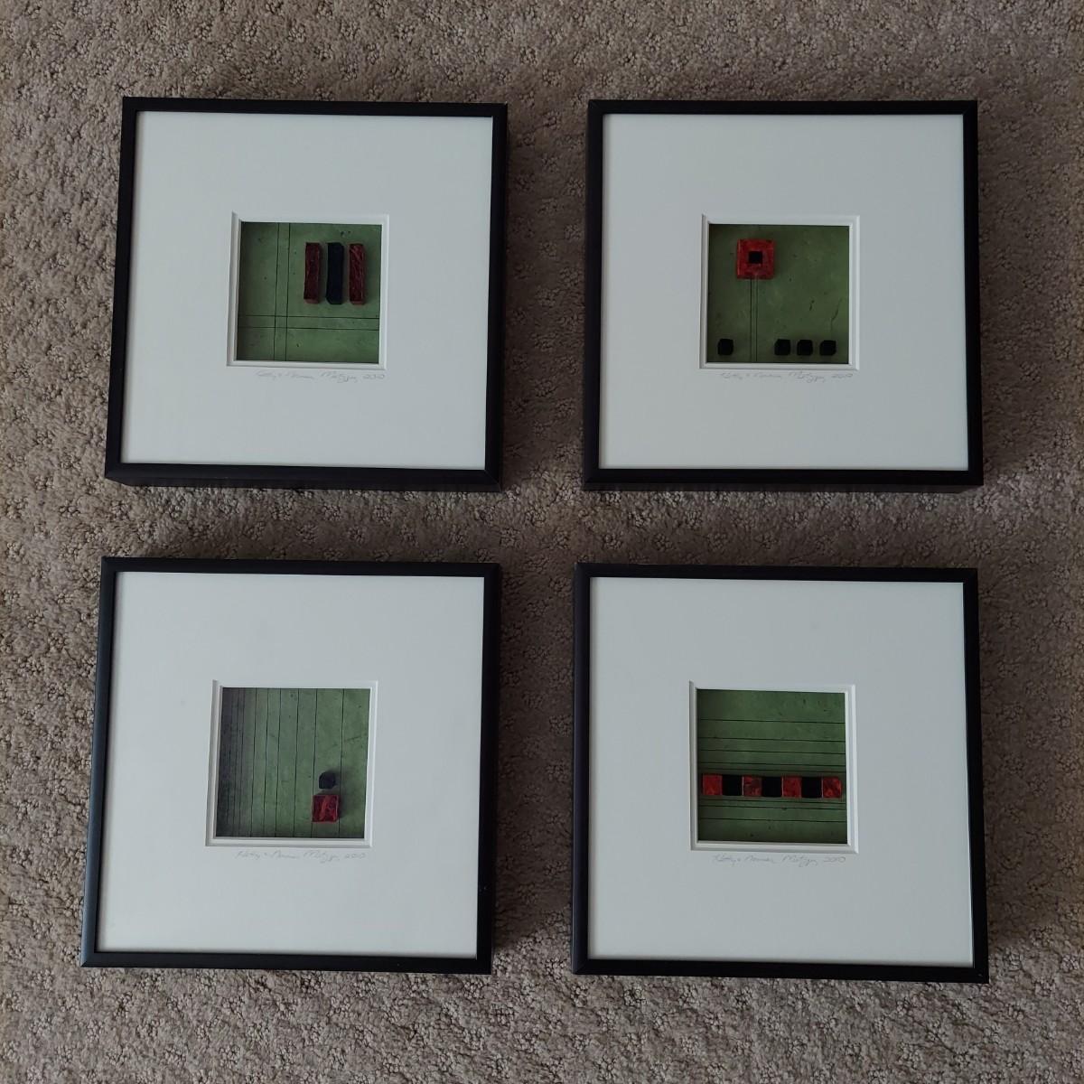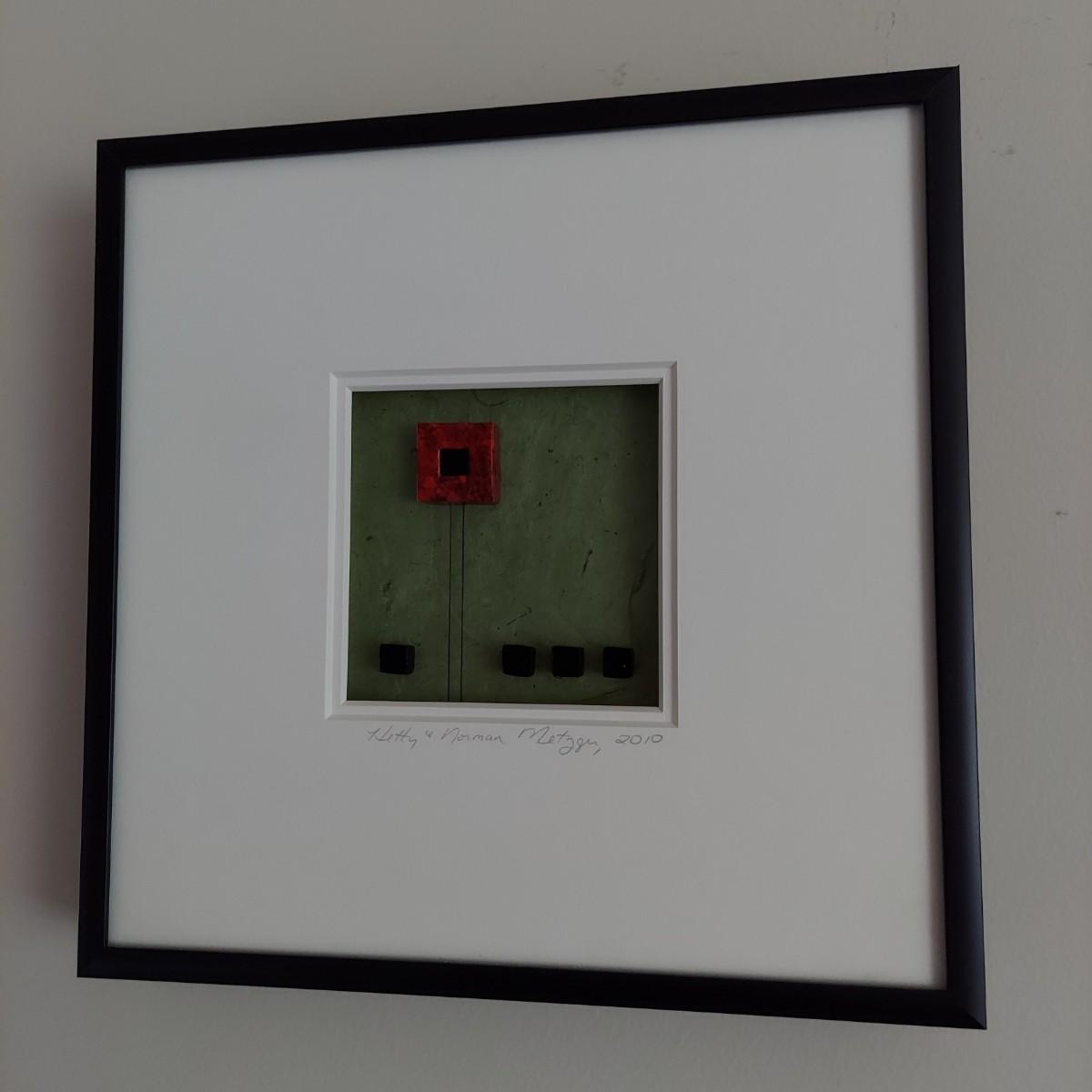 Four pieces of framed and matted mixed media art in metal frames. Hetty and Norman Metzger specialize in a mix of folded paper and fiber arts. Pencil signed by the artists. Each frame is 8" x 1.5" x 8"H. Shipping available.