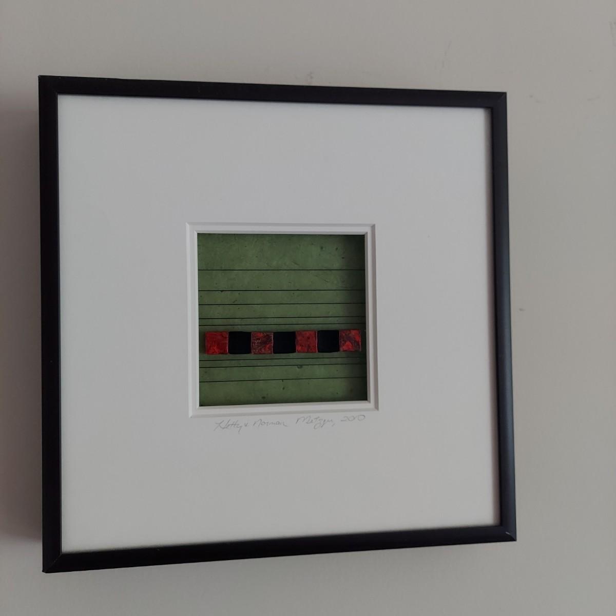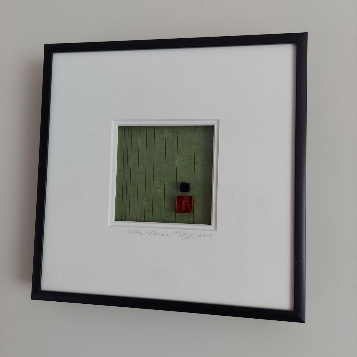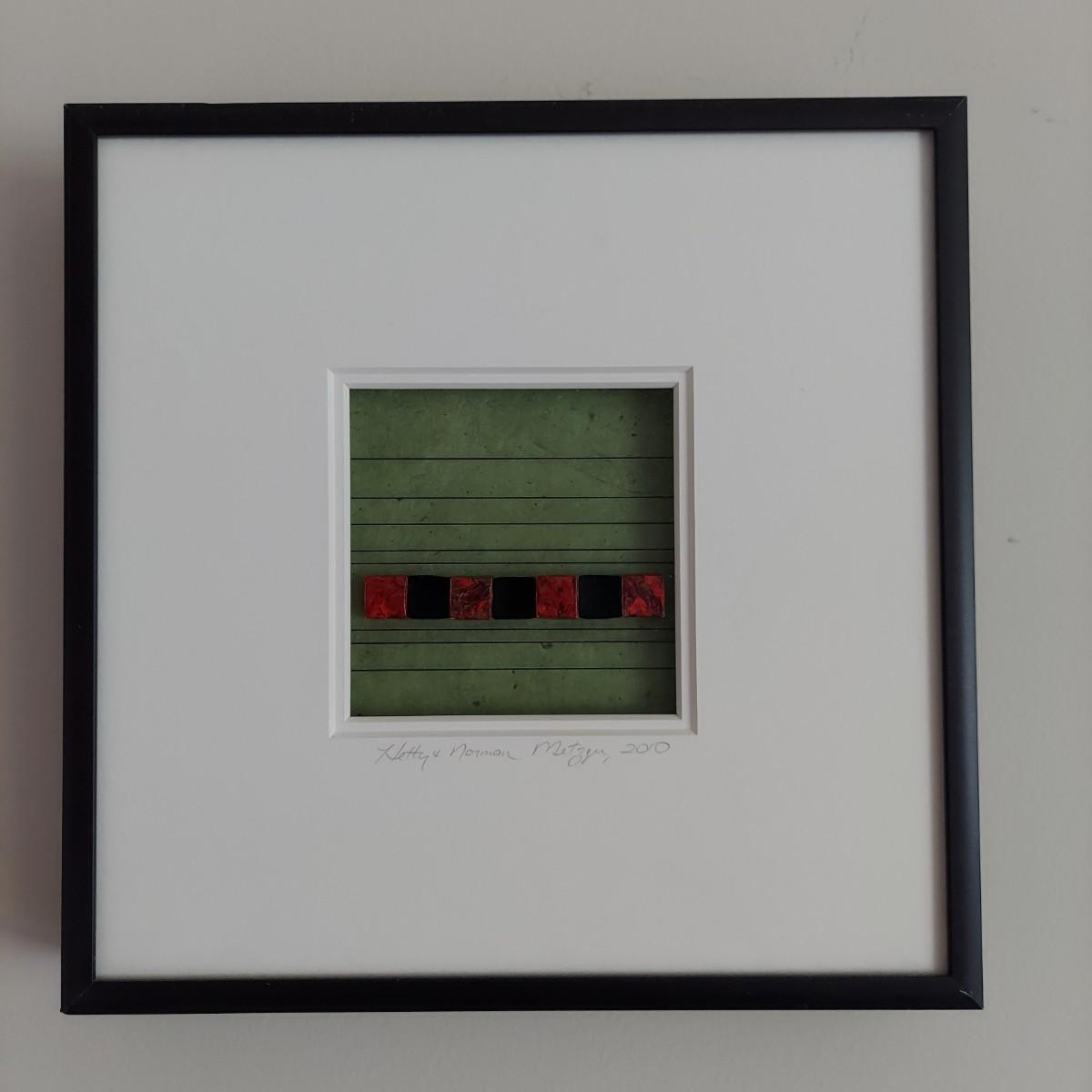 Four pieces of framed and matted mixed media art in metal frames. Hetty and Norman Metzger specialize in a mix of folded paper and fiber arts. Pencil signed by the artists. Each frame is 8" x 1.5" x 8"H. Shipping available.