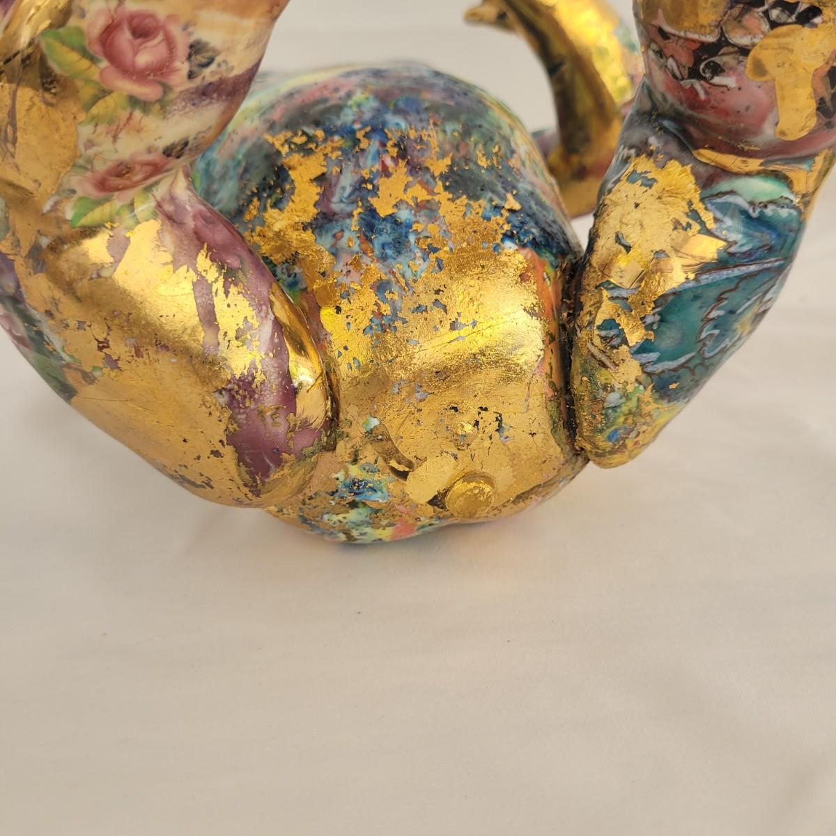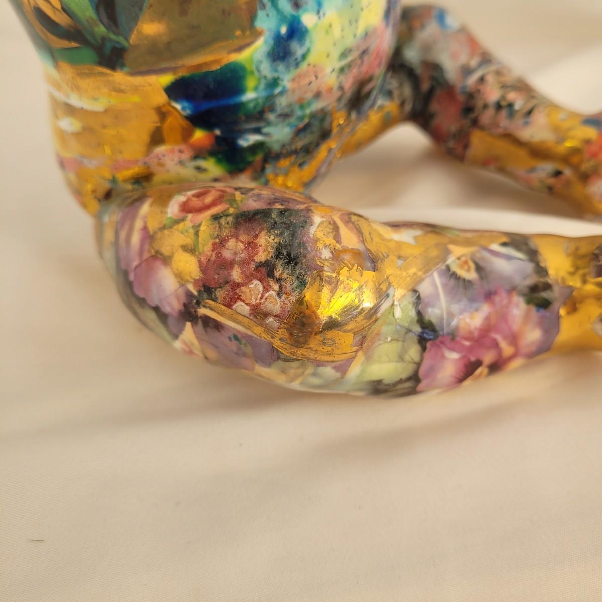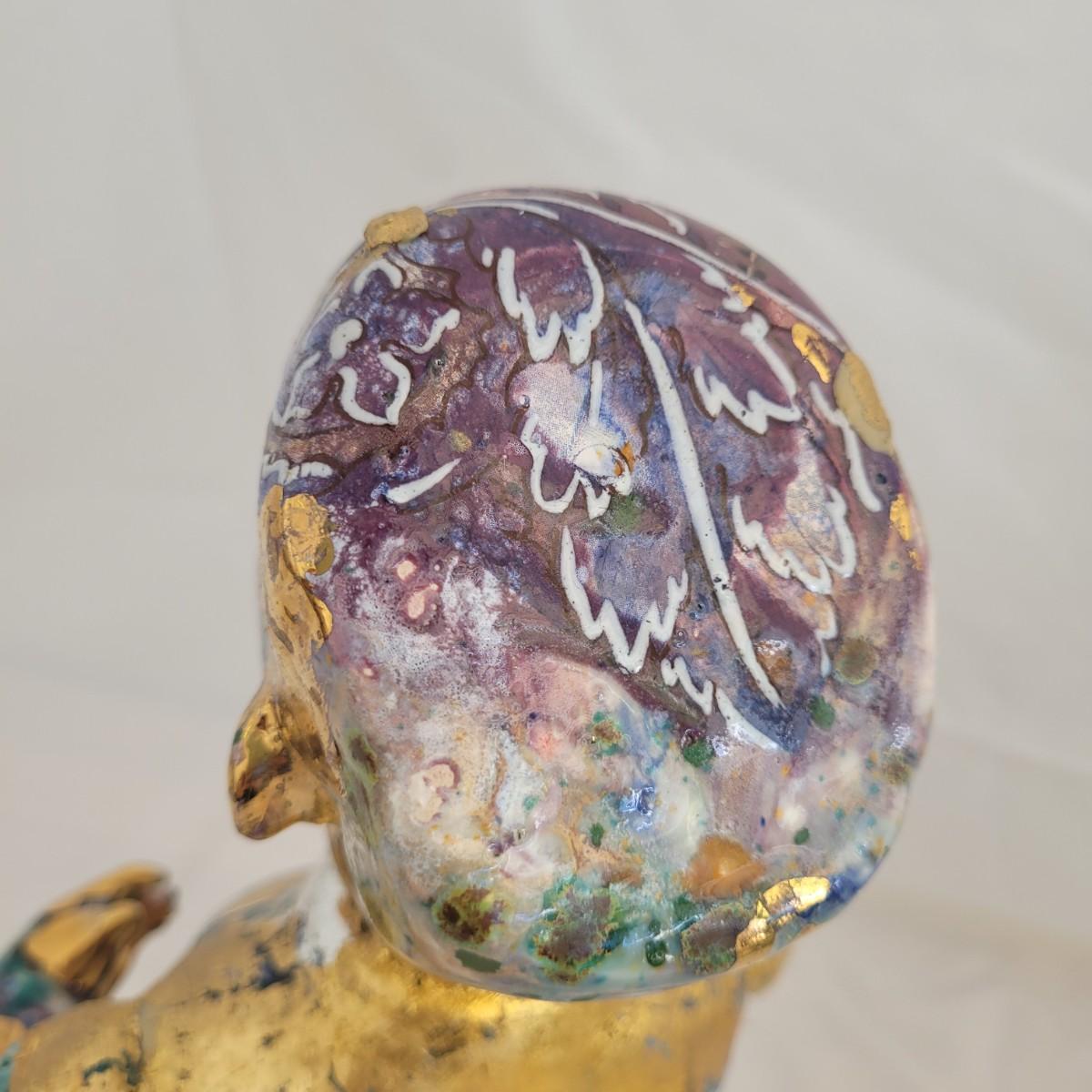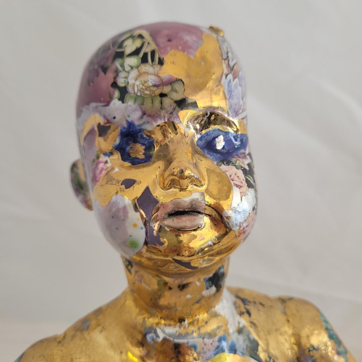 This one of a kind mixed media baby doll sculpture features what appears to be a glossy painted base with a decoupage collage style of paper and gold paint overlays. Unable to determine material but appears to be hard plastic underneath, possibly the original doll. Measures approximately 7.5 “ x 7.5” x 12”H. Shipping available.