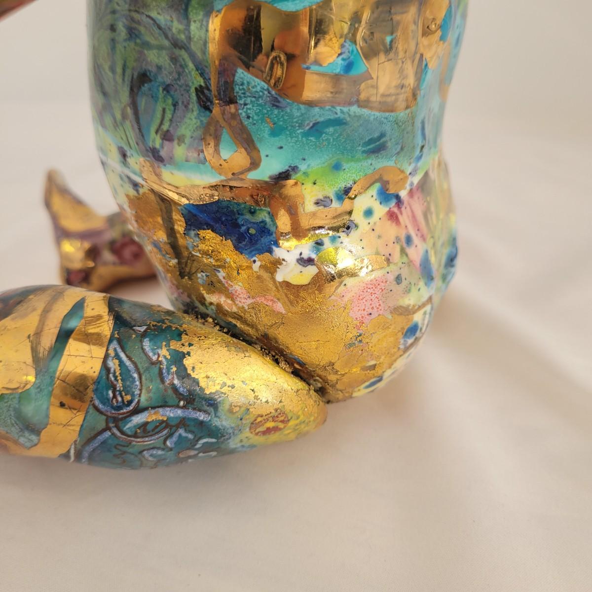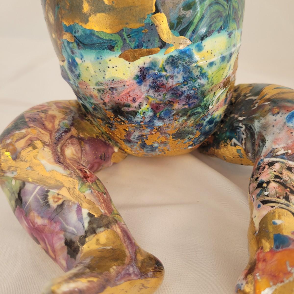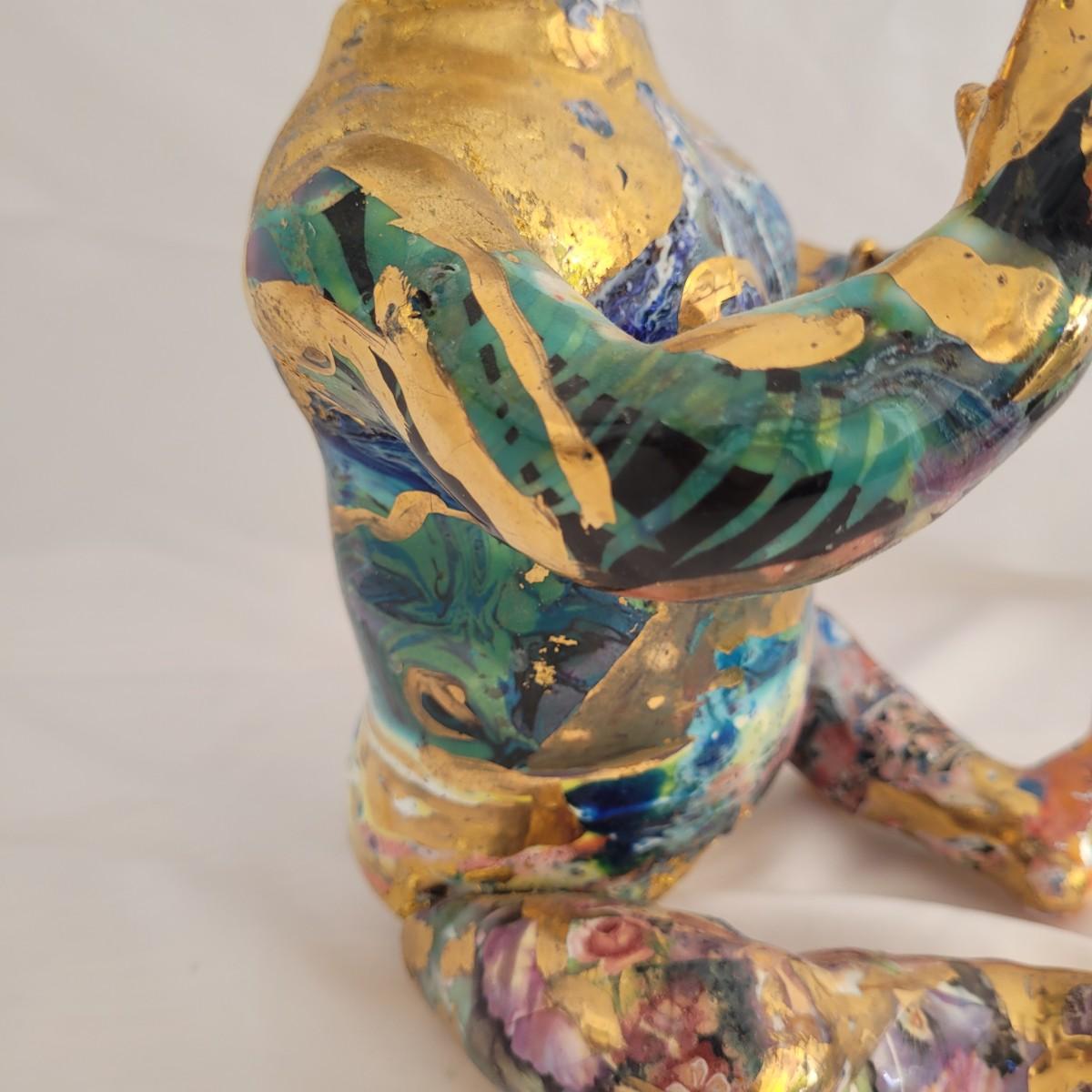 This one of a kind mixed media baby doll sculpture features what appears to be a glossy painted base with a decoupage collage style of paper and gold paint overlays. Unable to determine material but appears to be hard plastic underneath, possibly the original doll. Measures approximately 7.5 “ x 7.5” x 12”H. Shipping available.