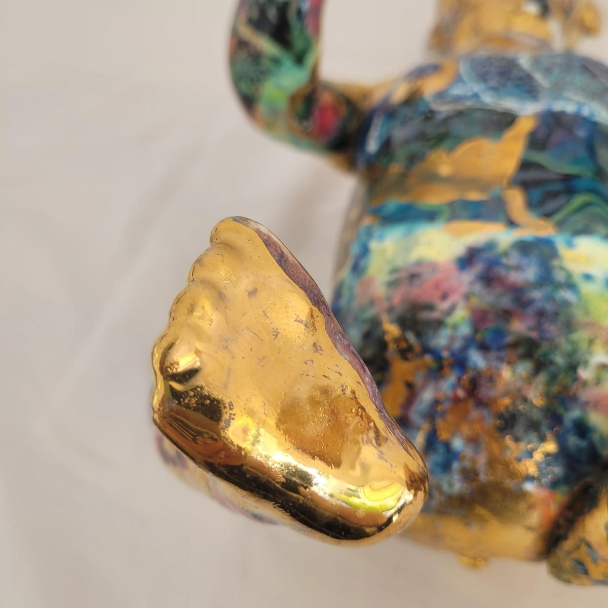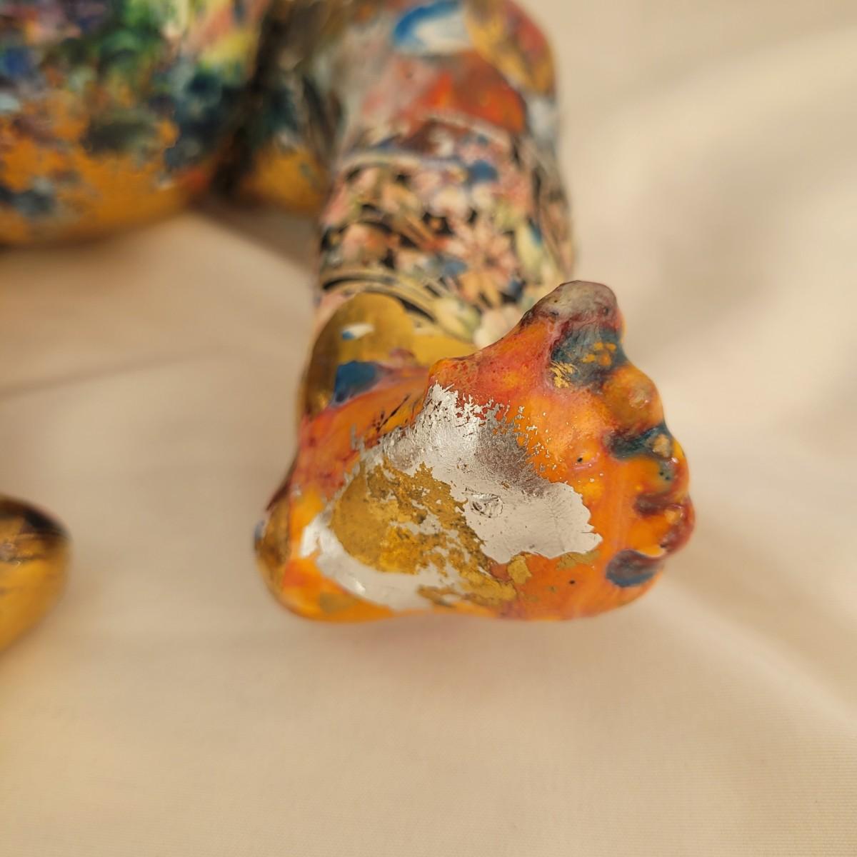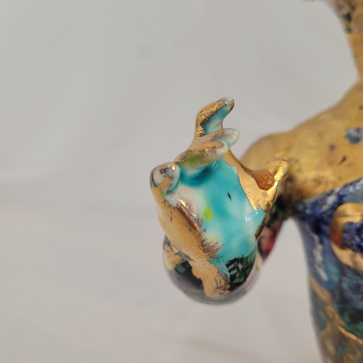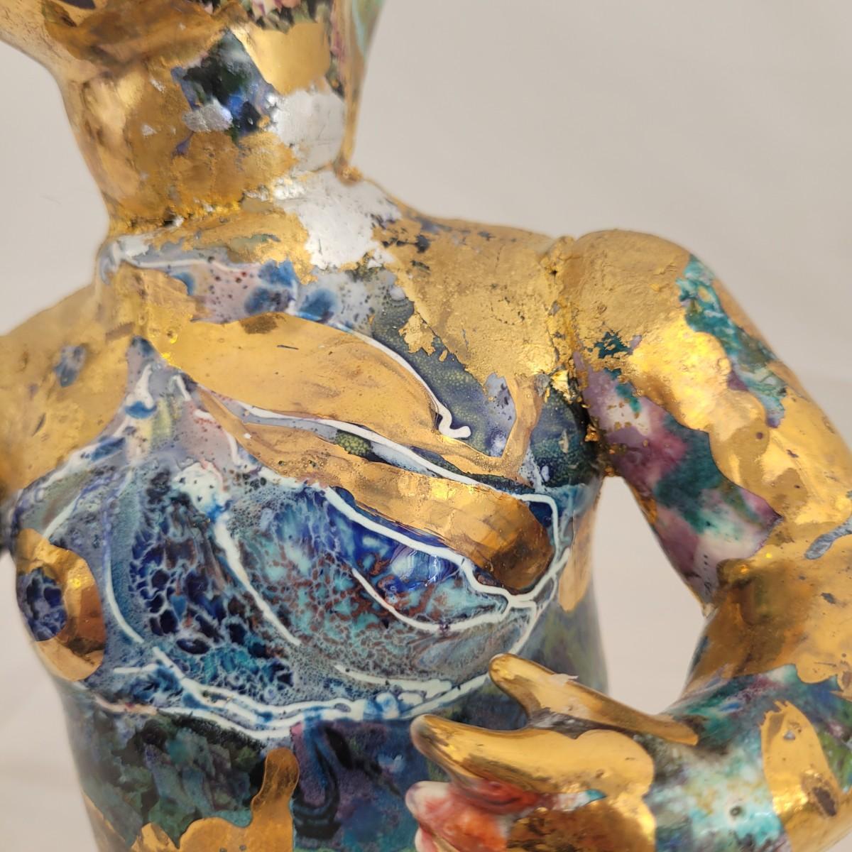 This one of a kind mixed media baby doll sculpture features what appears to be a glossy painted base with a decoupage collage style of paper and gold paint overlays. Unable to determine material but appears to be hard plastic underneath, possibly the original doll. Measures approximately 7.5 “ x 7.5” x 12”H. Shipping available.