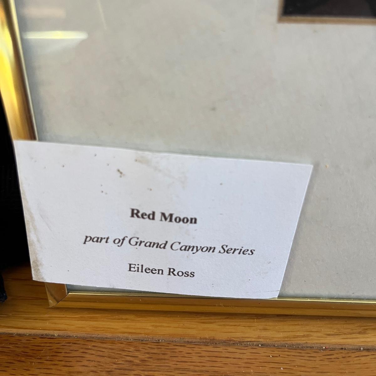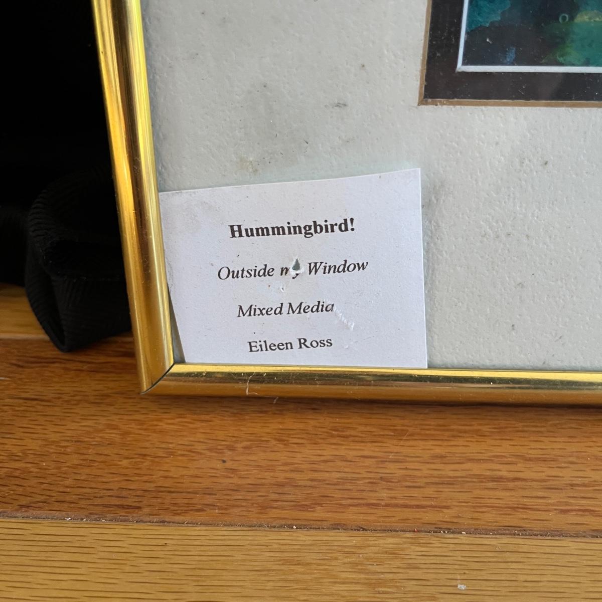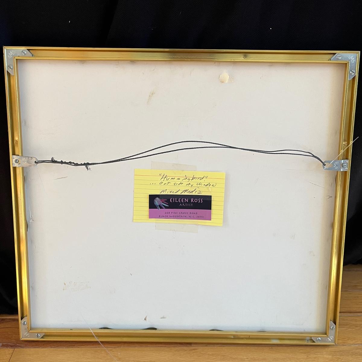 Lot includes an original metal framed piece of mixed media art titled 'Hummingbird!' (16"x 18") and a metal framed collage titled 'Red Moon'. Both pieces are under glass and by artist Eileen Ross.