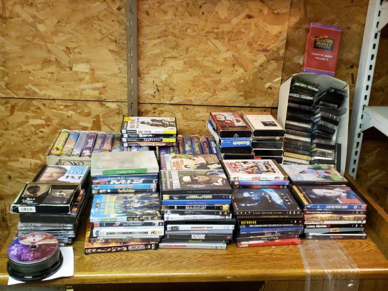 Mixed Media Lot #1. Collection of DVD, CD, PS2, VHS, Disney Clamshell & Cassettes. Great for a your home or flea market. Lot# 0058