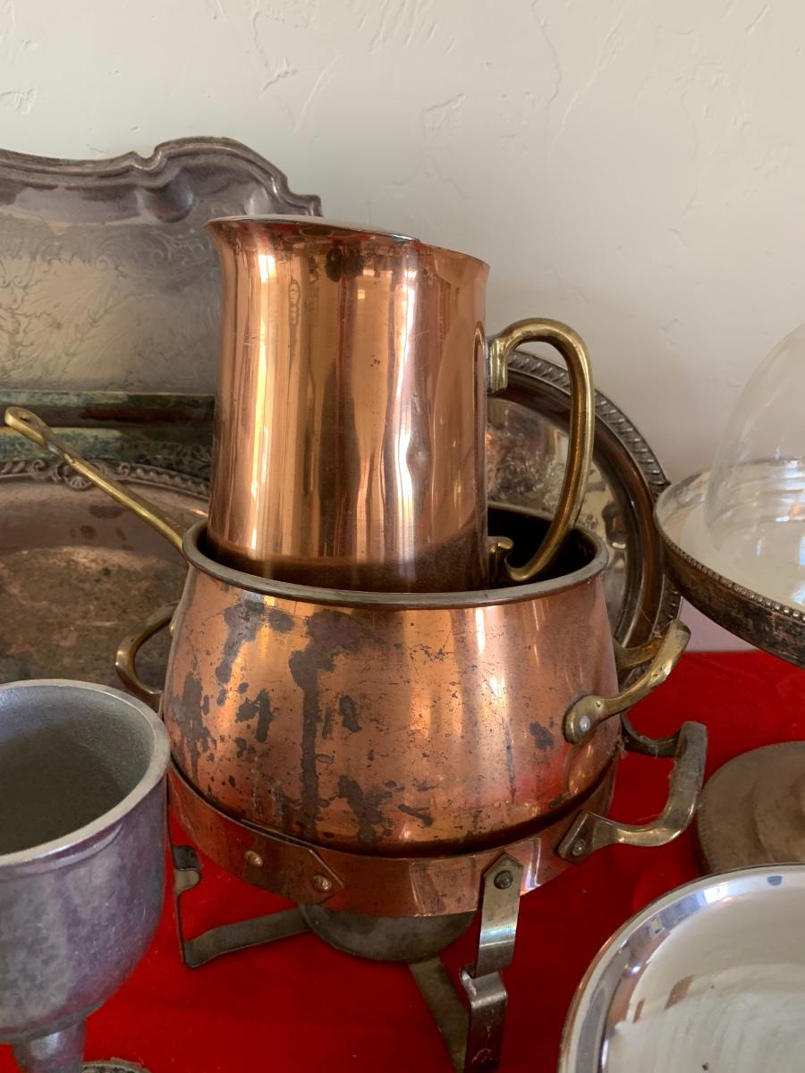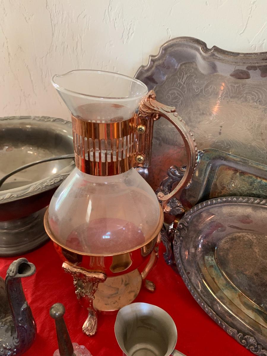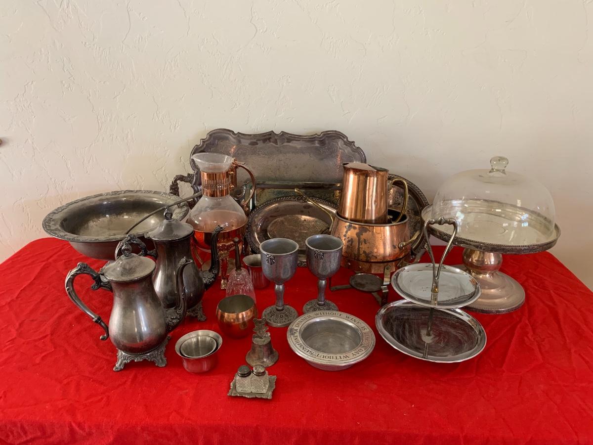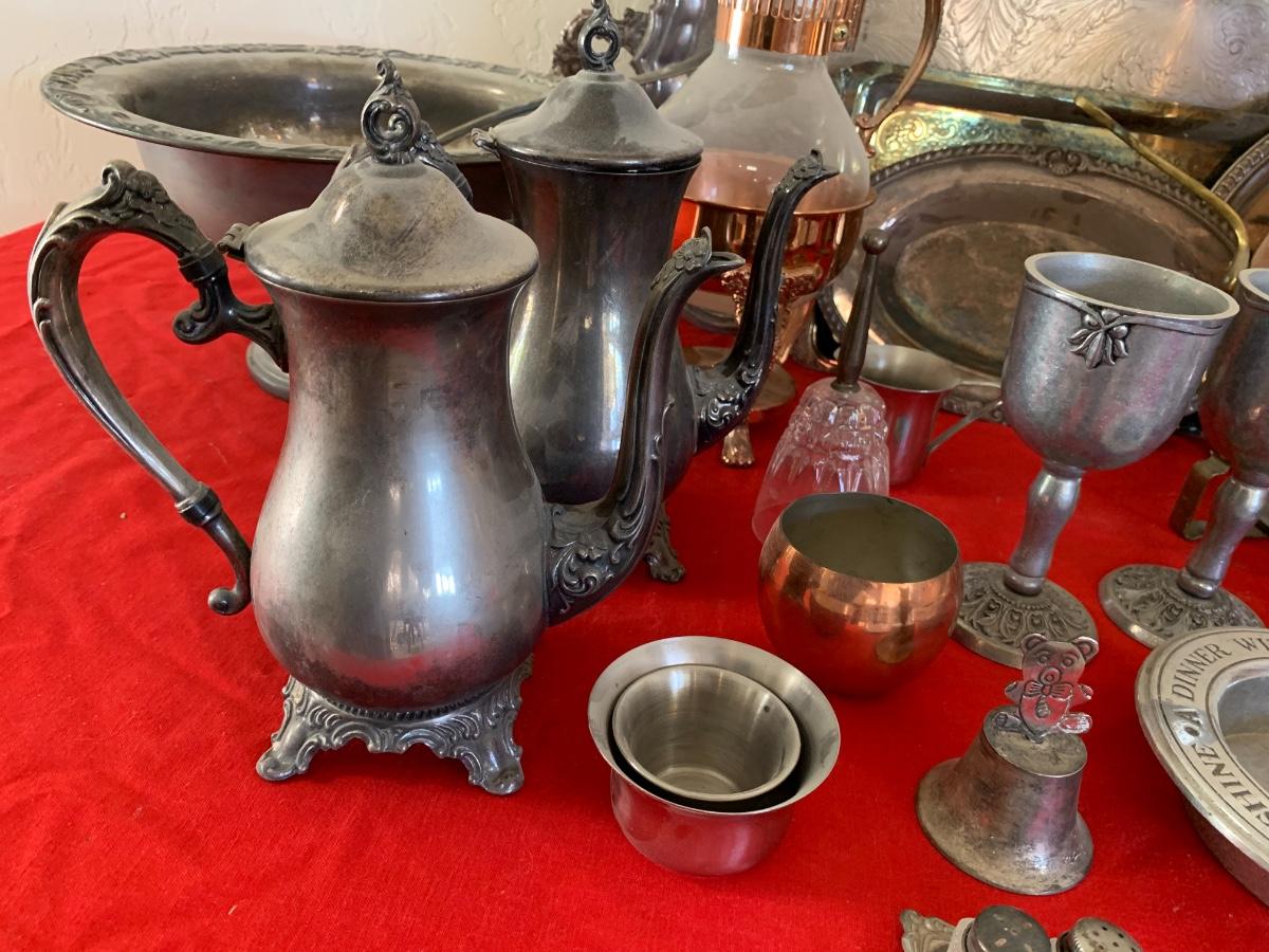 Mixed metals including silver plate, copper and pewter. All in good condition with tarnish and rust. Includes a cake plate, coffee carafe and a punch bowl amongst others