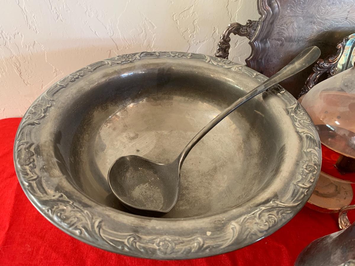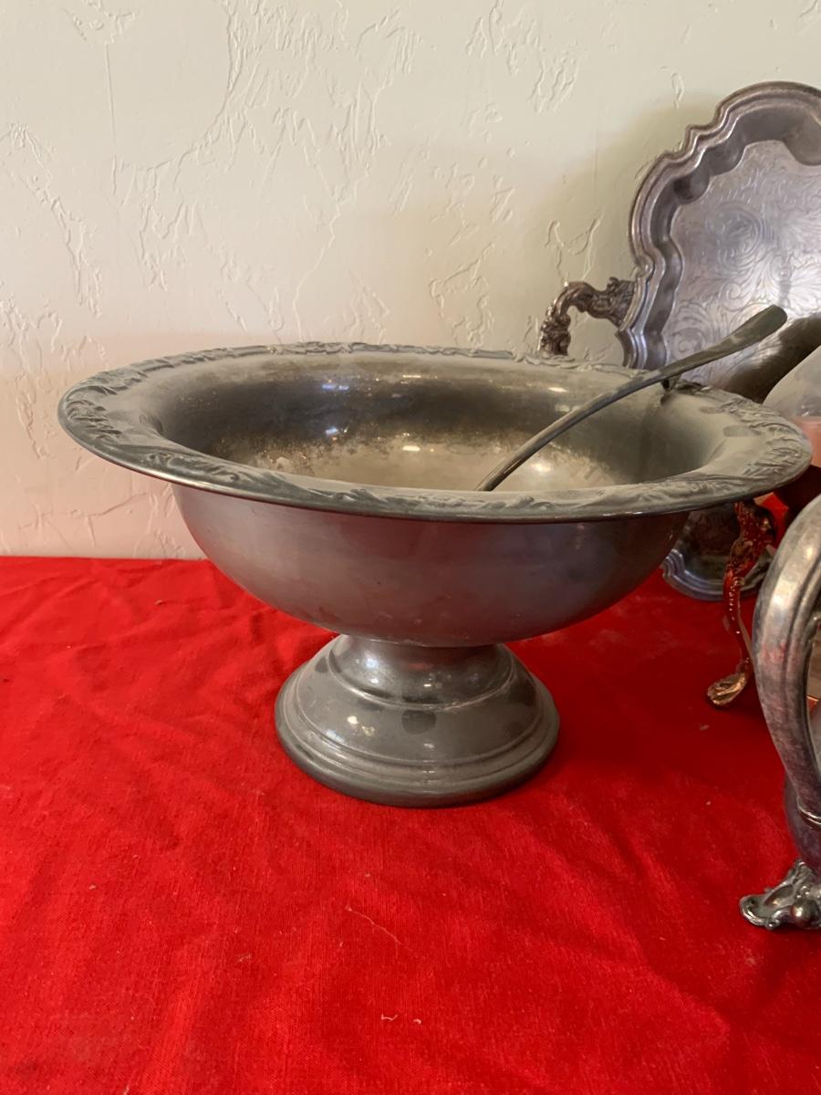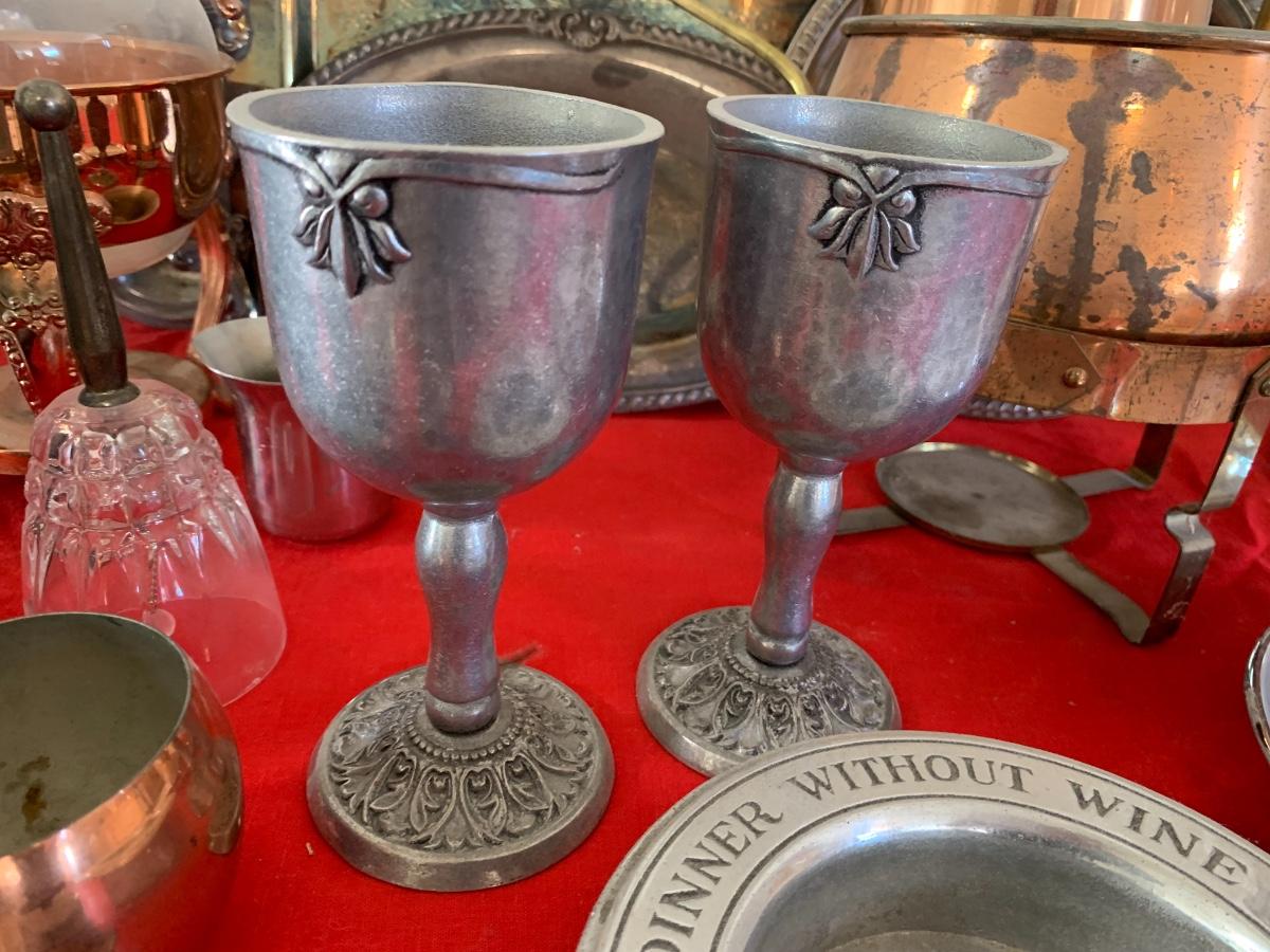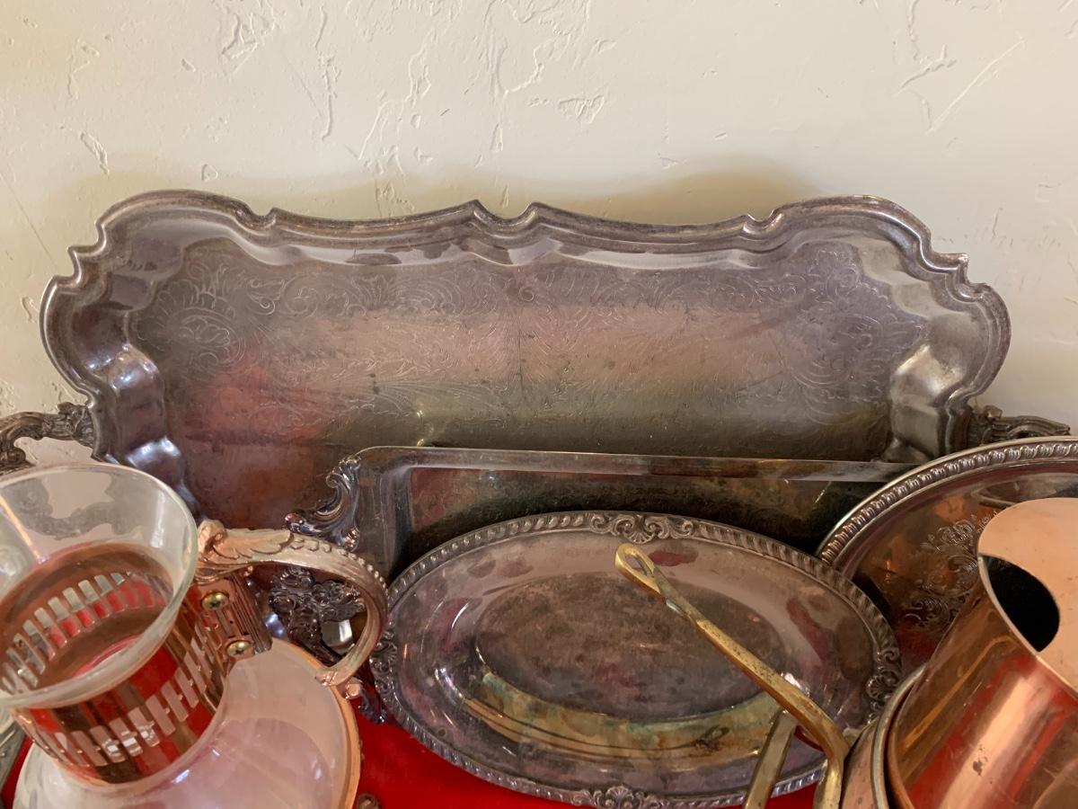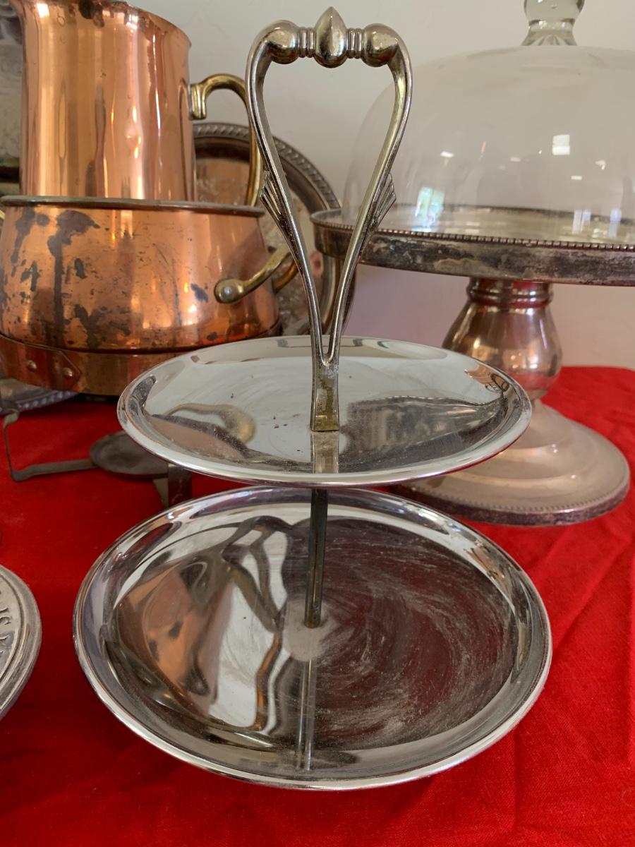 Mixed metals including silver plate, copper and pewter. All in good condition with tarnish and rust. Includes a cake plate, coffee carafe and a punch bowl amongst others