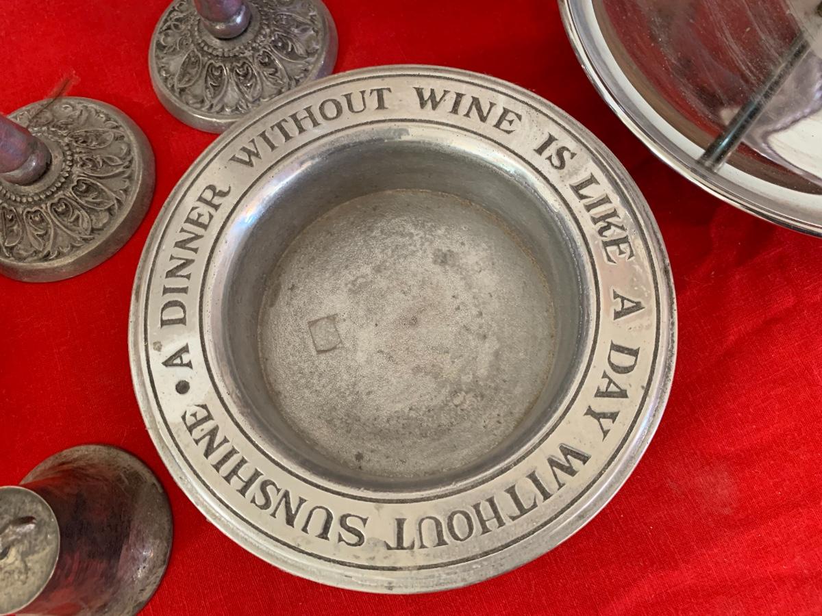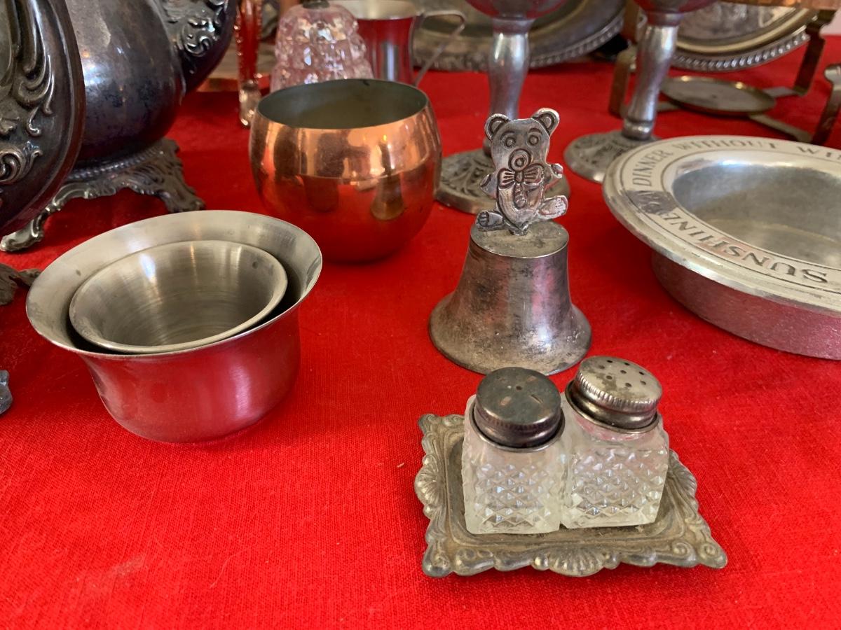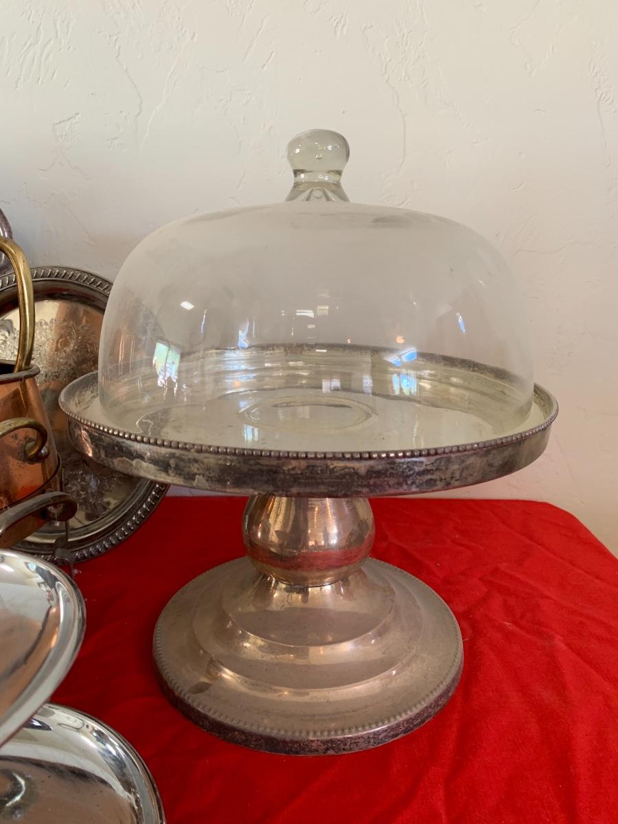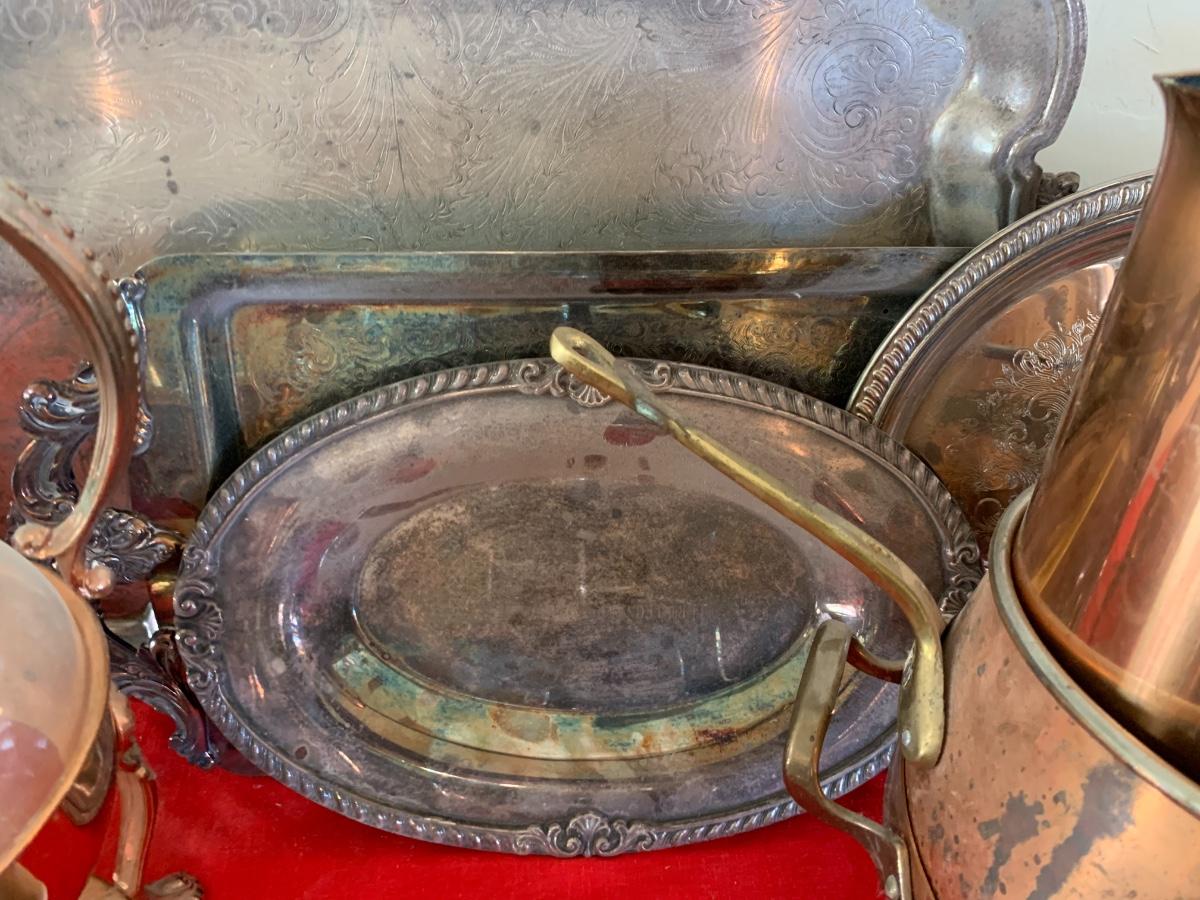 Mixed metals including silver plate, copper and pewter. All in good condition with tarnish and rust. Includes a cake plate, coffee carafe and a punch bowl amongst others