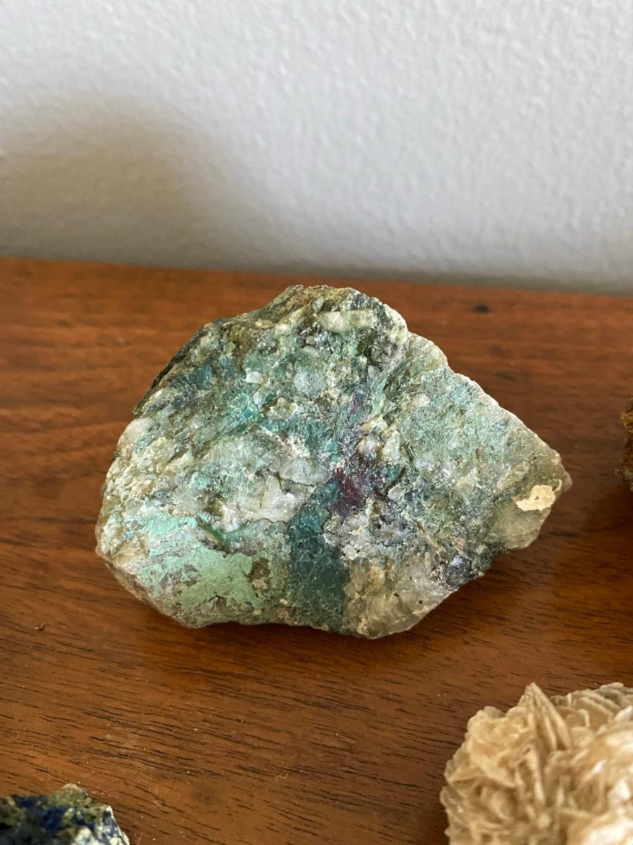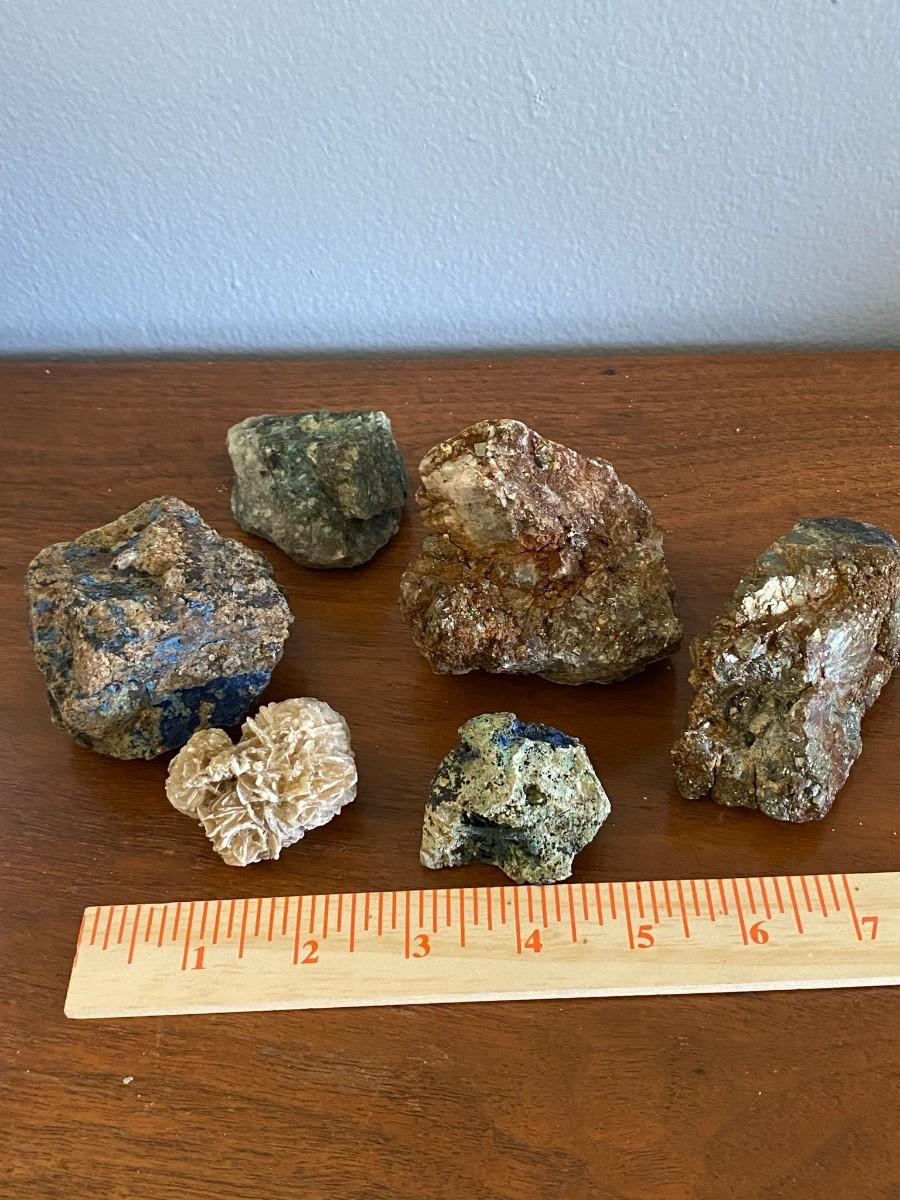 Lot of mixed rough natural stones. Large size, most are over 2.5" chunks. Great deep blue and green stones, unsure if exactly what they are but the blue does look like azurite the more I look online