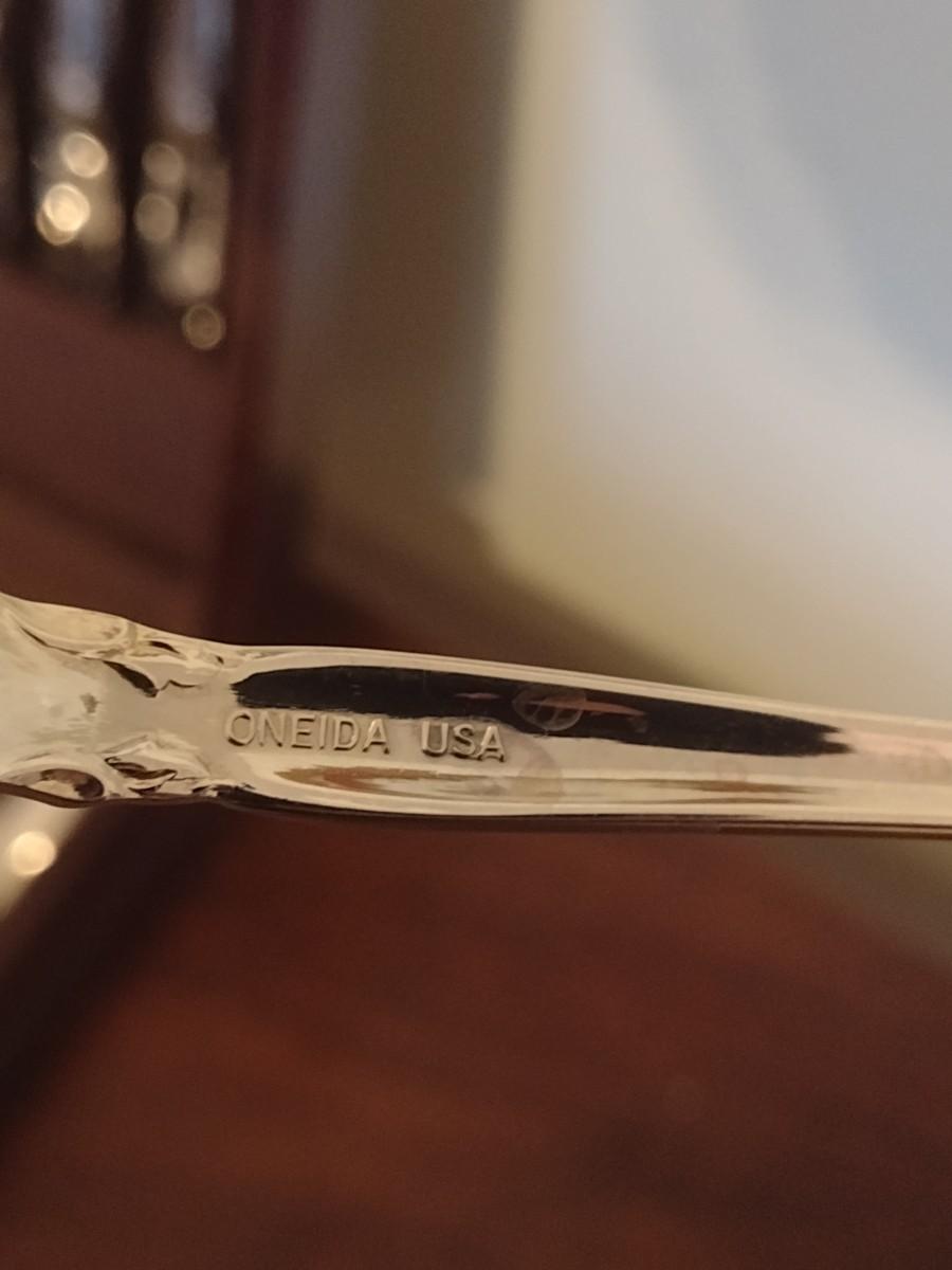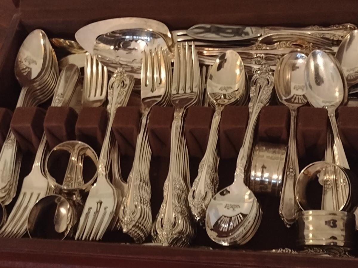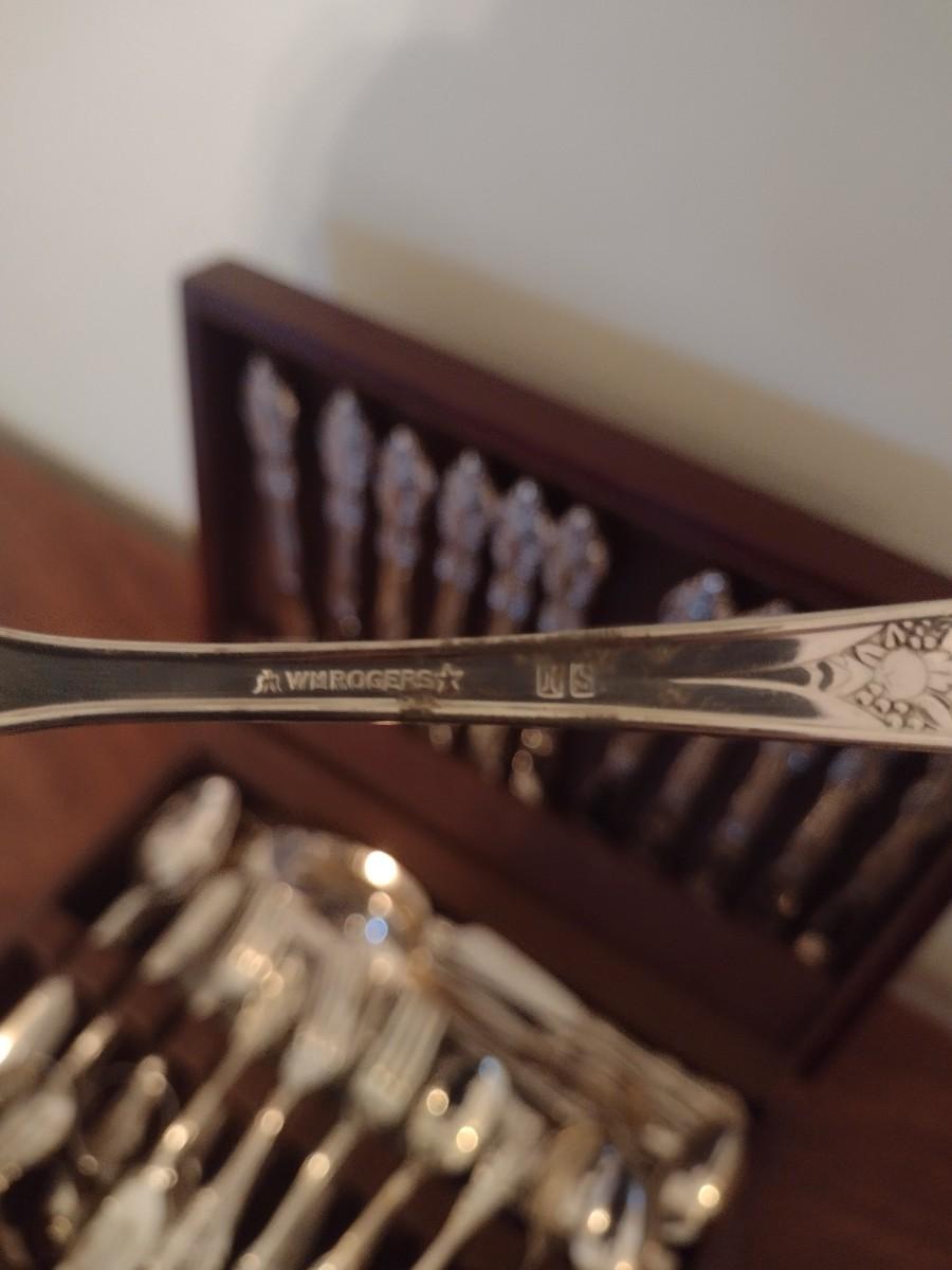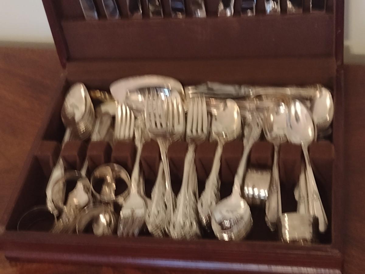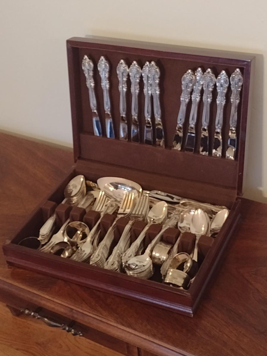 Mixed Set of Formal Stainless Flatware by Onieda and Wm. Rogers in Wood Storage Box