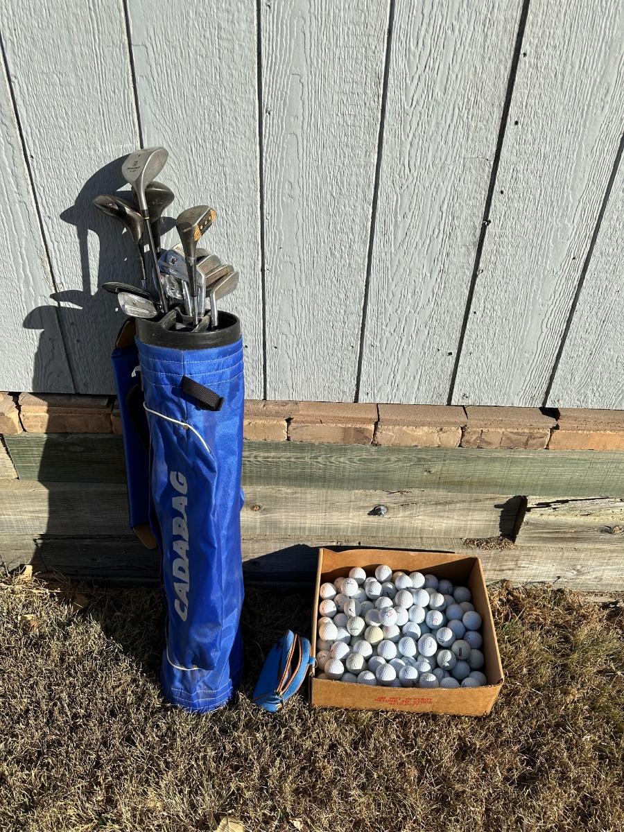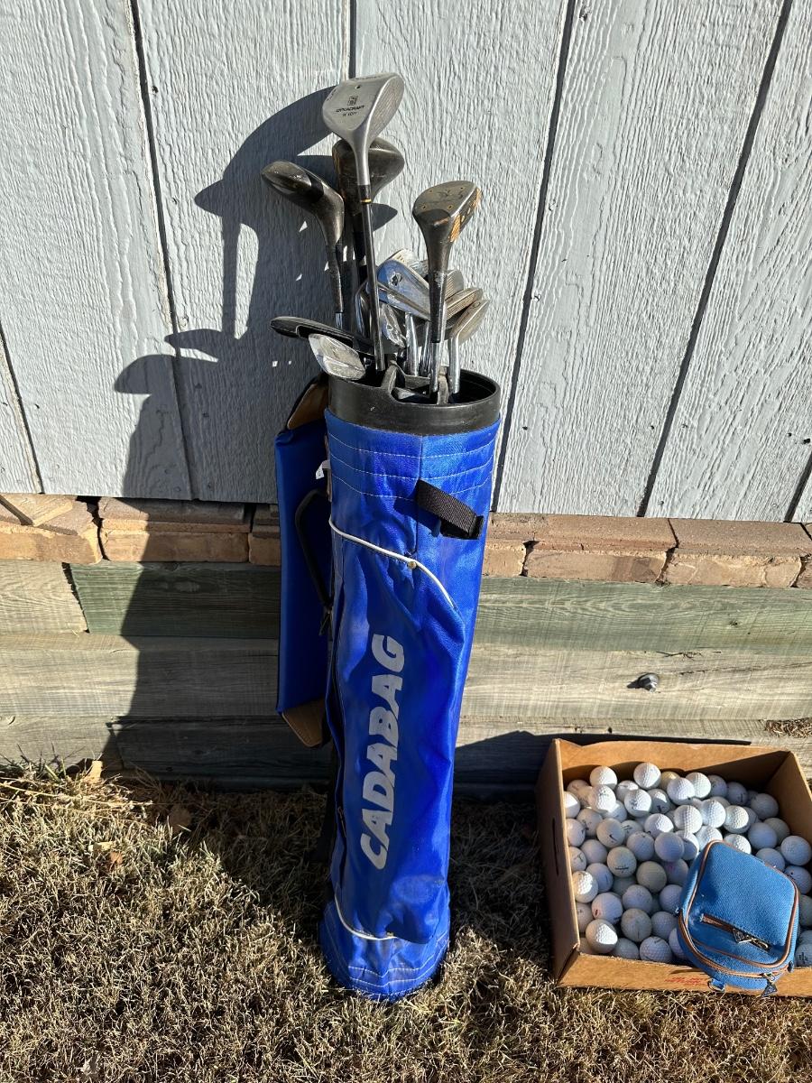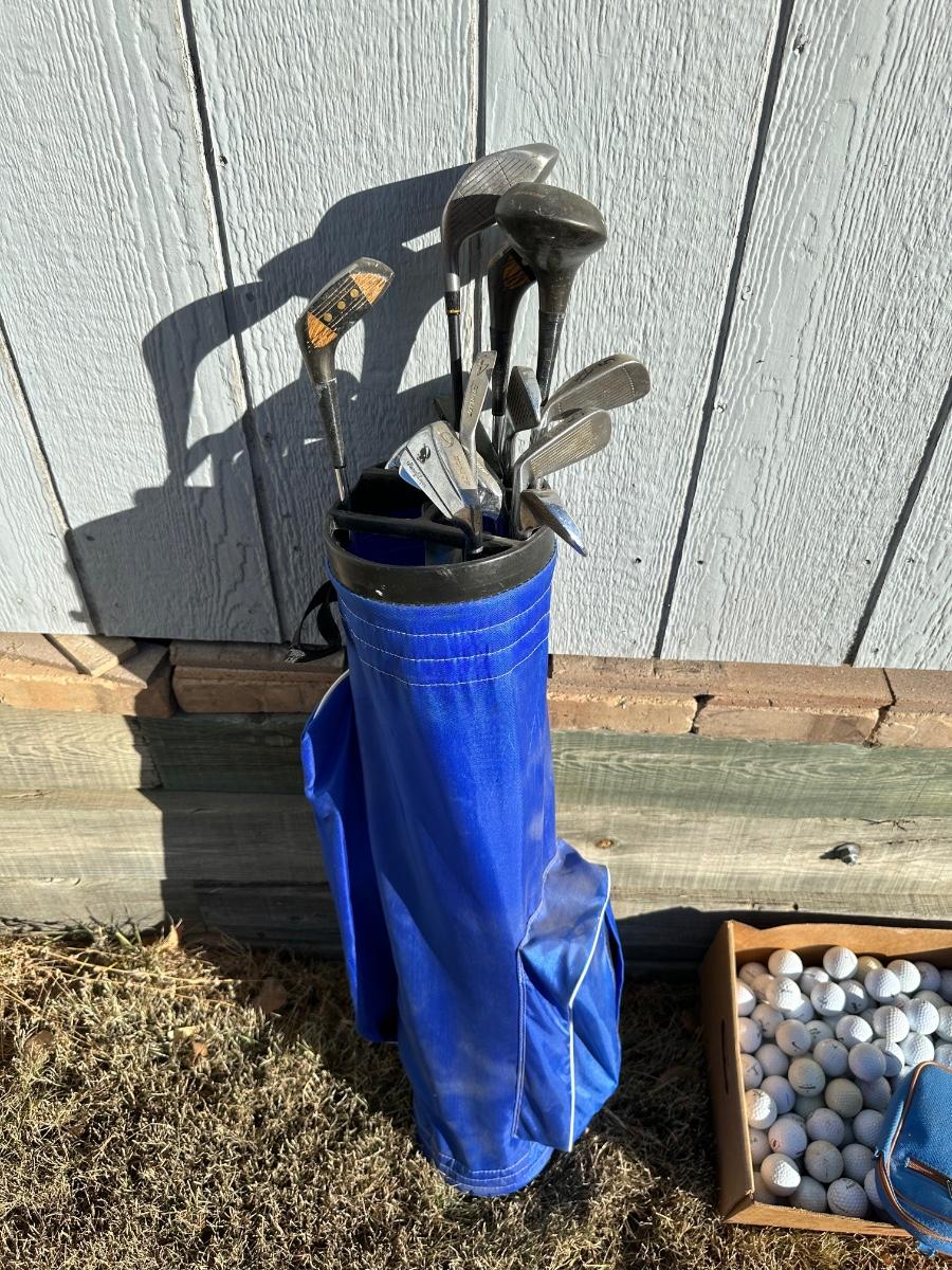 MIXED SET OF GOLF CLUBS, BAG AND MANY GOLF BALLS