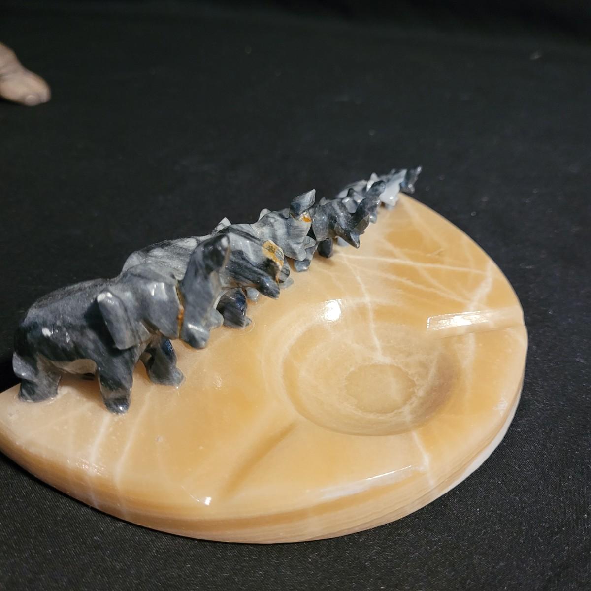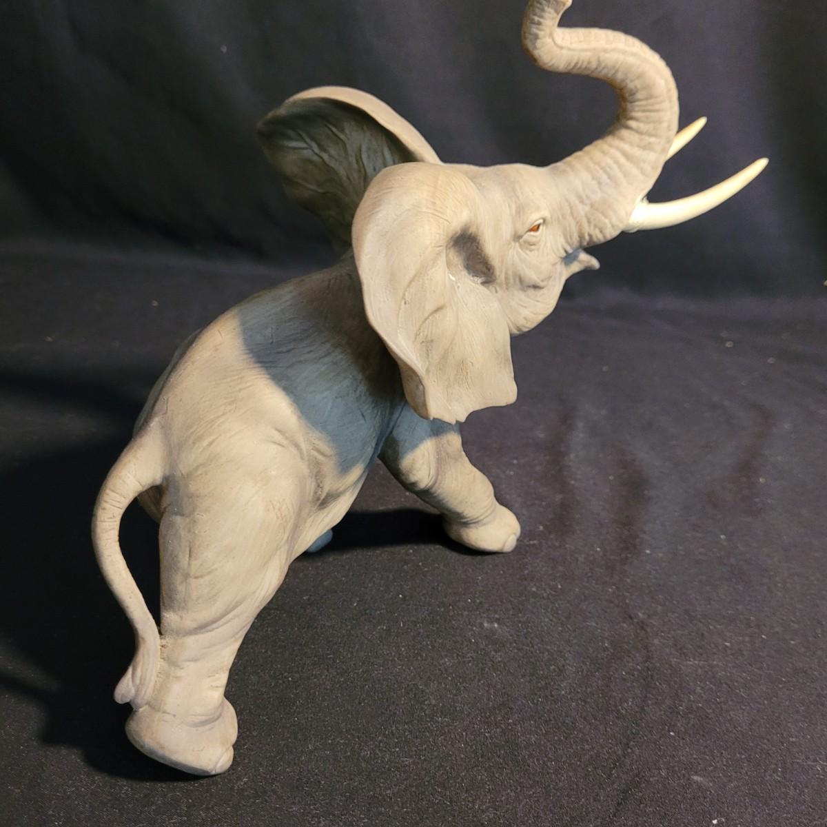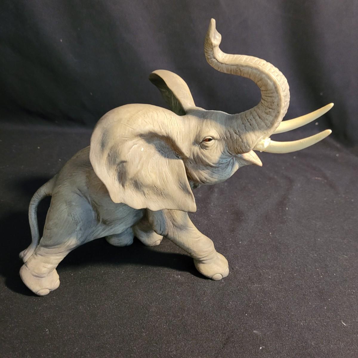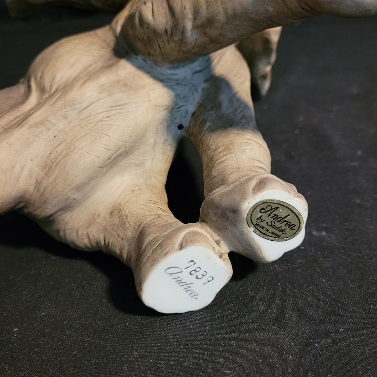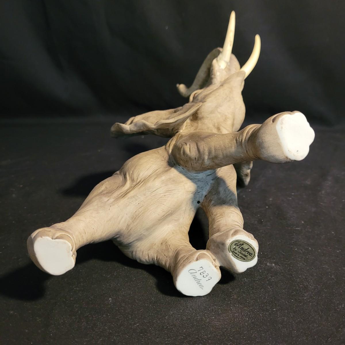 Large grey ceramic elephant made by Andrea by Sadek in Japan, number 7839. In fair condition, with tusk that broke at one point and was glued back on (see photo). Glass elephant may be crystal, can not verify. Good condition, with slight scratching on the bottom and a small scratch above the eye (see photos). Heavy for small size. Stone ashtray in fair condition, with one trunk broken off and trunk of largest elephant broken off at one point and glued back on. For reference, grey ceramic elephant measures approximately 10.5"H diagonally from back left foot to tip of trunk. Shipping available.