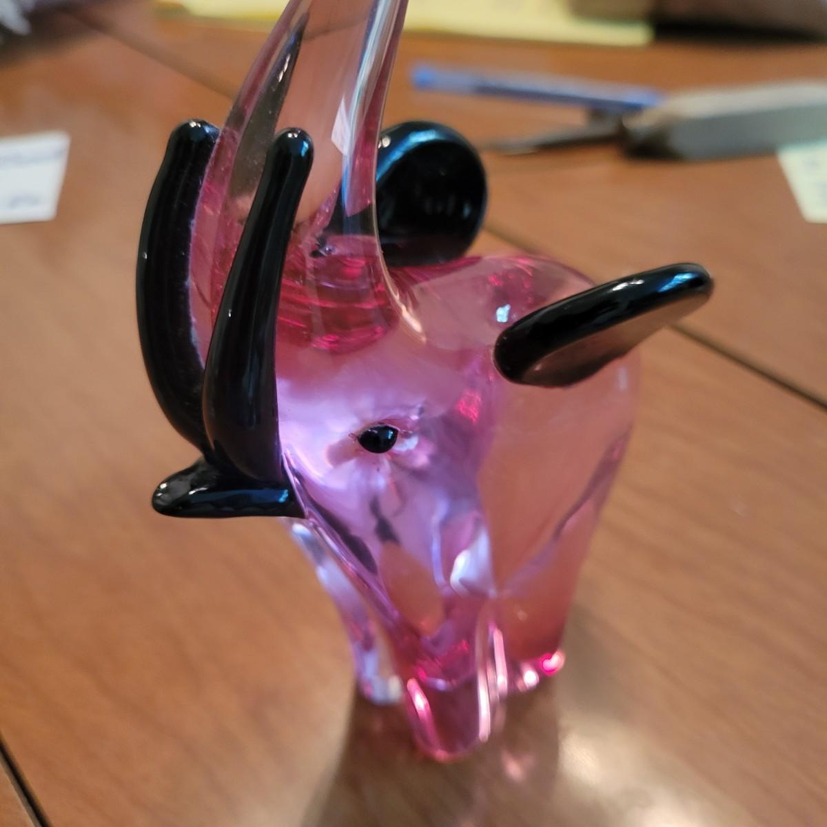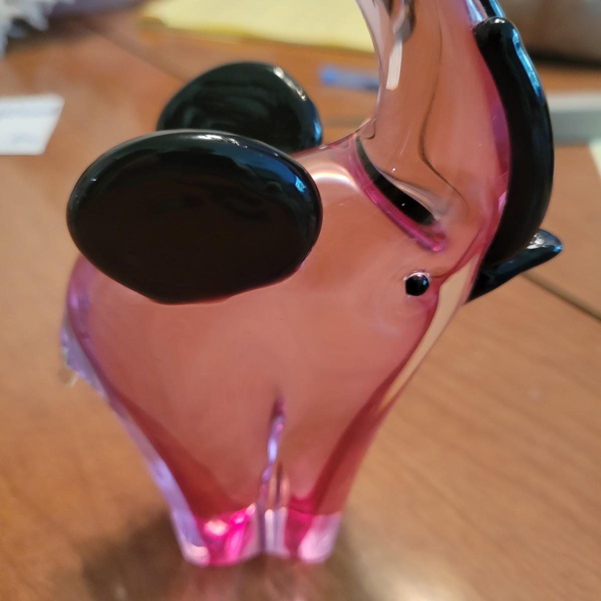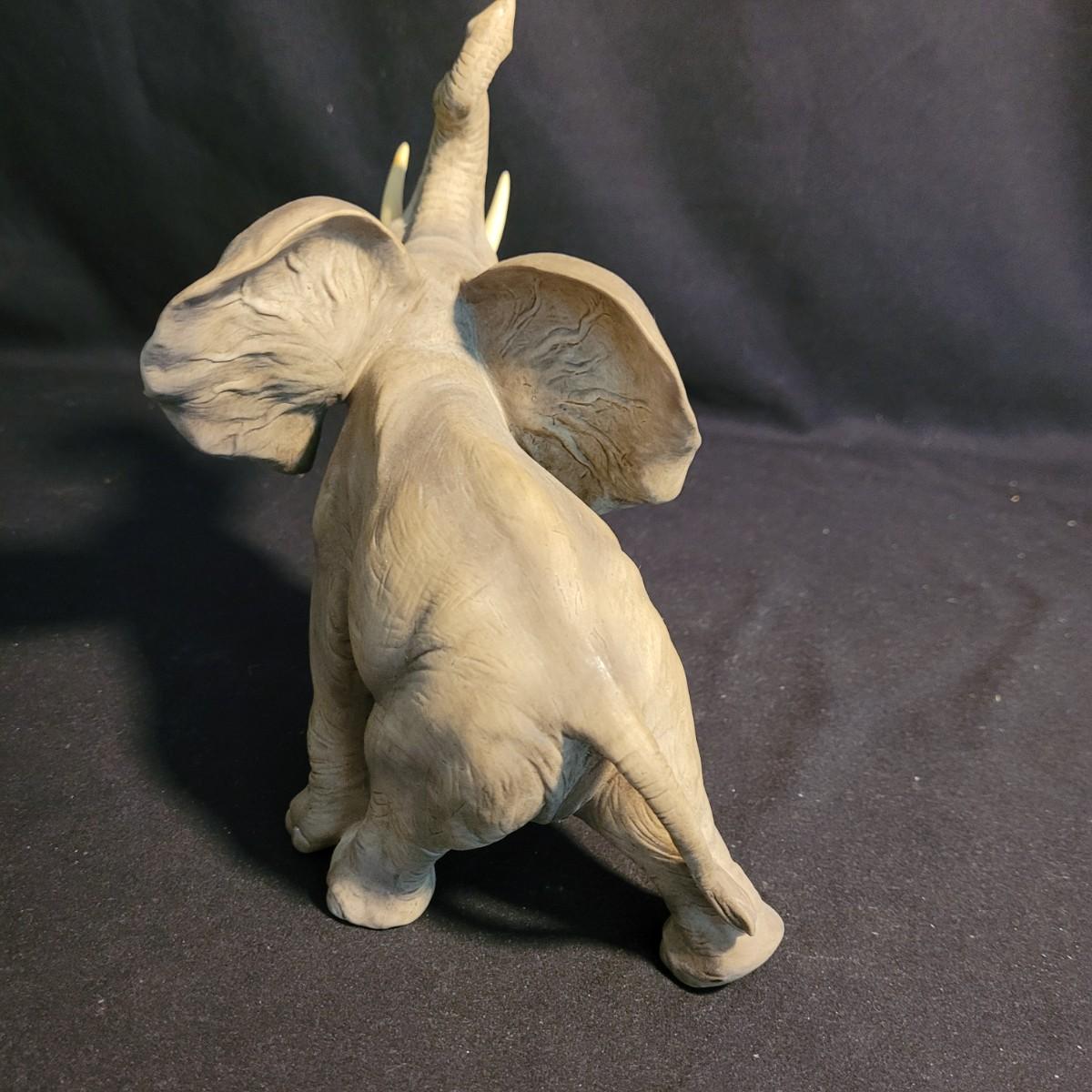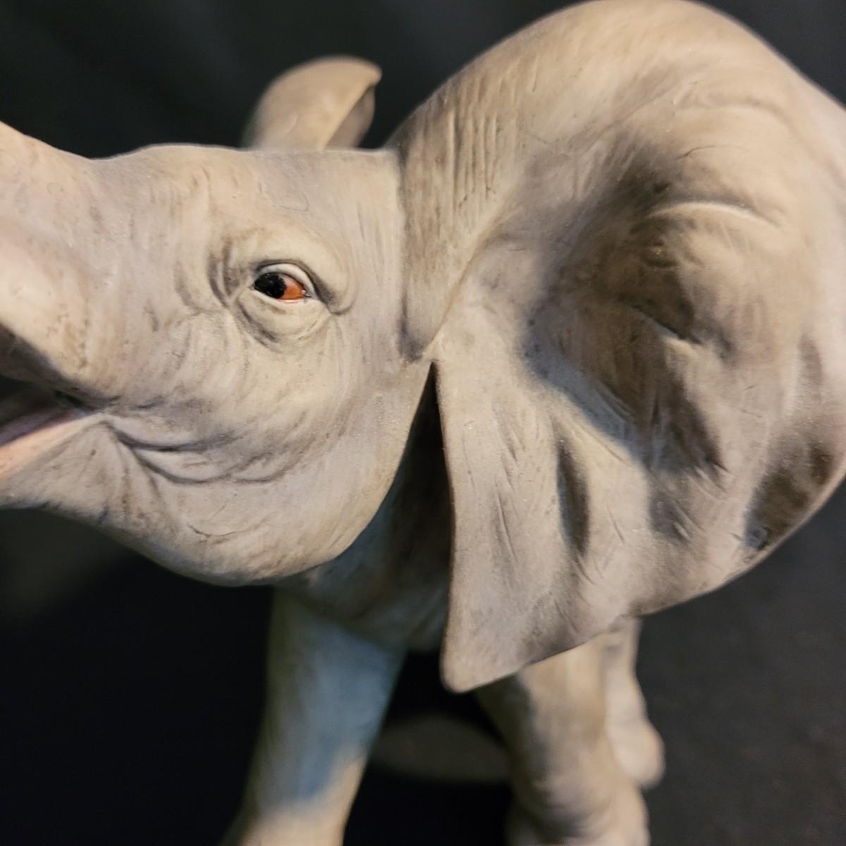 Large grey ceramic elephant made by Andrea by Sadek in Japan, number 7839. In fair condition, with tusk that broke at one point and was glued back on (see photo). Glass elephant may be crystal, can not verify. Good condition, with slight scratching on the bottom and a small scratch above the eye (see photos). Heavy for small size. Stone ashtray in fair condition, with one trunk broken off and trunk of largest elephant broken off at one point and glued back on. For reference, grey ceramic elephant measures approximately 10.5"H diagonally from back left foot to tip of trunk. Shipping available.