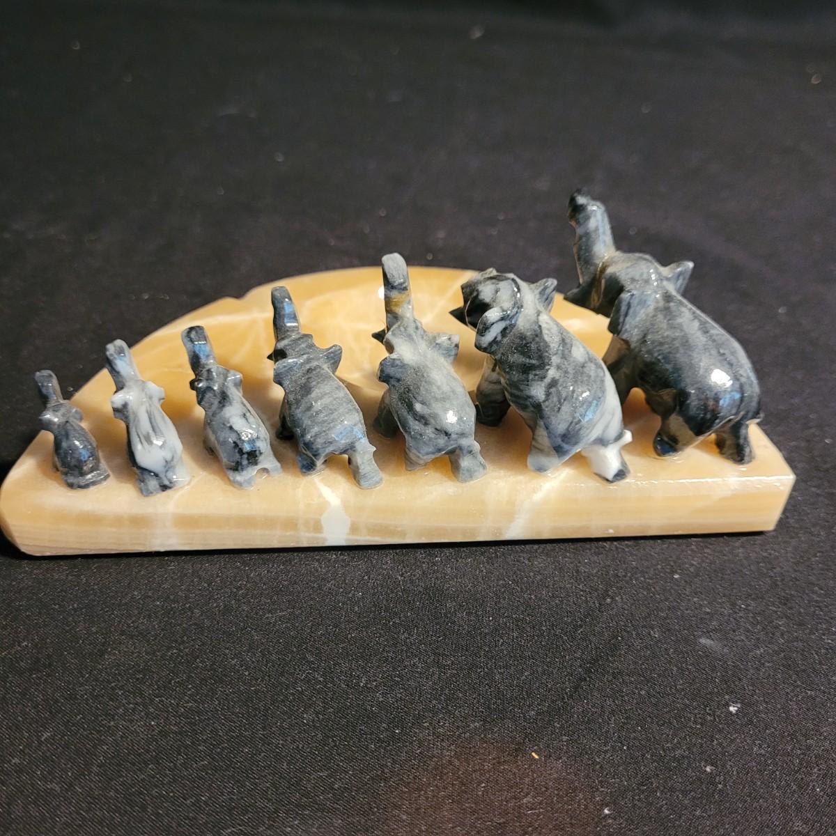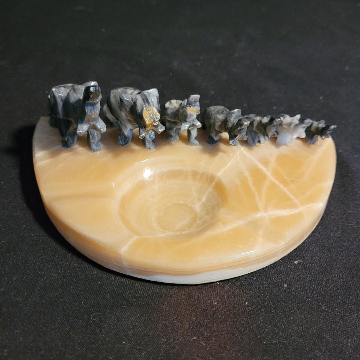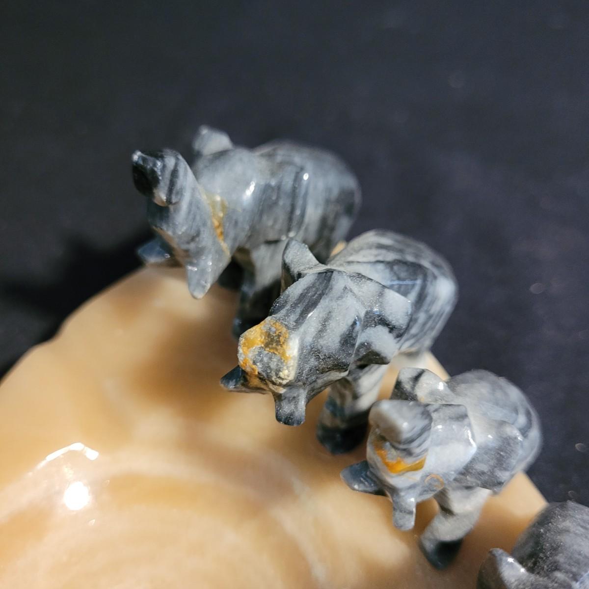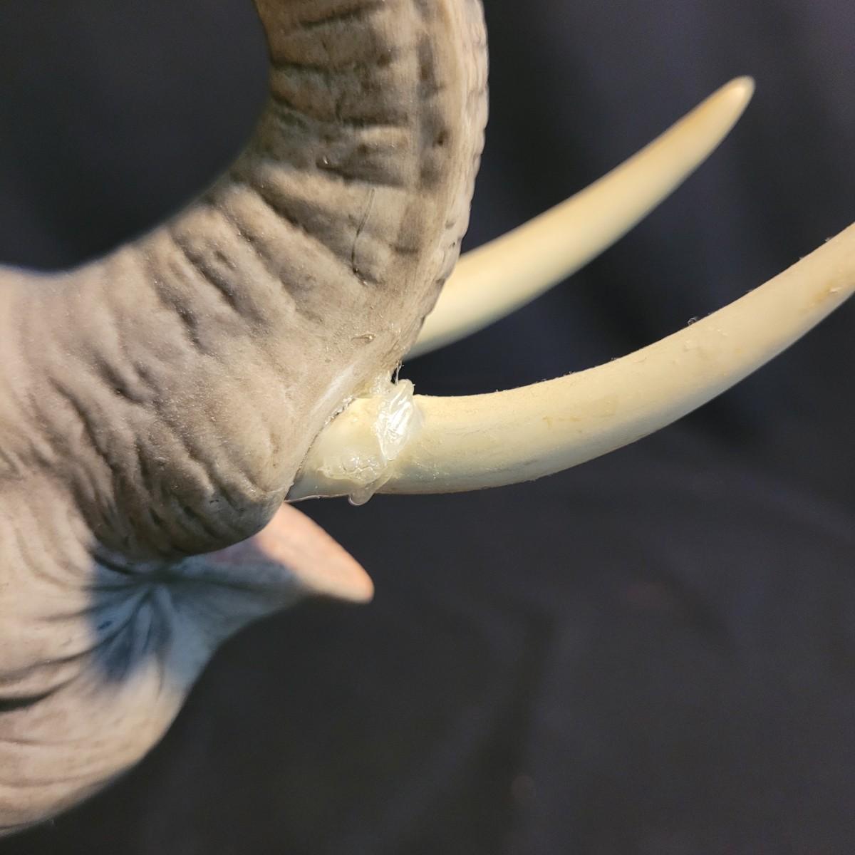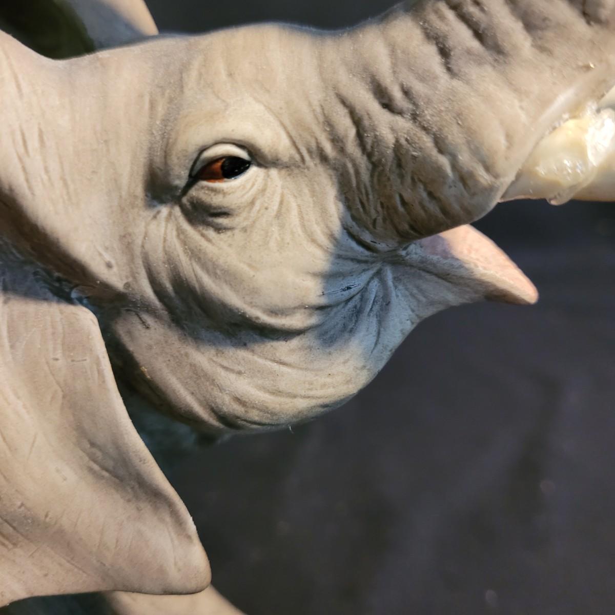 Large grey ceramic elephant made by Andrea by Sadek in Japan, number 7839. In fair condition, with tusk that broke at one point and was glued back on (see photo). Glass elephant may be crystal, can not verify. Good condition, with slight scratching on the bottom and a small scratch above the eye (see photos). Heavy for small size. Stone ashtray in fair condition, with one trunk broken off and trunk of largest elephant broken off at one point and glued back on. For reference, grey ceramic elephant measures approximately 10.5"H diagonally from back left foot to tip of trunk. Shipping available.