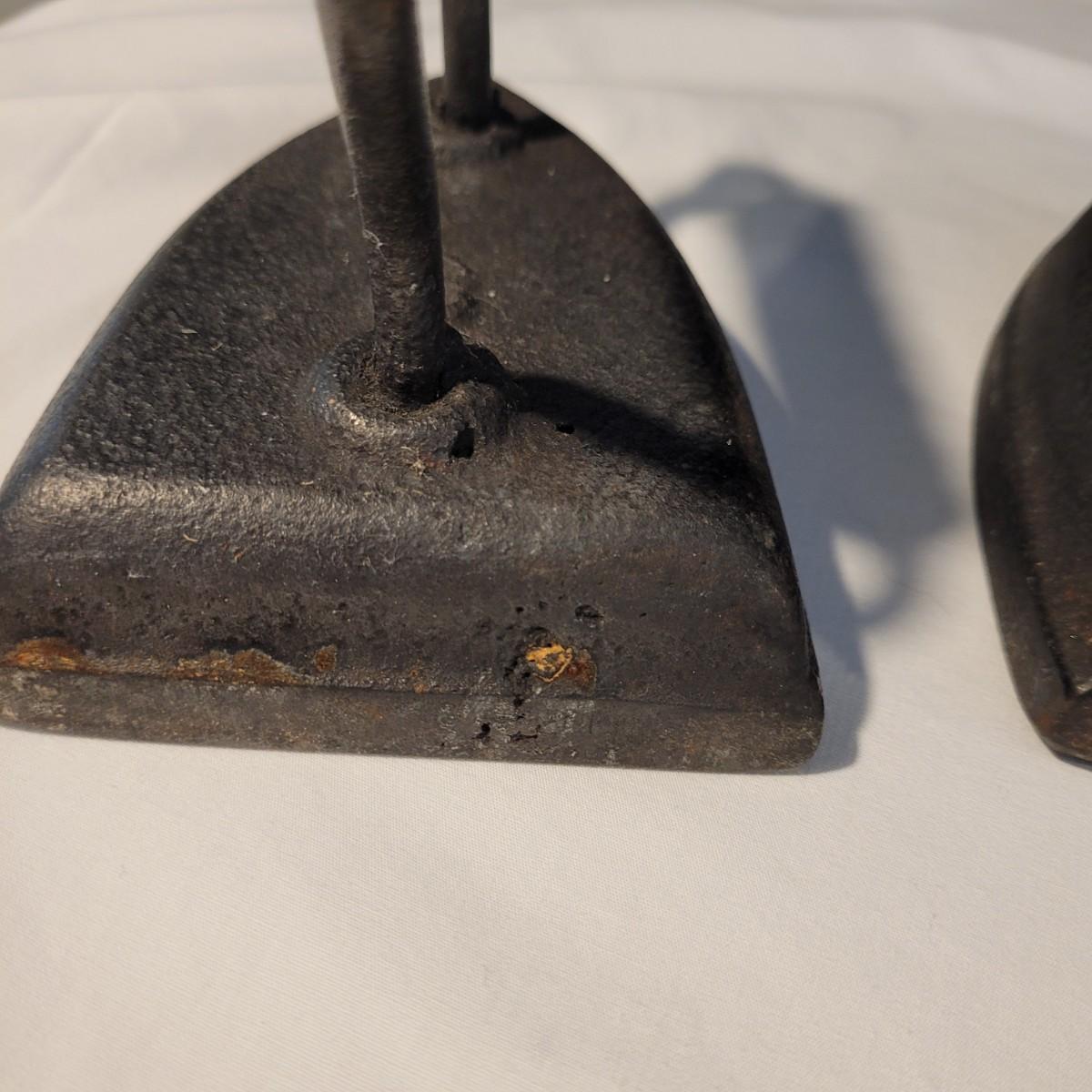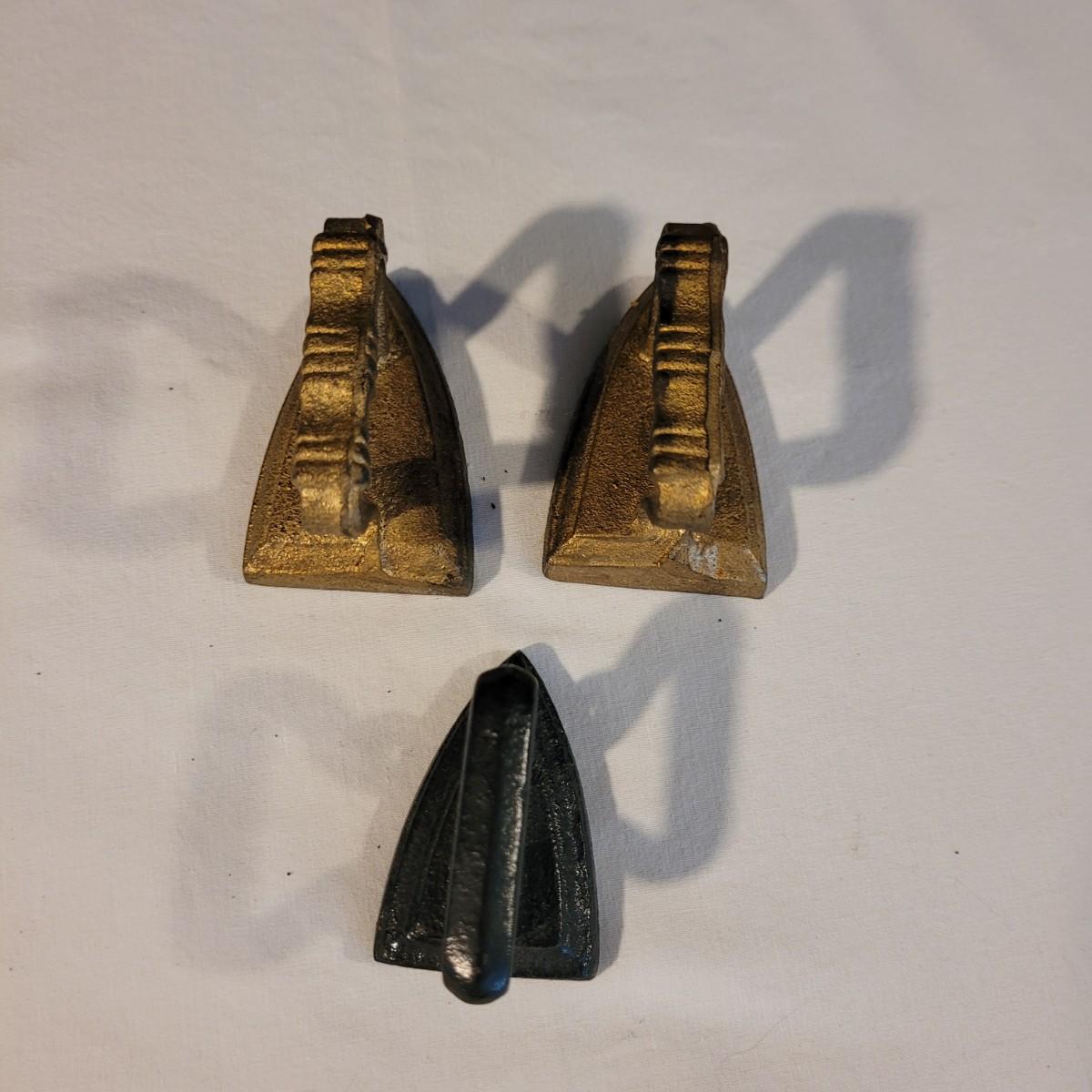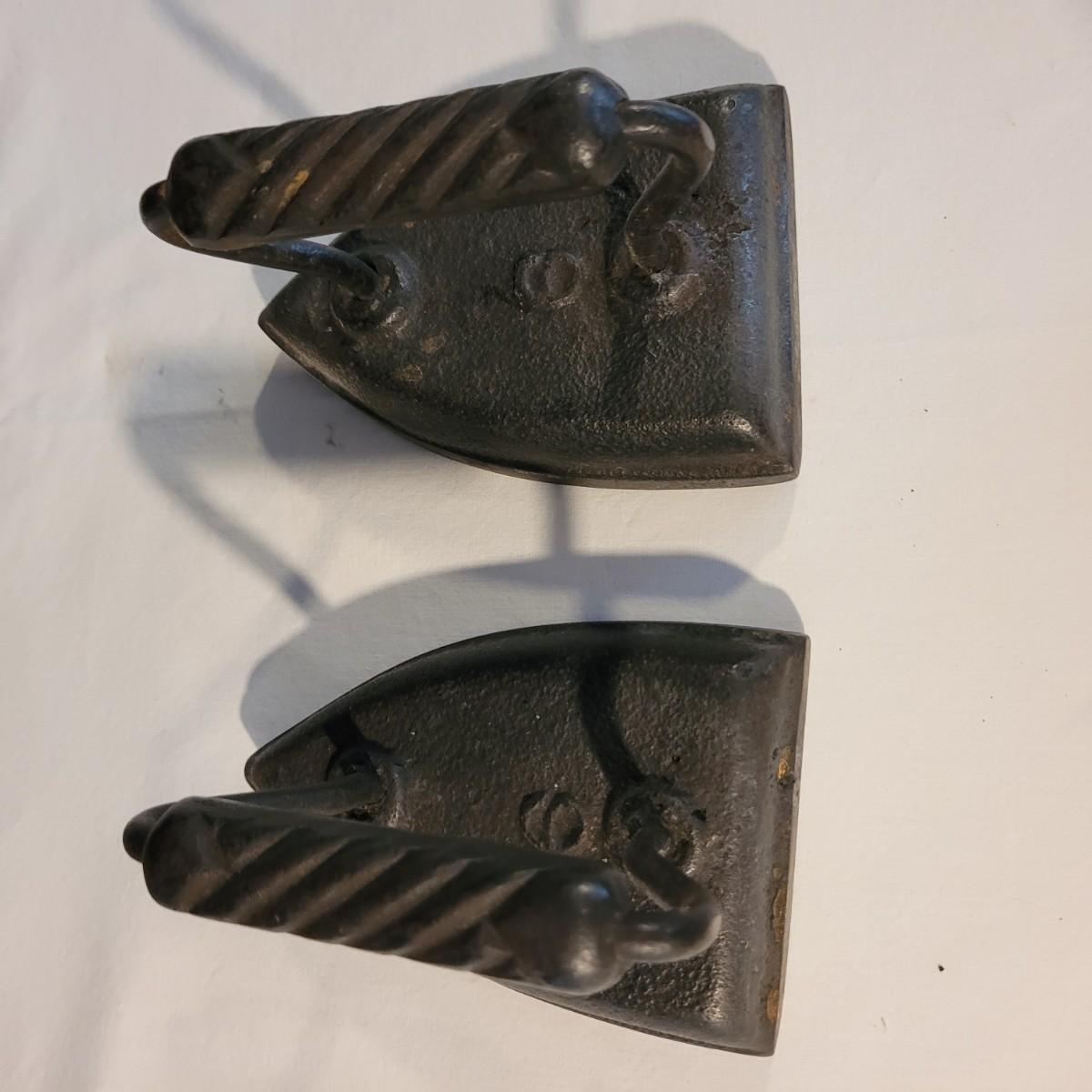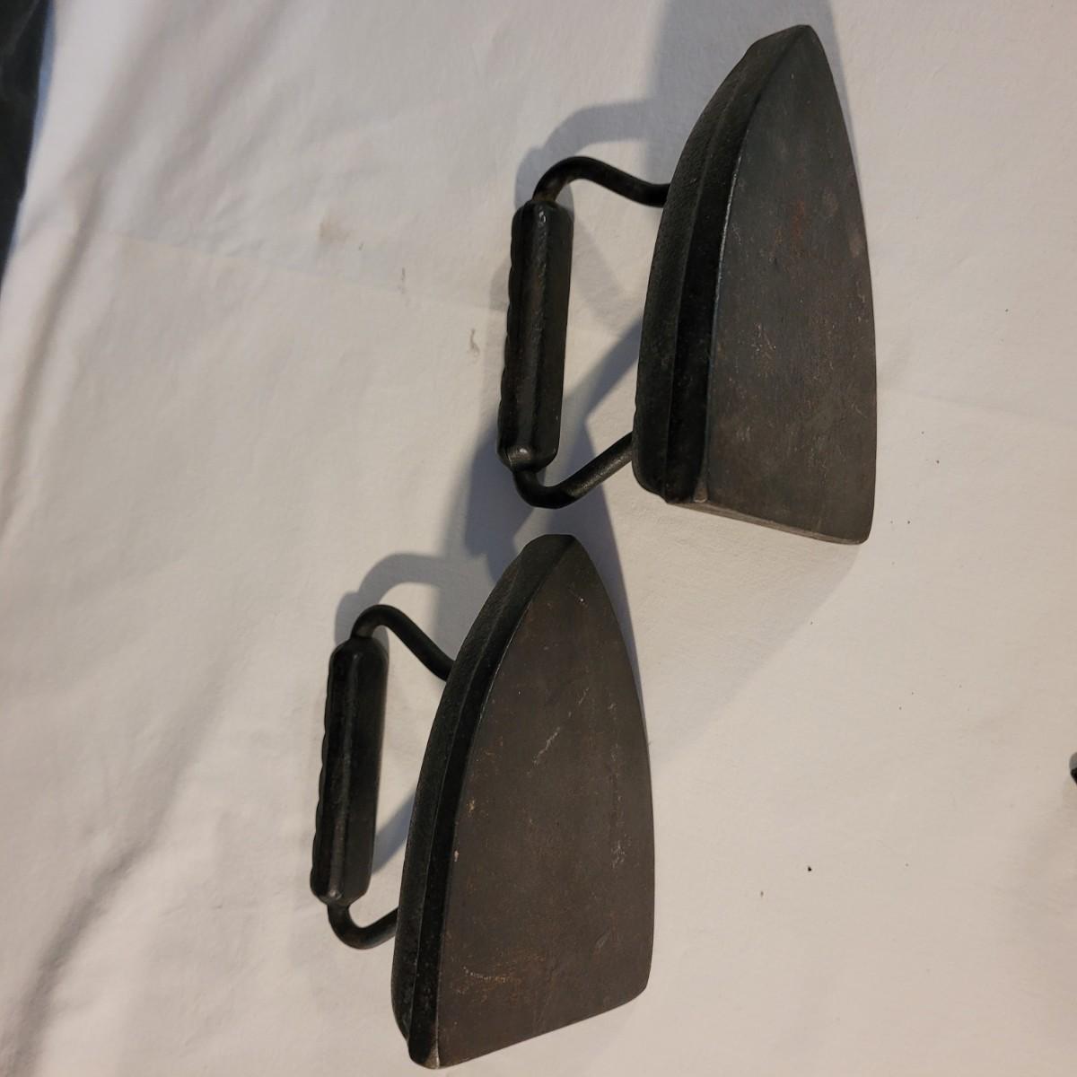Mixed set of large and small cast iron flat irons. Very slight rusting (see photos). Large iron measures approximately 4.5"L x5.5"H. Shipping available.