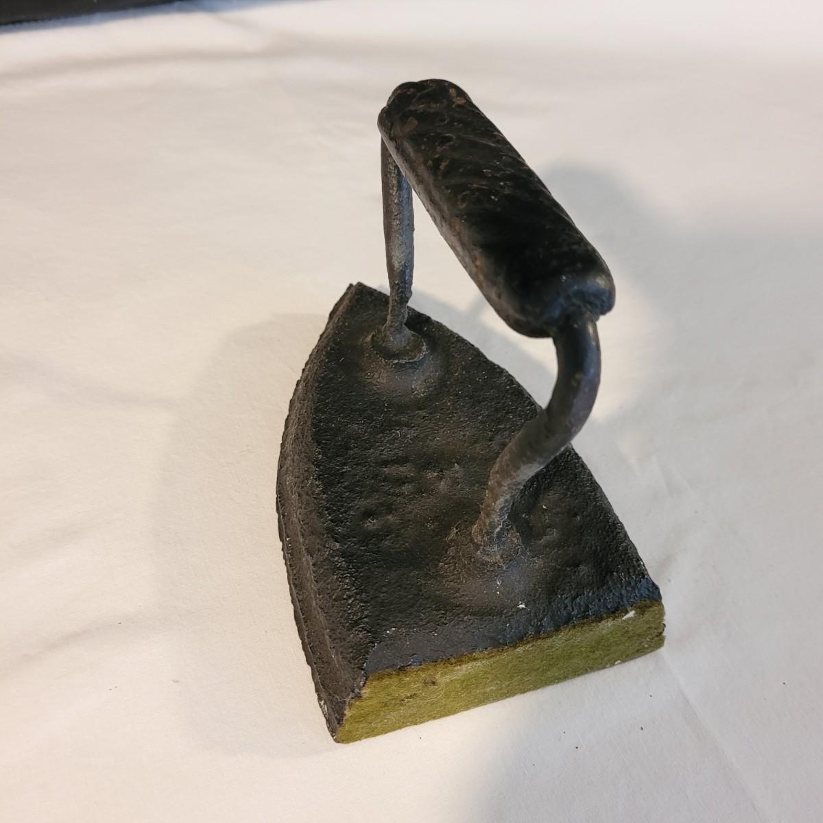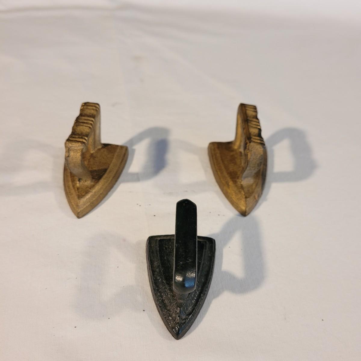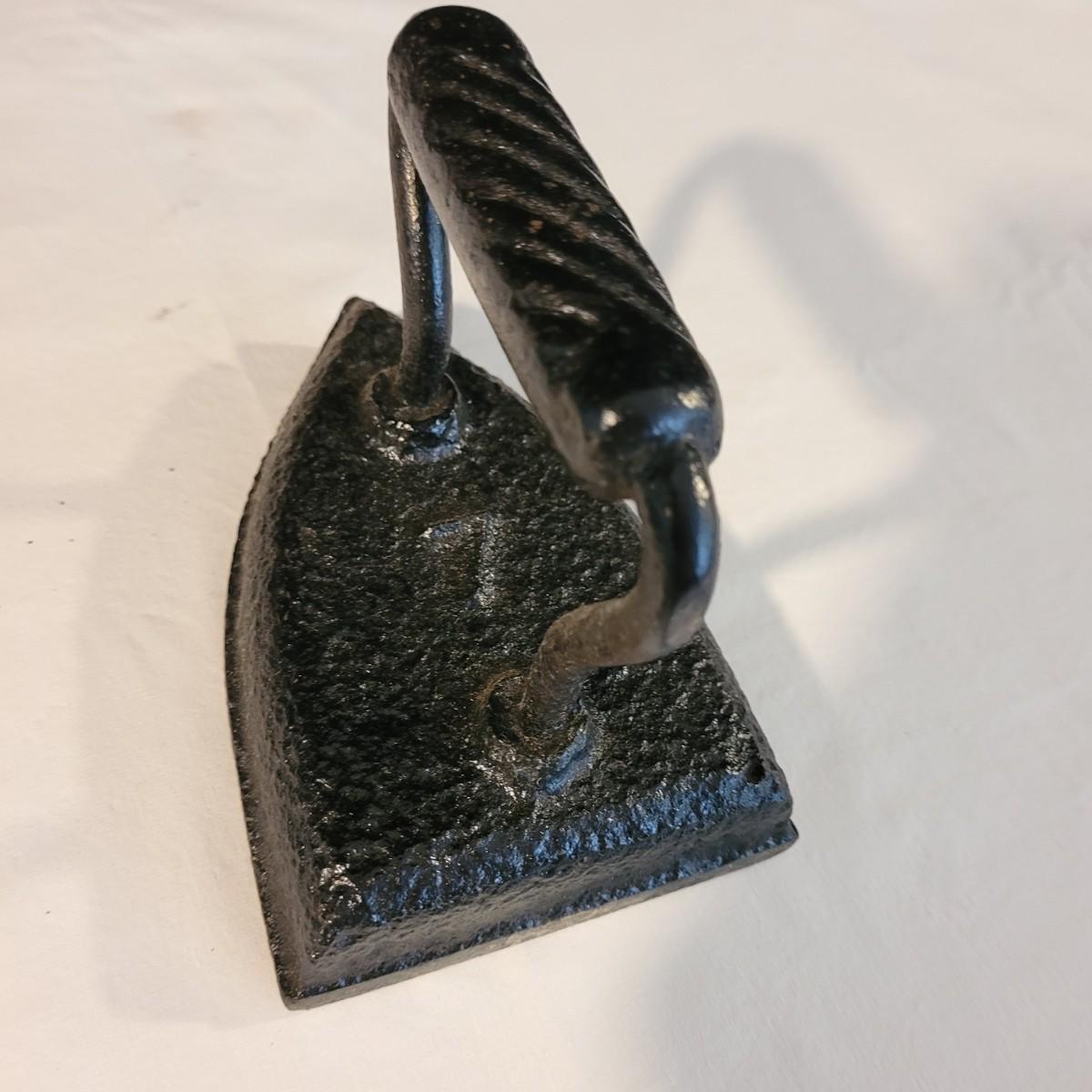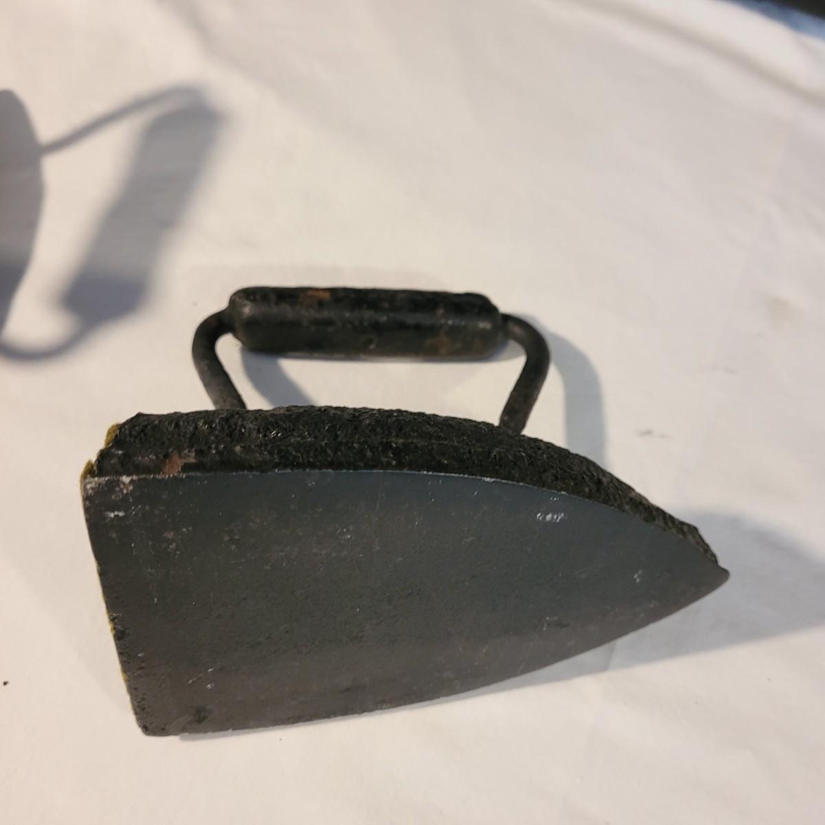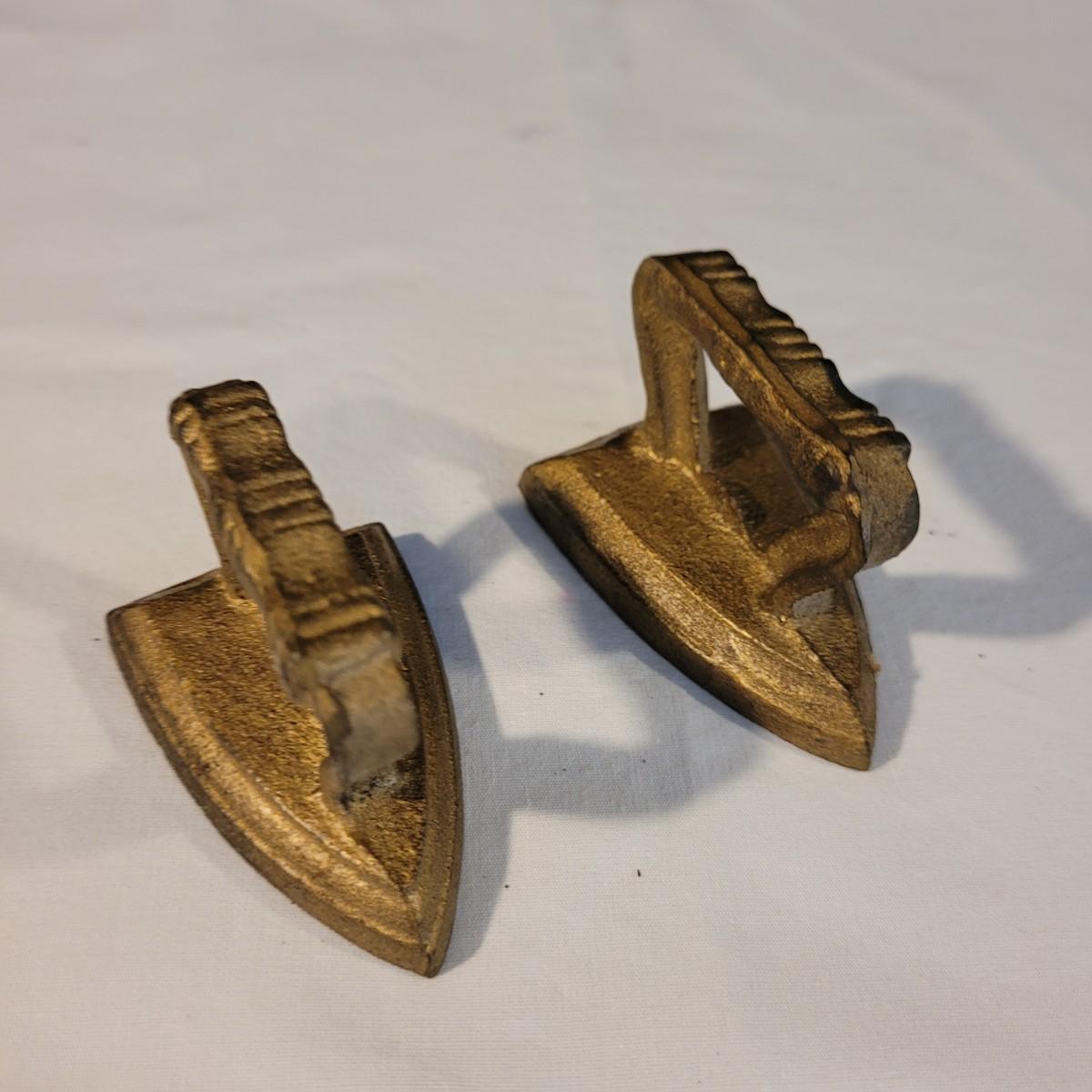 Mixed set of large and small cast iron flat irons. Very slight rusting (see photos). Large iron measures approximately 4.5"L x5.5"H. Shipping available.
