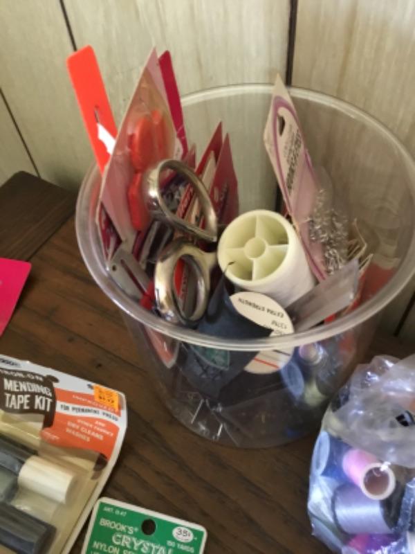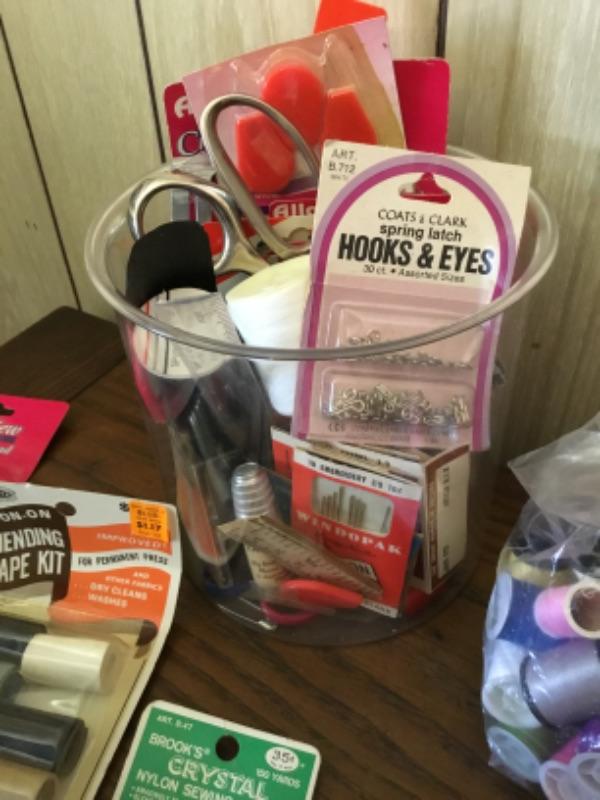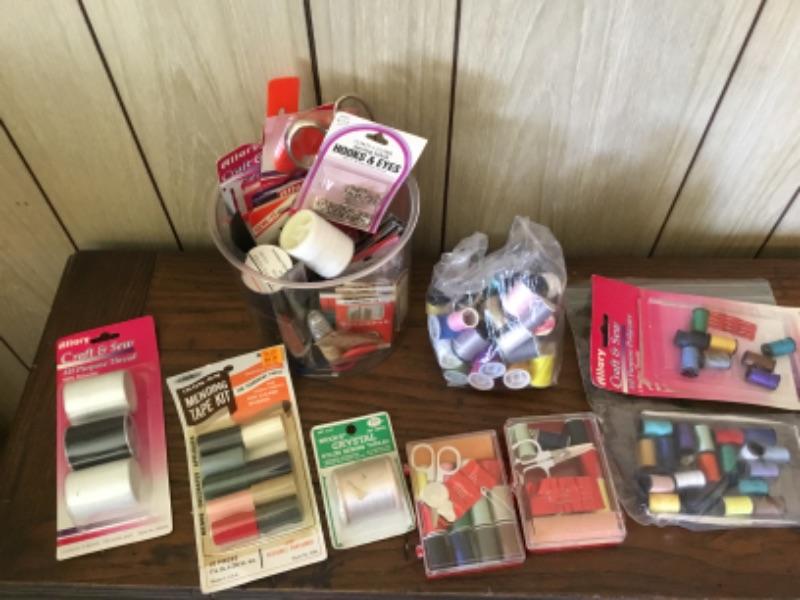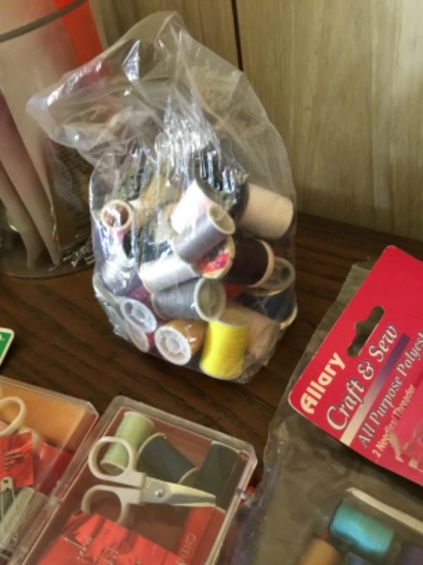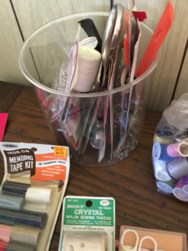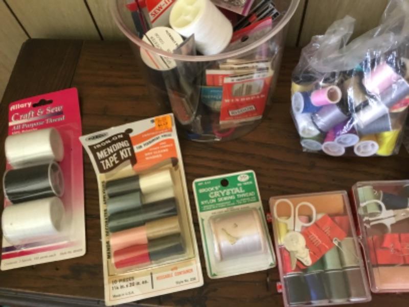 Nice mixed lot of sewing notions. Thread, pins, thimbles, scissors and more. Everything pictured is included.