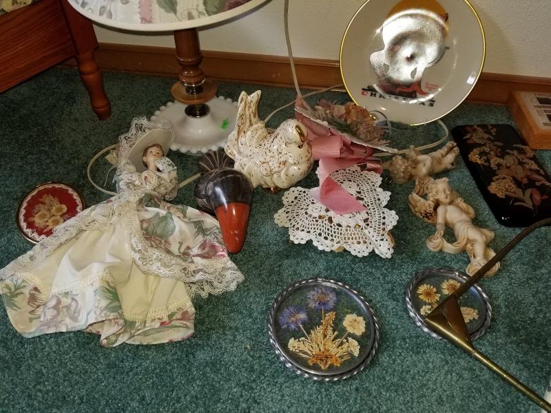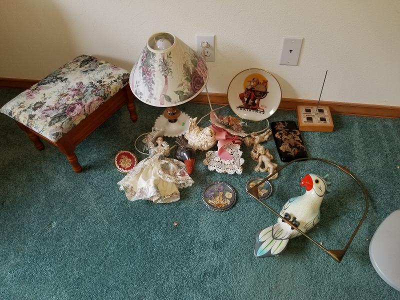 Mixed lot of vintage décor and shabby chic items. You get all items shown in the picture. Parrot has a little damage on the top of his feather on head. The stool opens for storage.