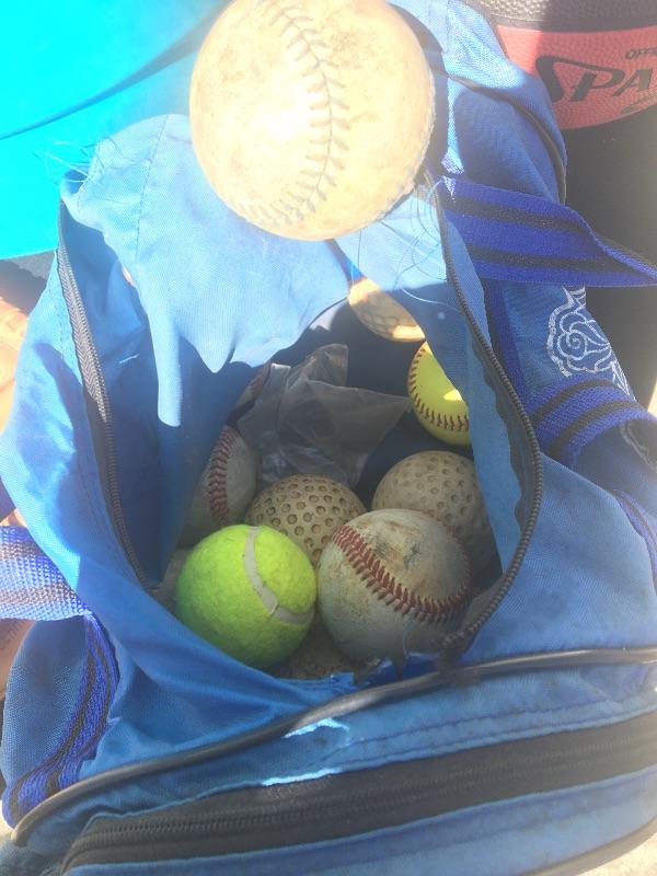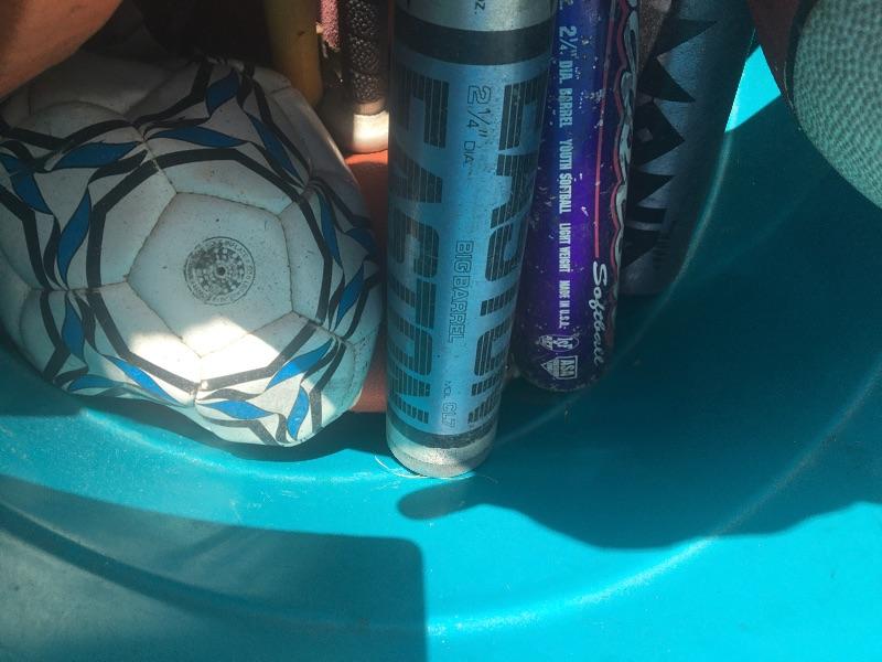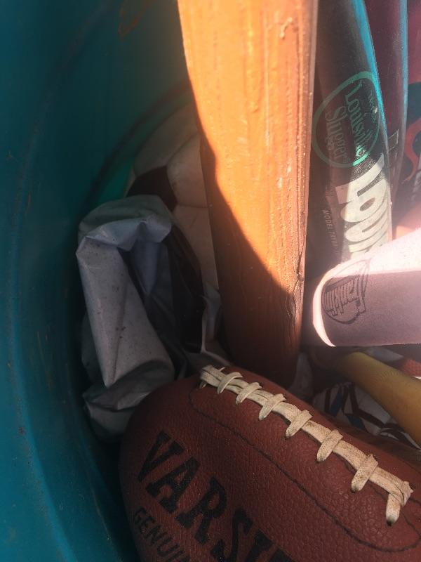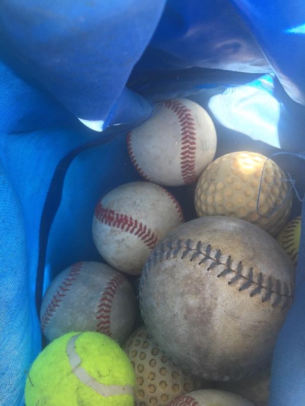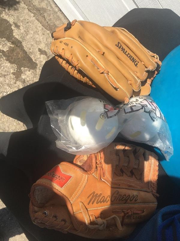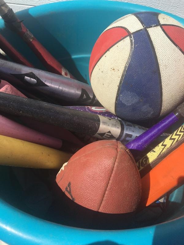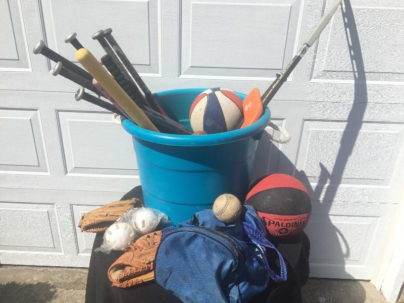 Mixed sports equipment lot with bats, balls and gloves