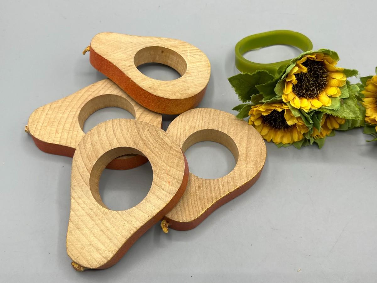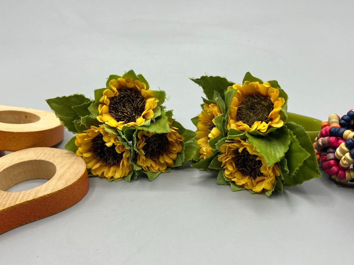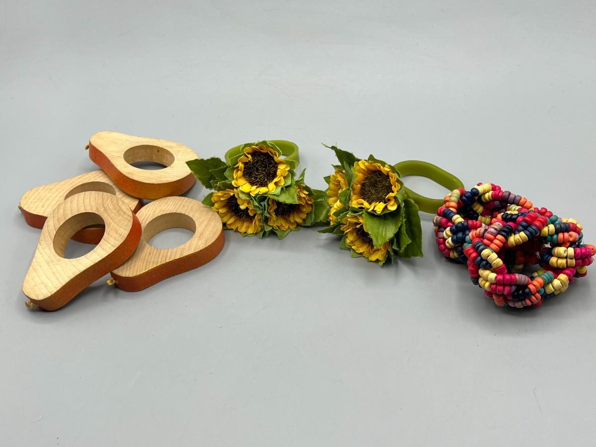 Mixed Style Lot of Decorative Napkin Holder Rings Pears Flowers Beads. Good previously used condition. 4 pear, 2 sunflower, and 2 beaded.
