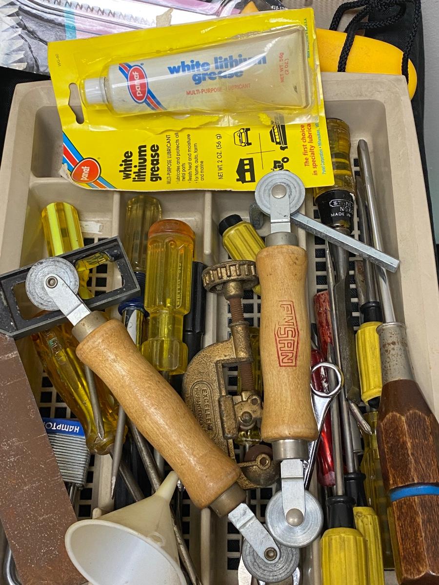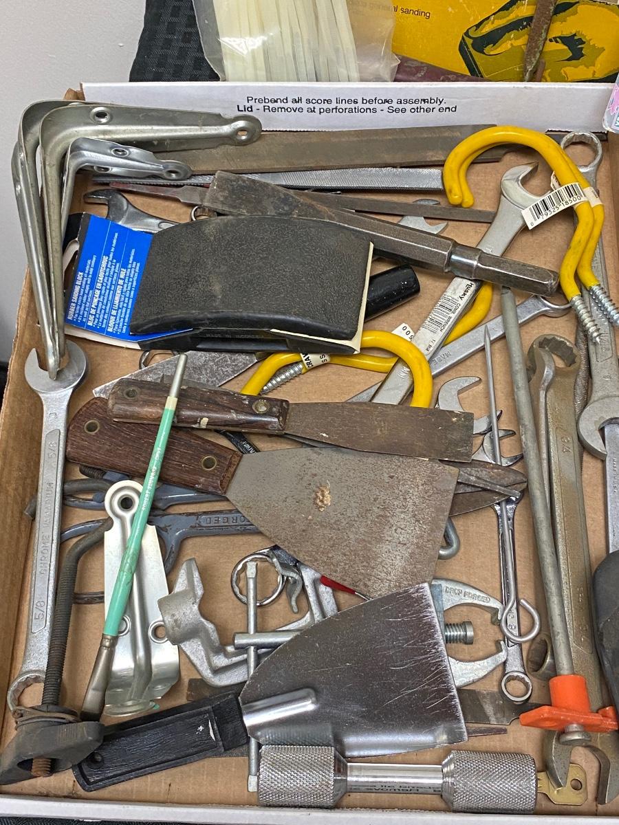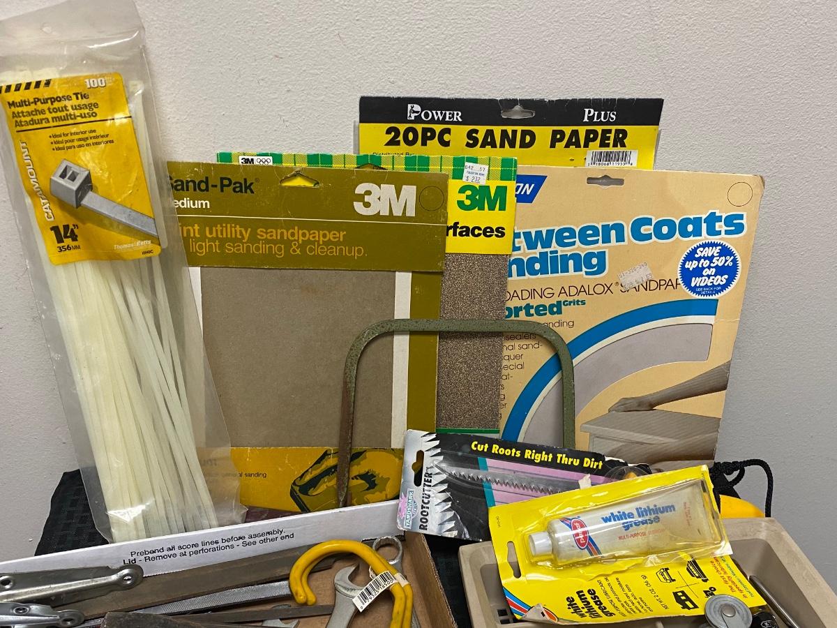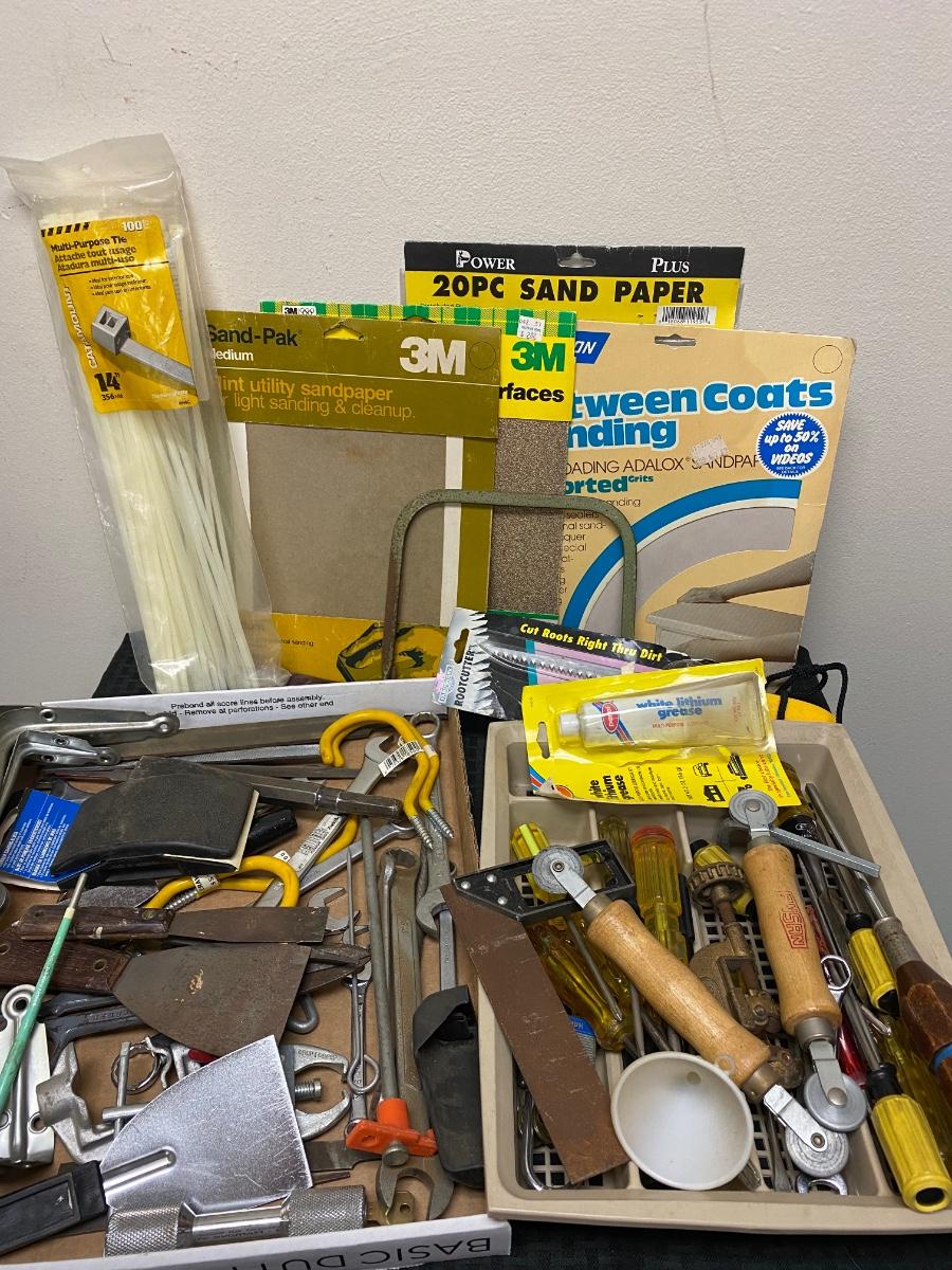 Mixed lot of various tools and household hardware items. Wrenches, screwdrivers, and other various hand tools mixed with sandpaper, hooks, and other hardware. See photos.