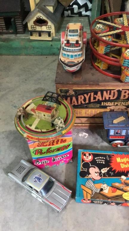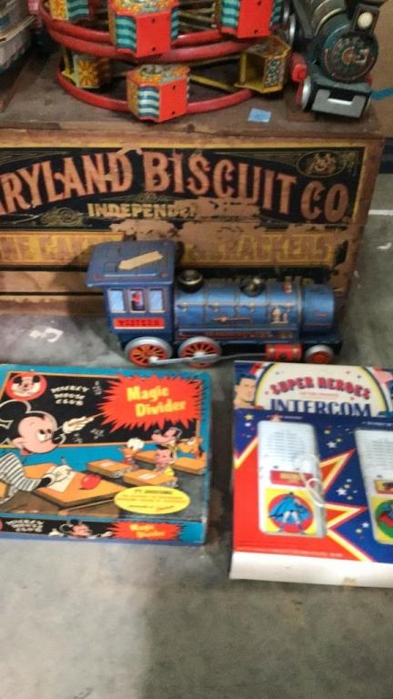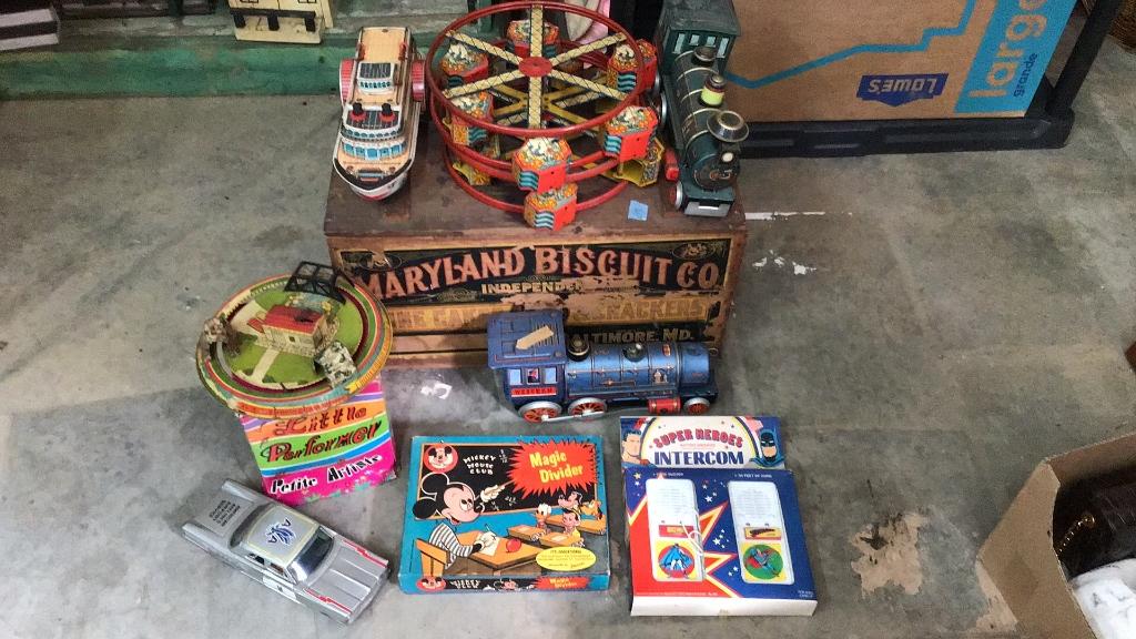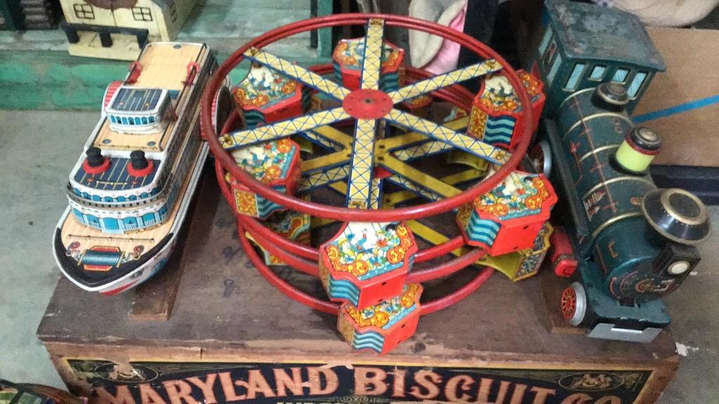 3 battery operated tin toys - 2 trains, 1 steamboat..2 Ferris wheels only (no stands)..American Airlines support vehicle..intercom set..little performer doll..Maryland Biscuit Co crate.