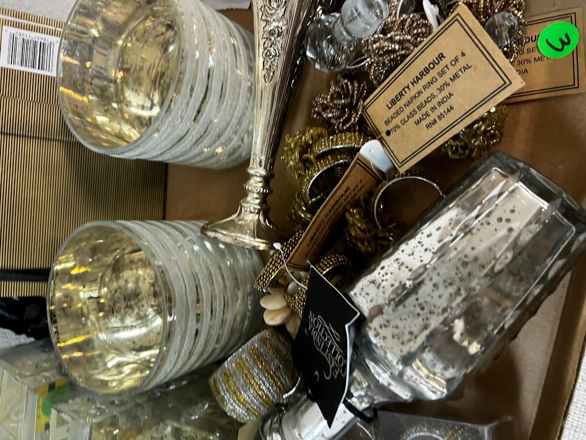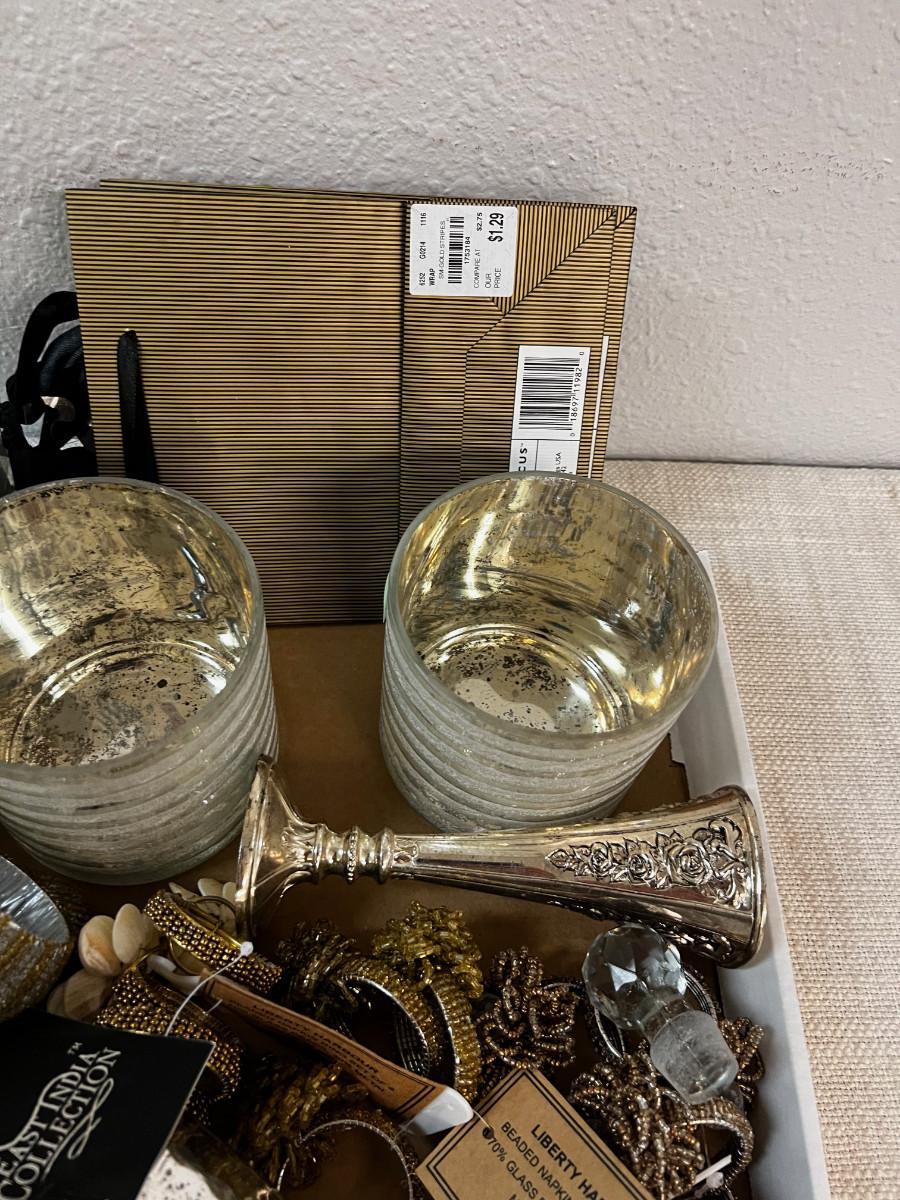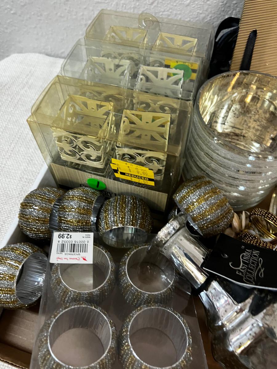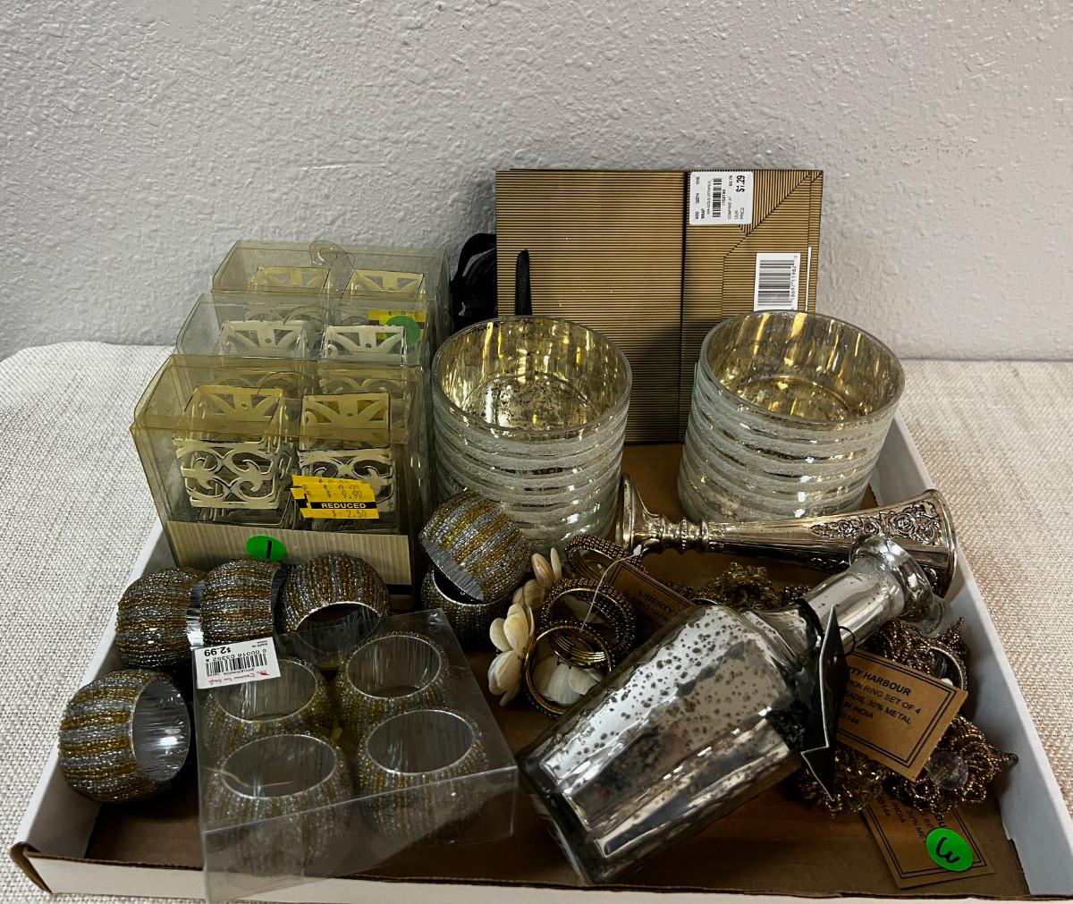 Mixed Tray of Napkin Rings Votive Holder Jar Etc. Goldish Color