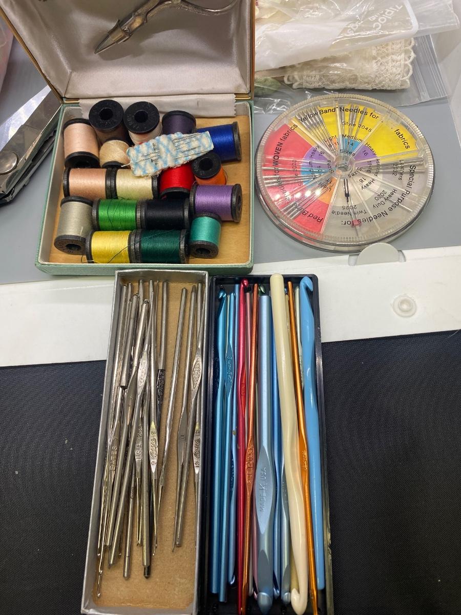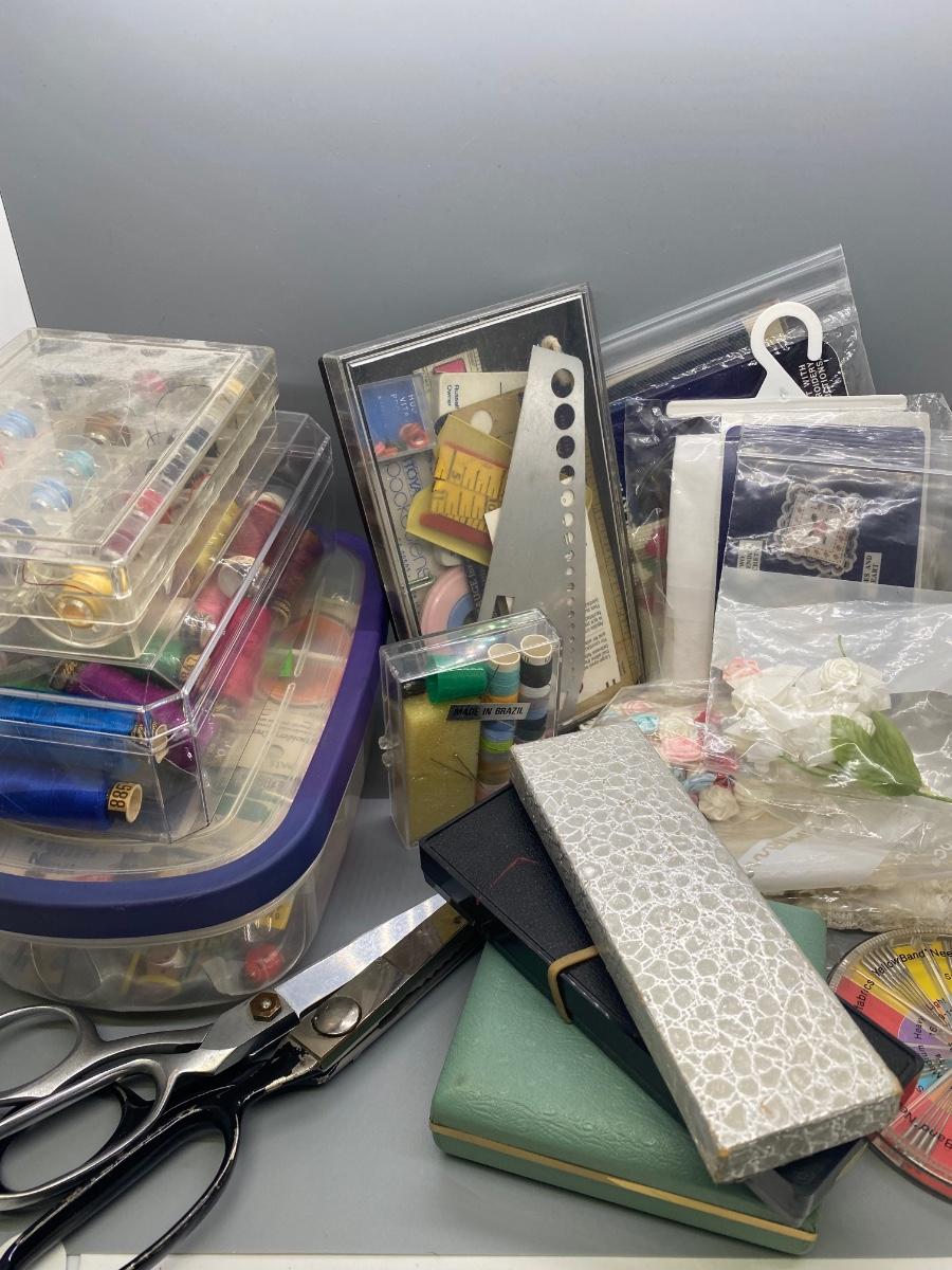 Mixed variety of sewing notions and supplies. Everything and then some to fill a sewing basket. Thread, buttons, scissors, pins, and more. See photos.