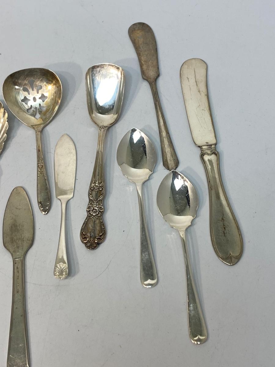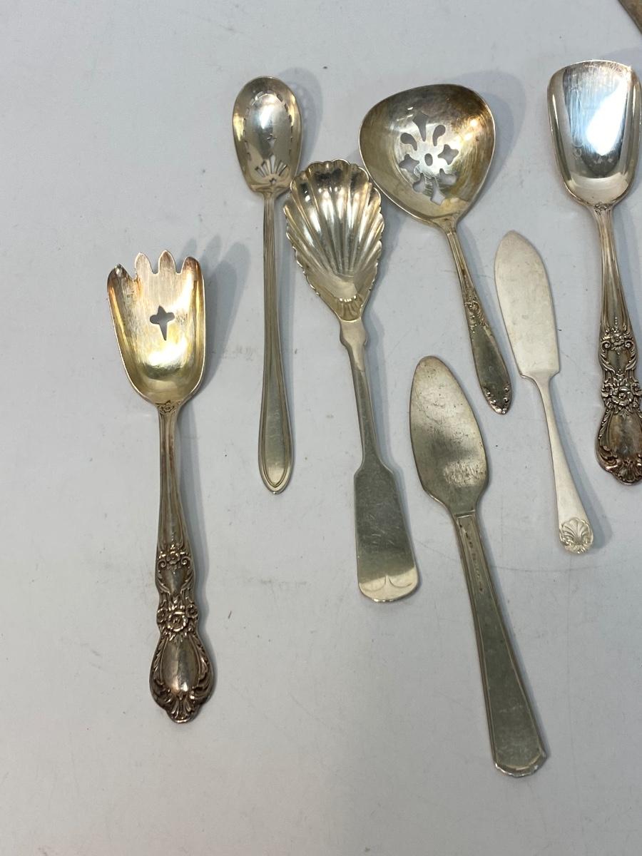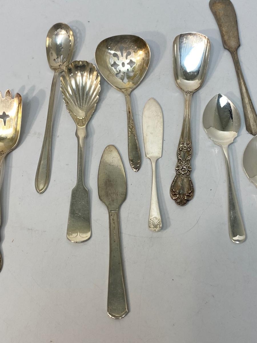 Mixed Vintage Lot of Small Size Hostess Serving Flatware Utensils. Various pieces and patterns. Butter knives, jelly spoons, sugar spoons, etc. No sterling pieces.