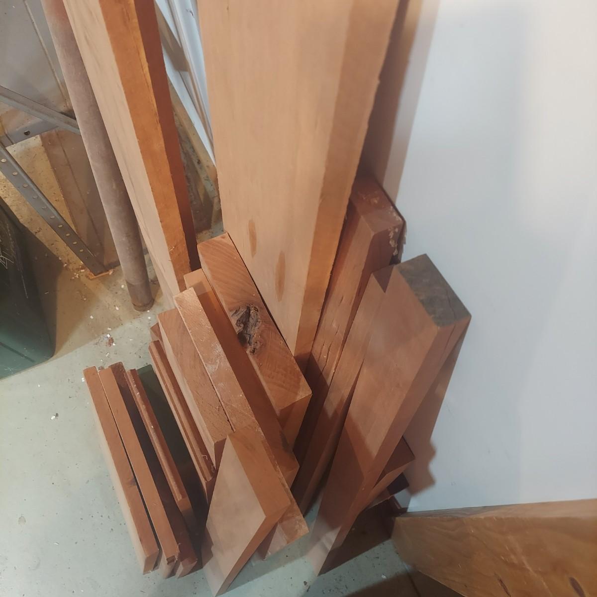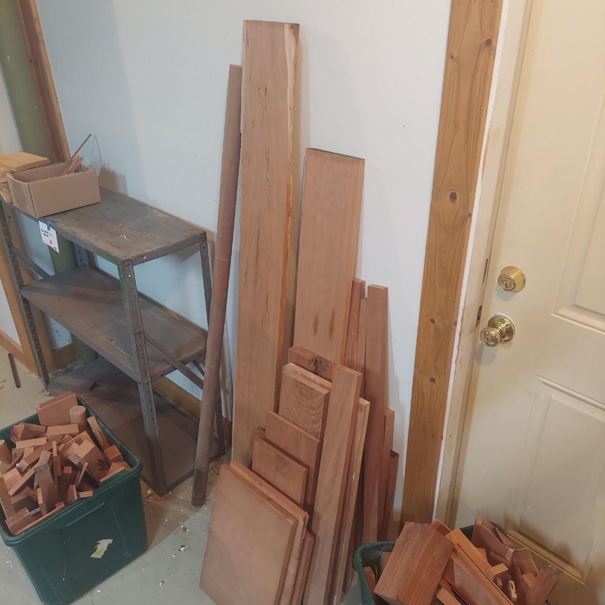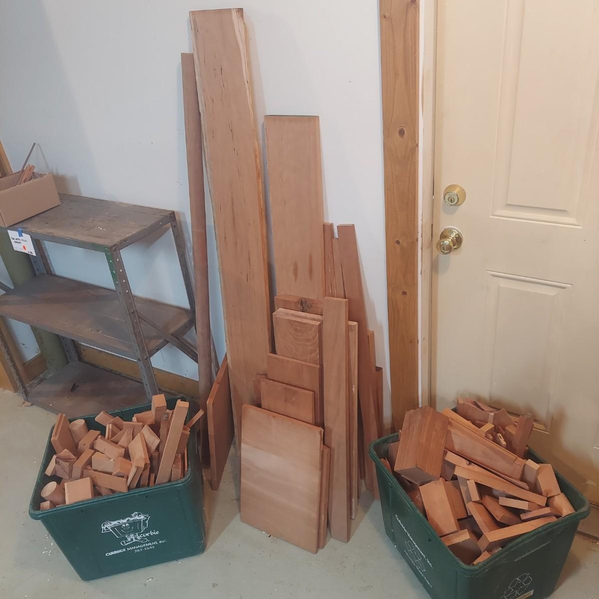 Lot includes several pieces of wood that appear to be cherry. The largest piece measures 62.5” x 6.5” x 1” thick. Please see photos for details. Small pieces come in the plastic containers. The loose wood shown will not be bundled. Be prepared to pack up and load. Local Pickup Only