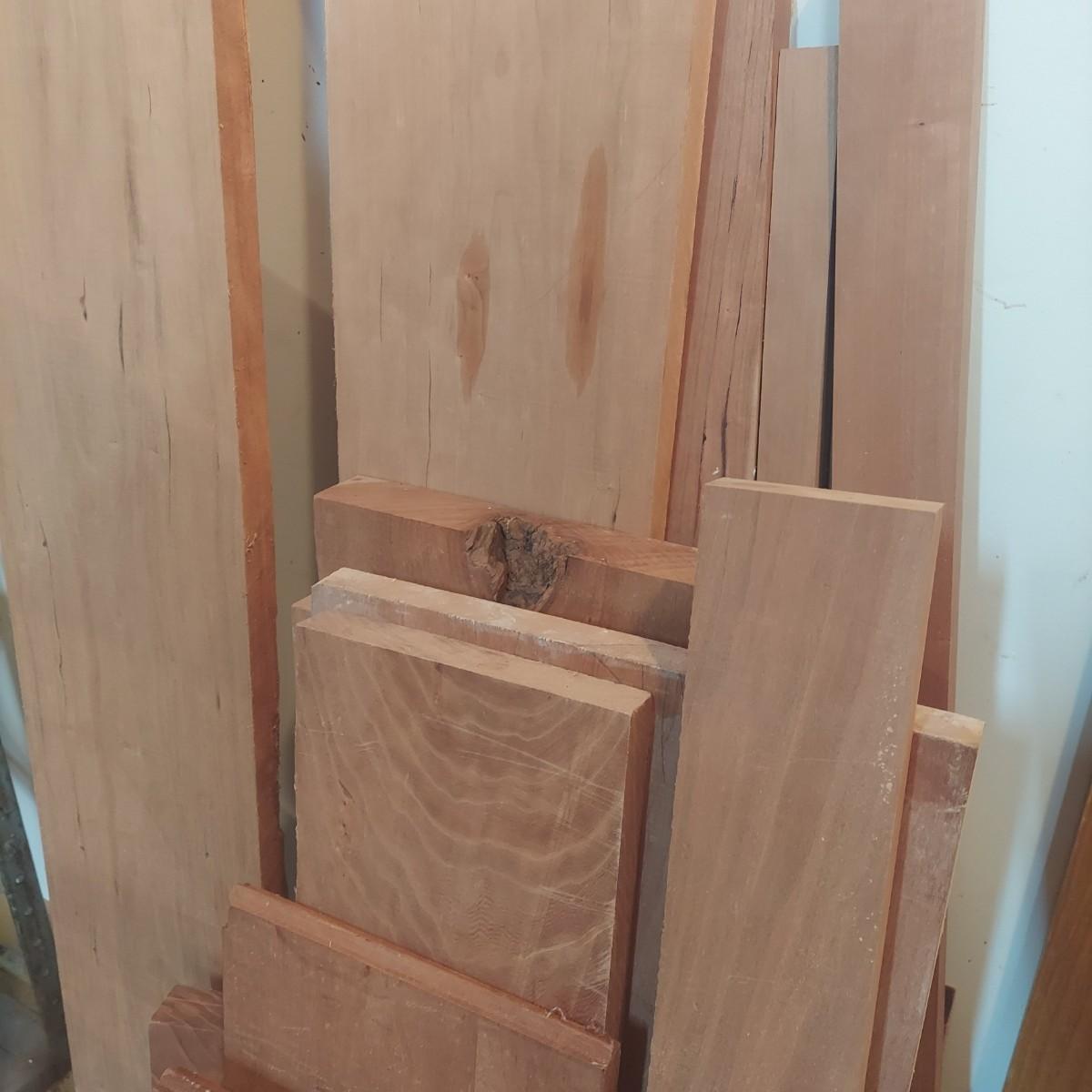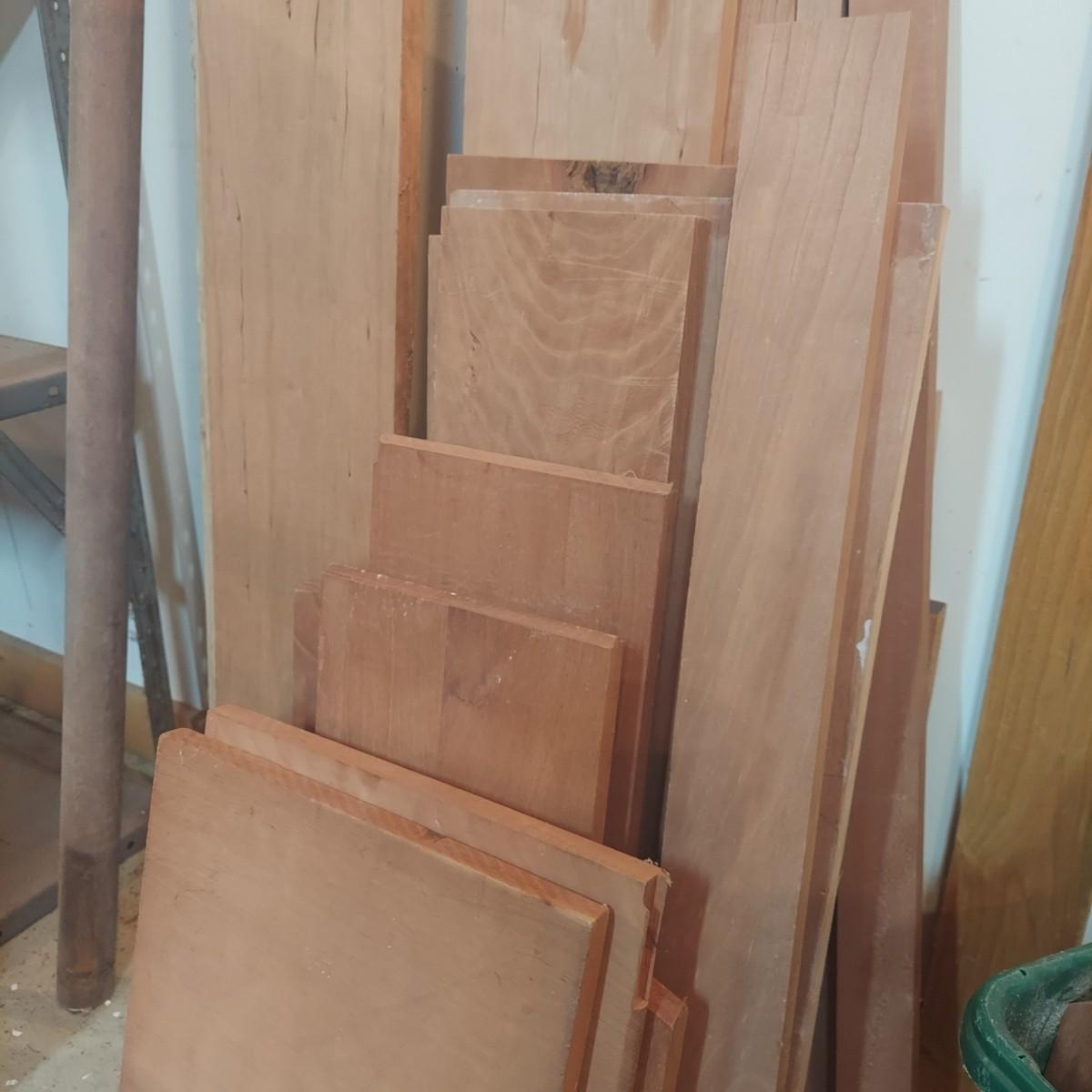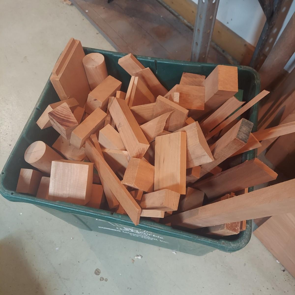 Lot includes several pieces of wood that appear to be cherry. The largest piece measures 62.5” x 6.5” x 1” thick. Please see photos for details. Small pieces come in the plastic containers. The loose wood shown will not be bundled. Be prepared to pack up and load. Local Pickup Only