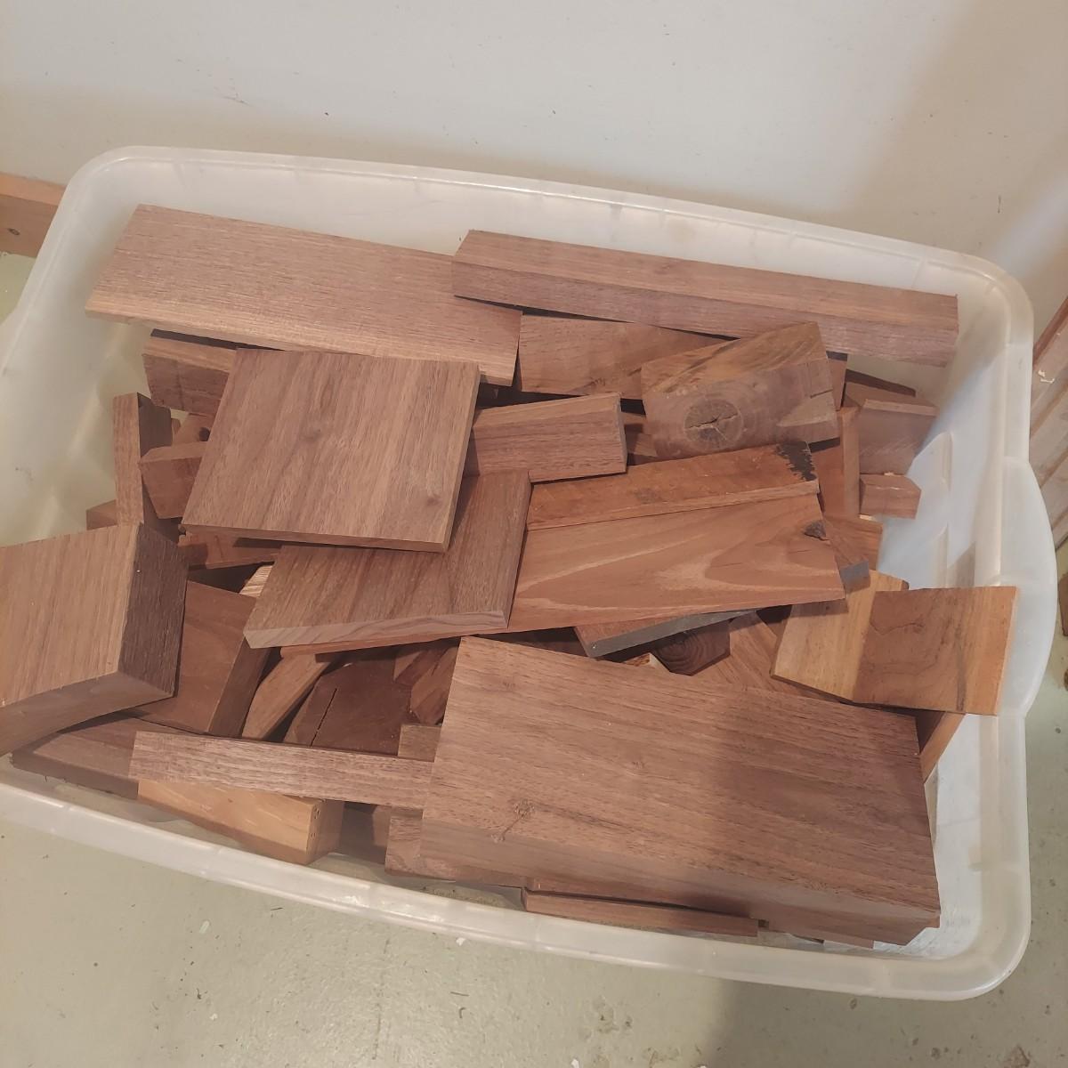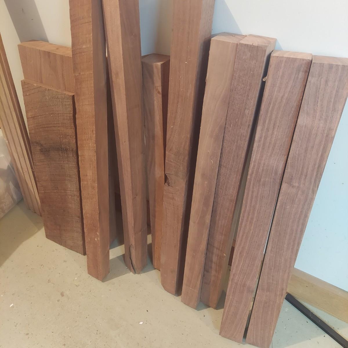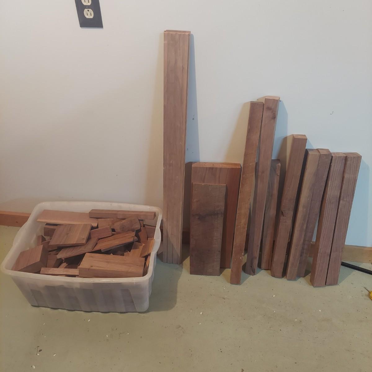 Lot includes several pieces of wood that appear to be walnut. They vary in size. Please see photos for details. The small pieces are in the plastic container pictured. Container measures 23" x 15" x 11"H. The loose wood shown will not be bundled. Be prepared to pack up and load. Local Pickup Only