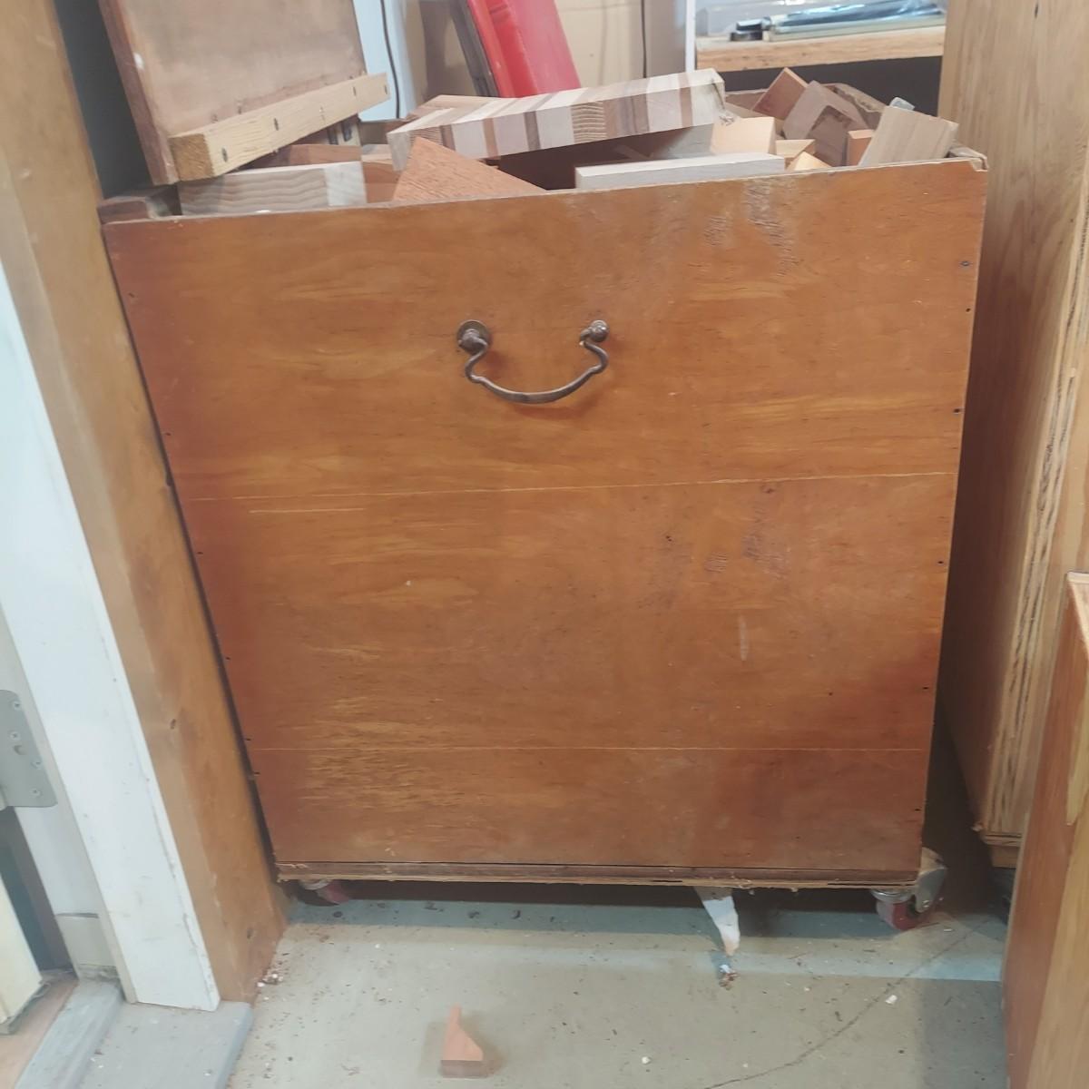 Lot includes three solid wood storage crates that are full of mixed types of wood scraps. The two largest crates are on wheels. The crate with a lid measures 20"SQ x 24"H. Please see photos for details. These pieces are very heavy. Local Pickup Only. Winning bidder must bring assistance to help move and load this item due to its weight and/or size.