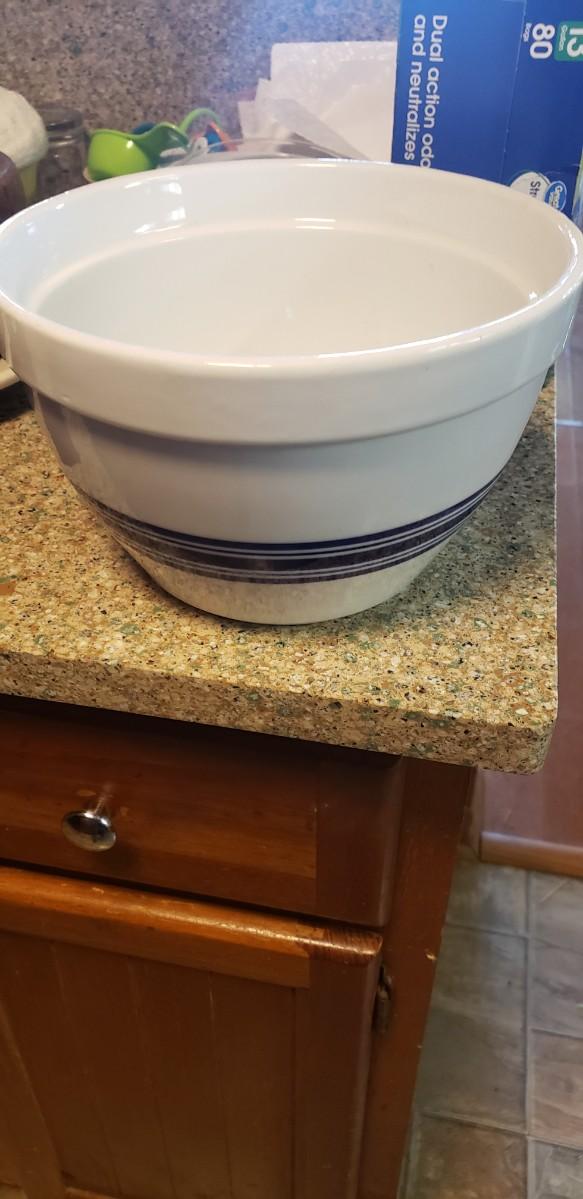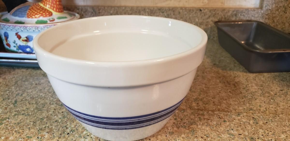 Large white with blue striped mixing bowl