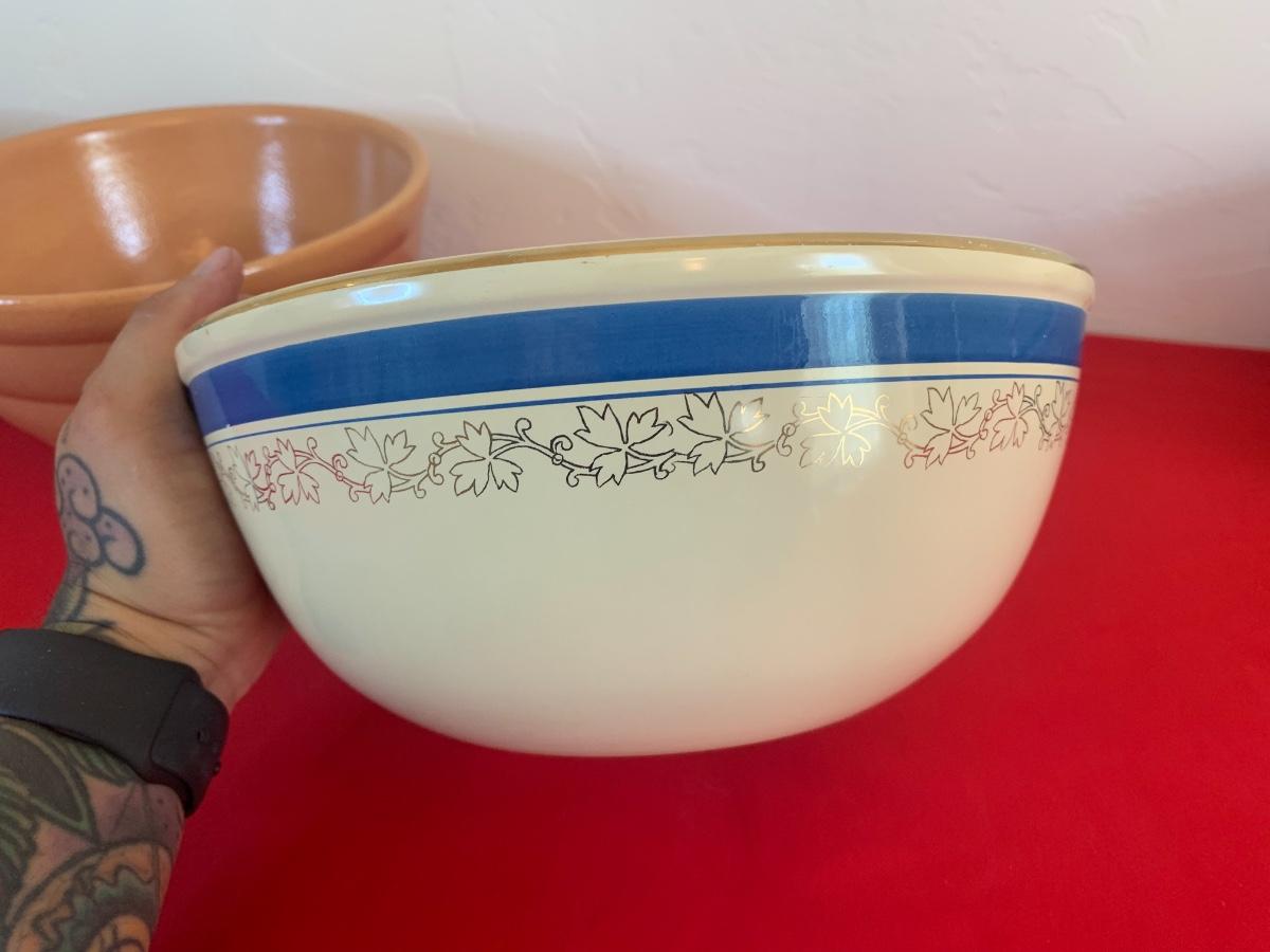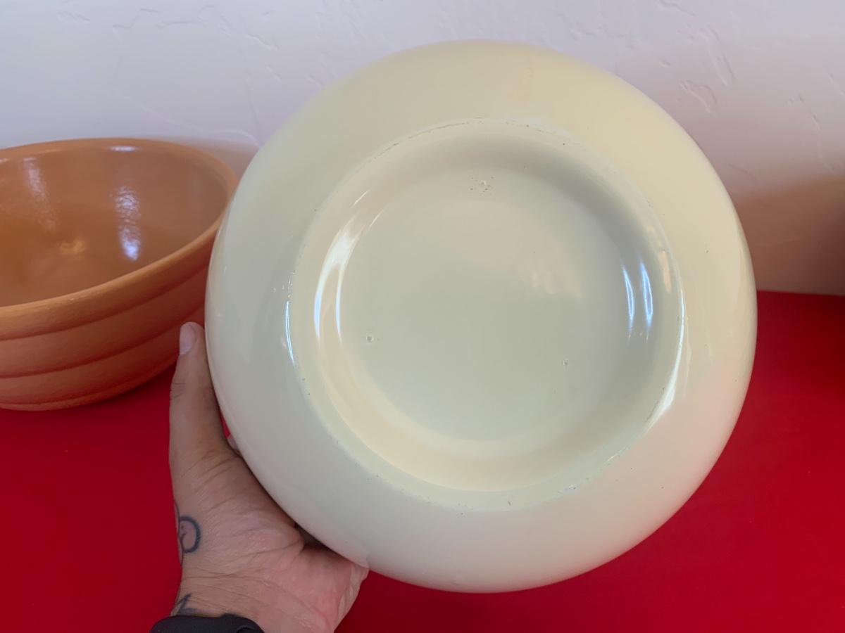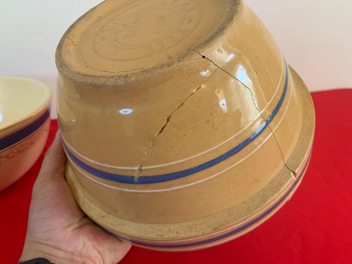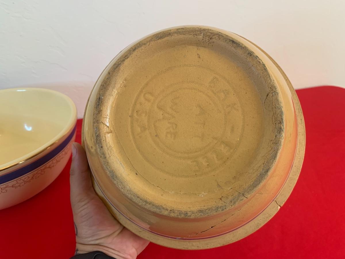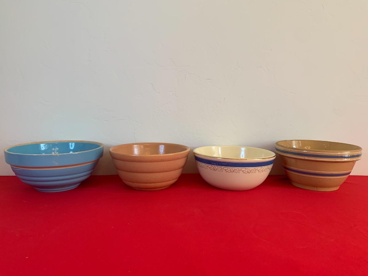 Lot includes 4 vintage mixing bowls, one marked Bak-ezee ATT Ware has large crack throughout. Others in good condition.