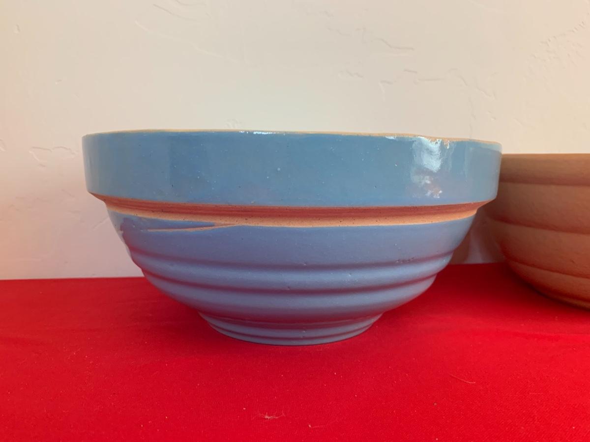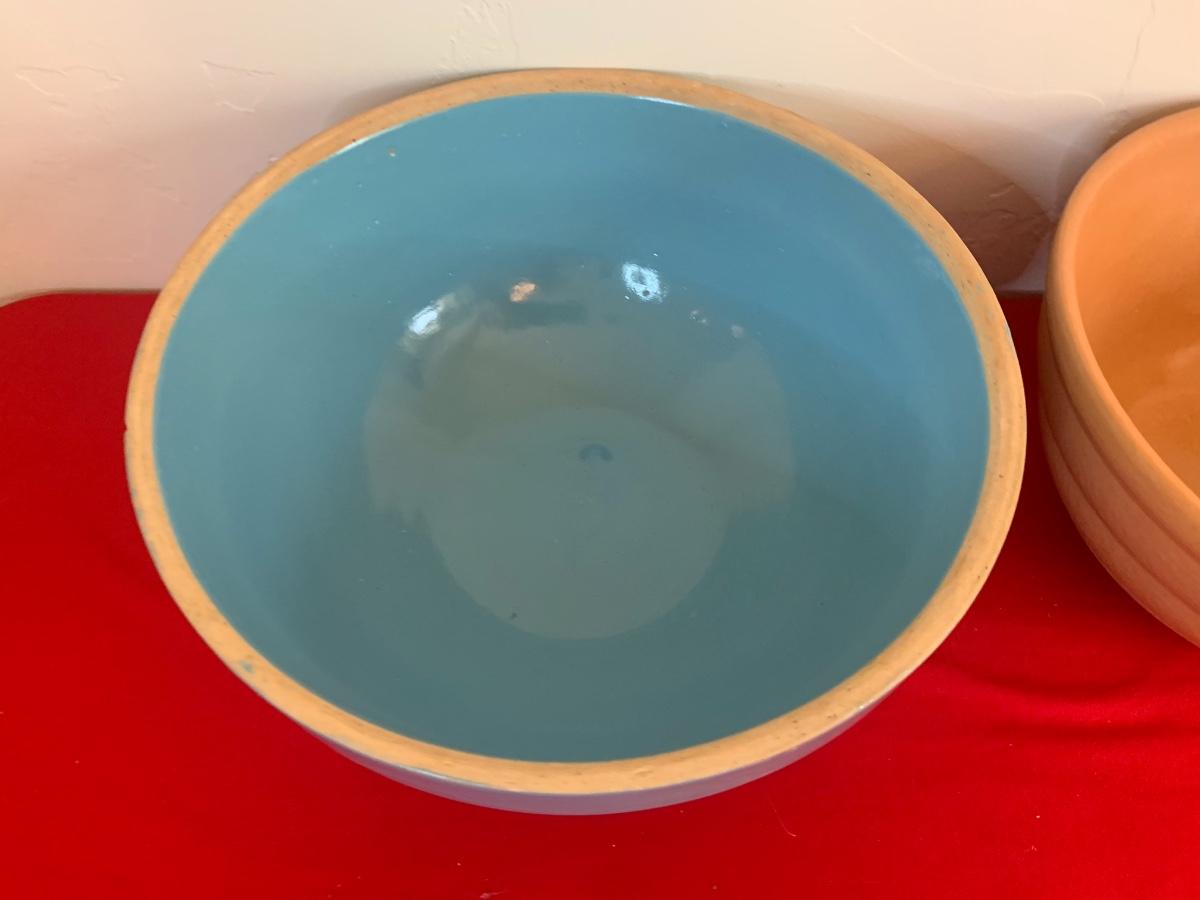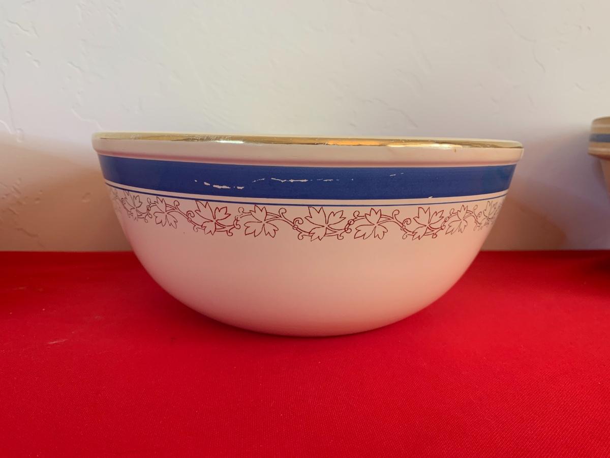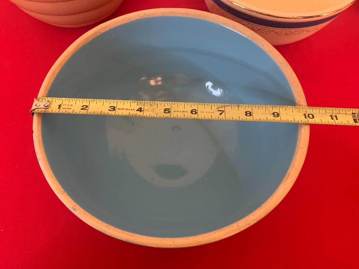 Lot includes 4 vintage mixing bowls, one marked Bak-ezee ATT Ware has large crack throughout. Others in good condition.