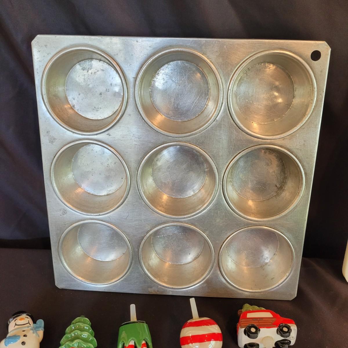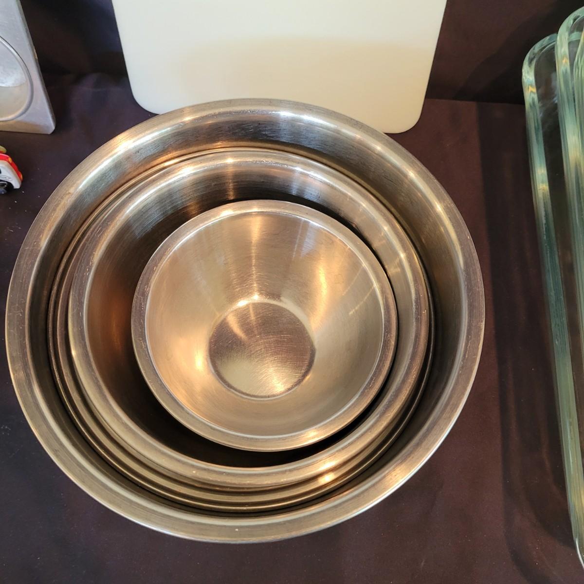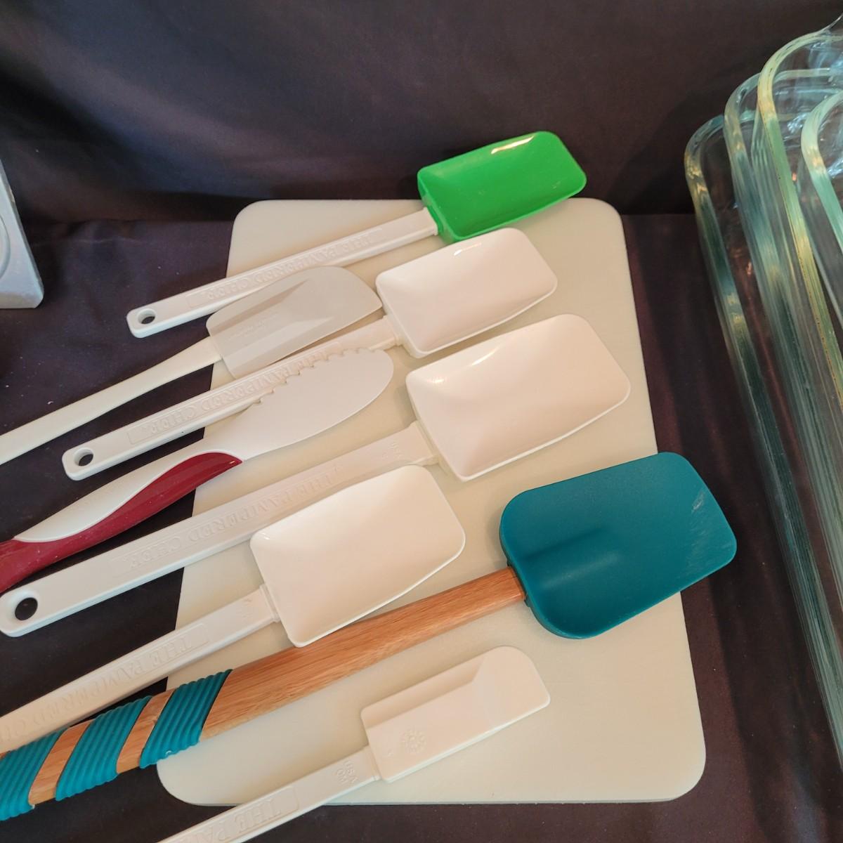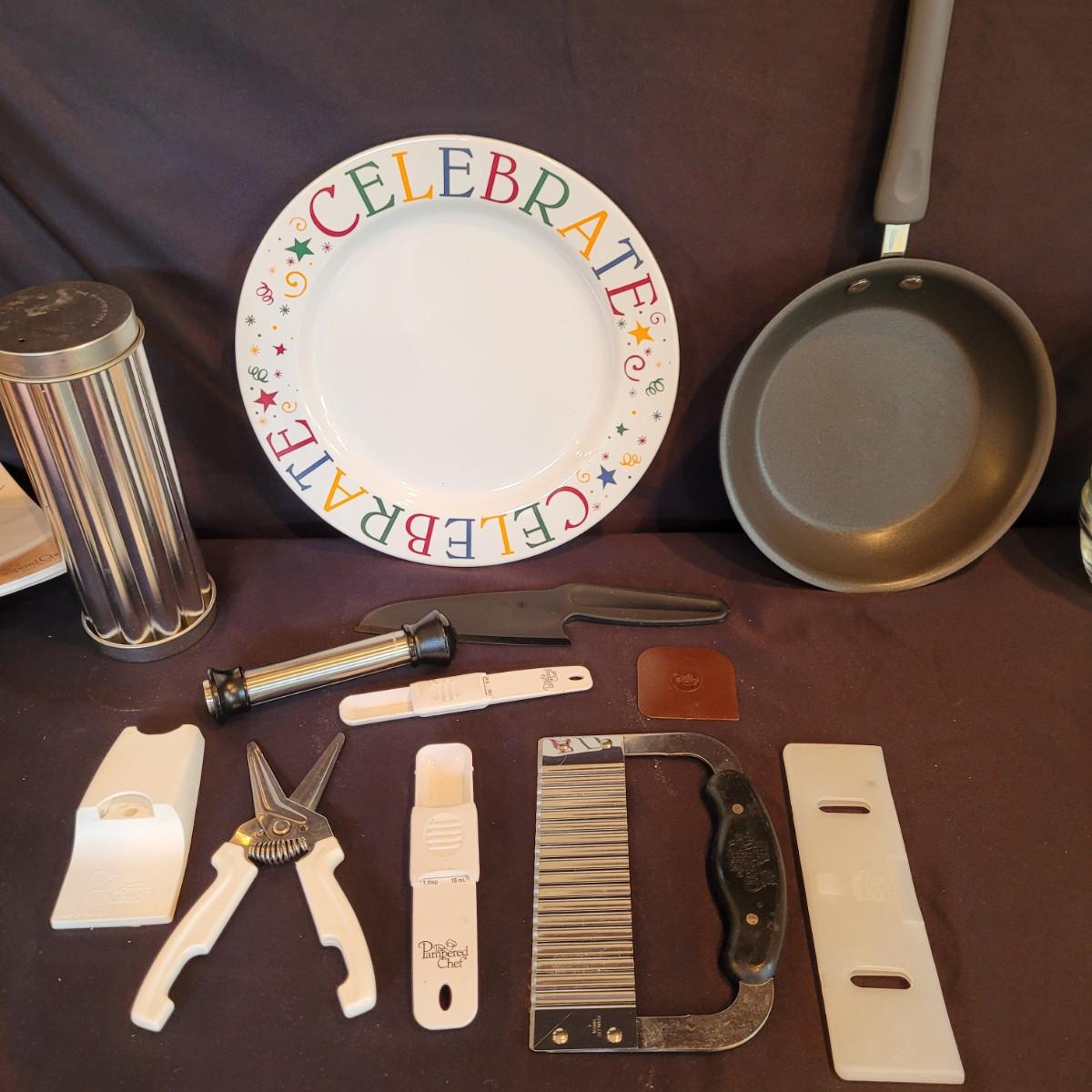 This lot includes four glass baking dishes, metal mixing bowls, decorative ceramic cake toppers, a cutting board and an assortment of spatulas and other kitchen utensils/accessories. Local pickup only.