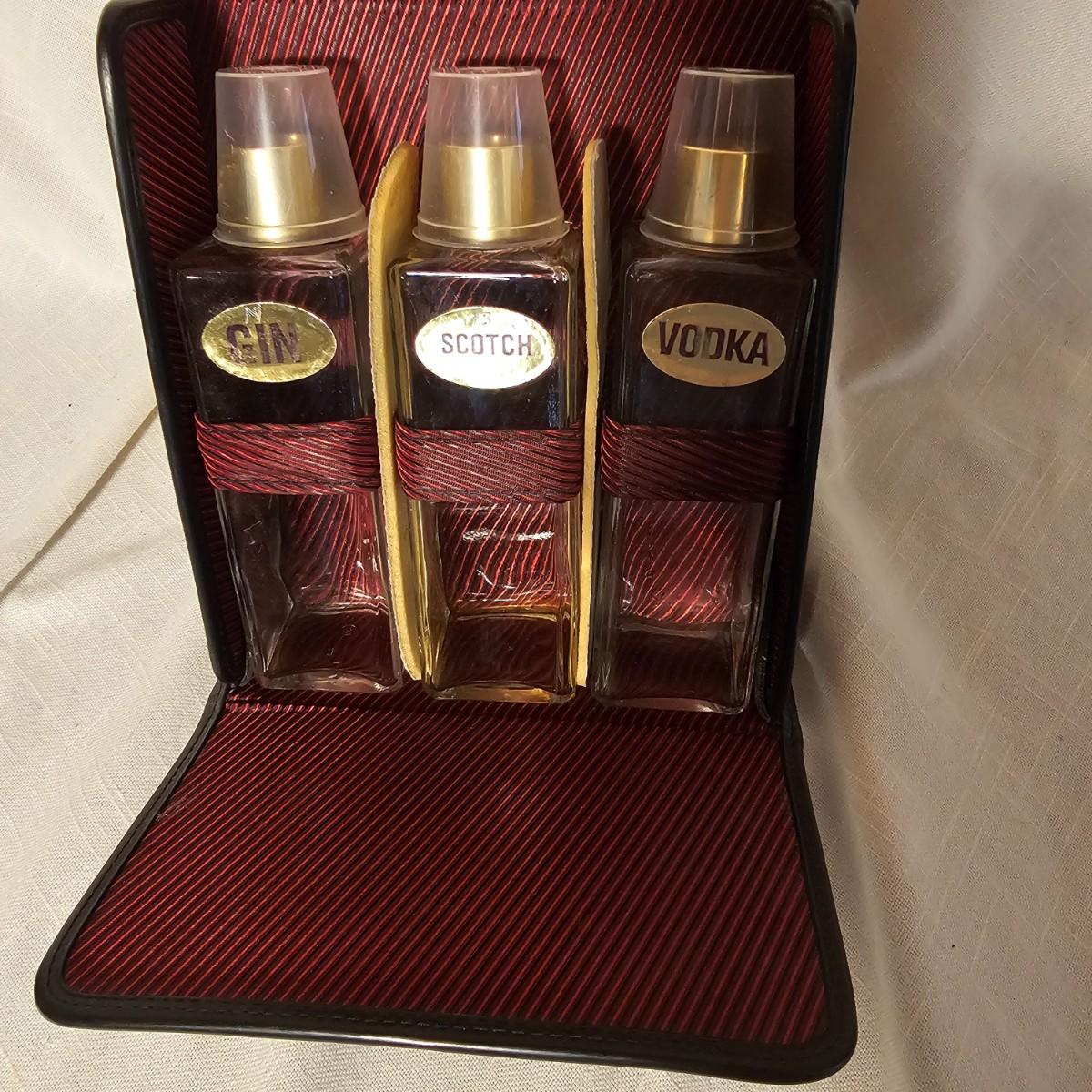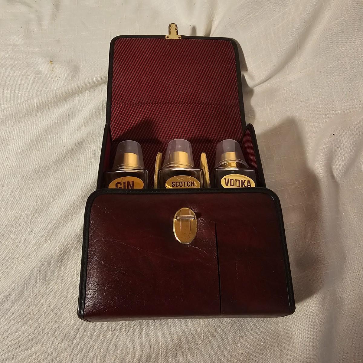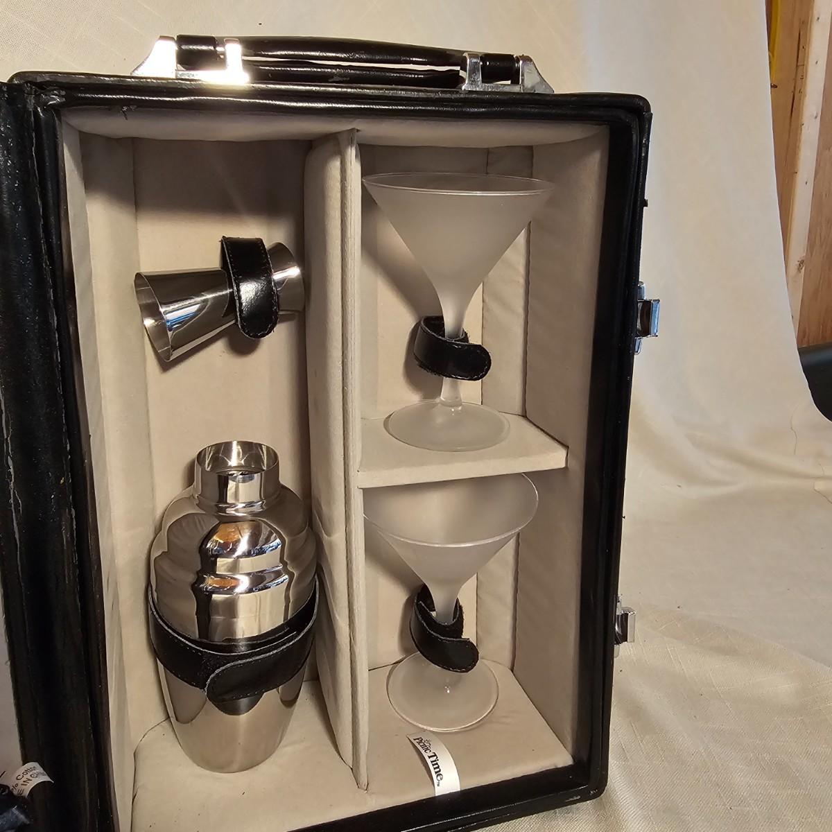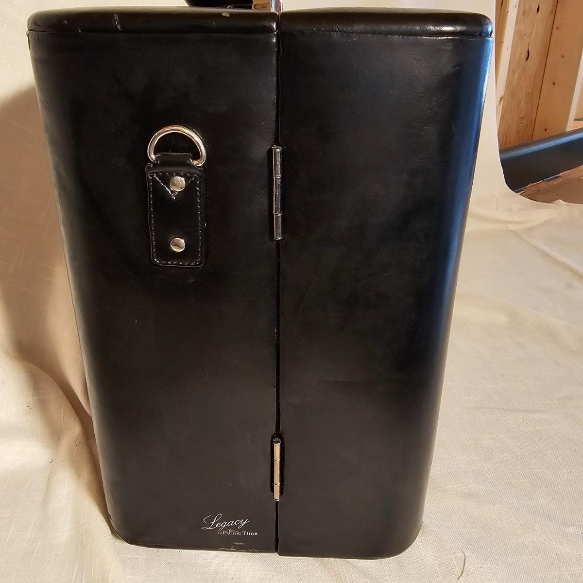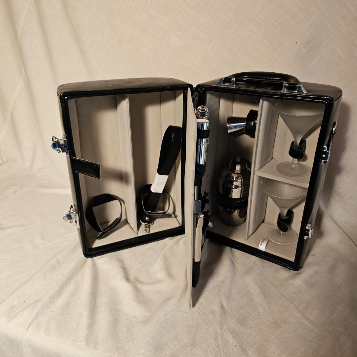 Three distinct cases for transporting and mixing your favorite potables or wine. Small brown case is labeled for specific liquors, has individual shot glasses for each. 7.5"x 3" x 9"H, slit in front of case. Double size case to hold two bottles by Picnic Time, measures 10" x 5" x 14"H. Has handle on top and also a carry strap. Slight nicks and rubs on case. Large case, also by Picnic Time, is a complete bar setup to go. Space for two bottles, spoon, strainer, mix cup and measuring cups. Measures 10" x 10" x 14"H, has handle and carry strap. Some nicks and tears also. See photos for details. Shipping available.