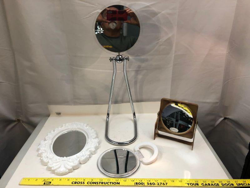 Lot of various small mirrors. Cosmetic mirrors, wall hanging, handheld and table sitting. #022-0477