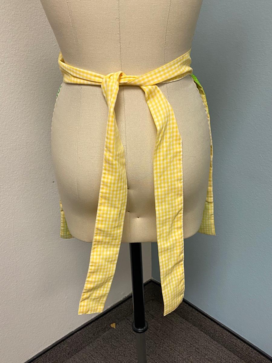 Vintage Yellow & Green Patchwork Handmade Tie Back Half Apron. In good condition, no stains noticed. Apron ties in the back for adjustable fit, mannequin is an 8 so maybe size small to extra-large as the ties are not to long. No pockets.
