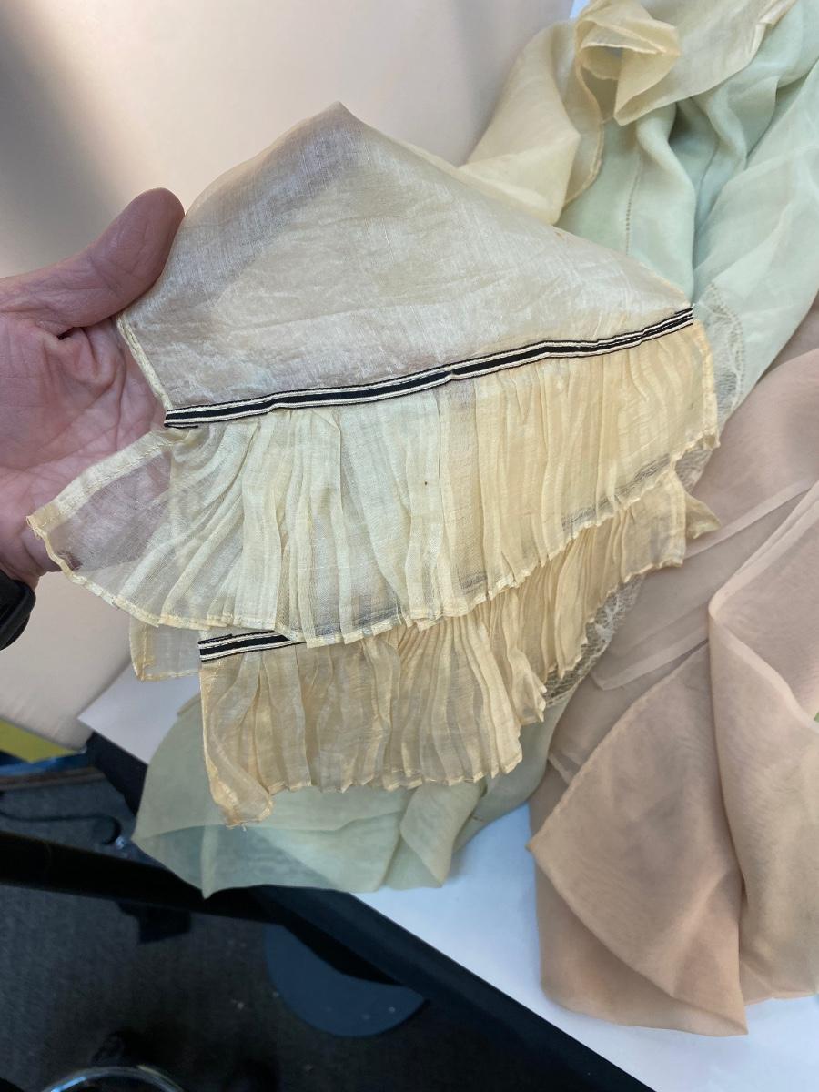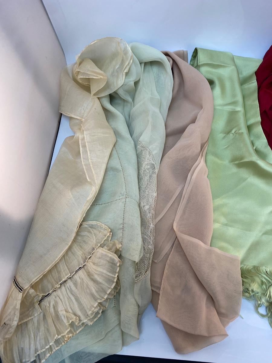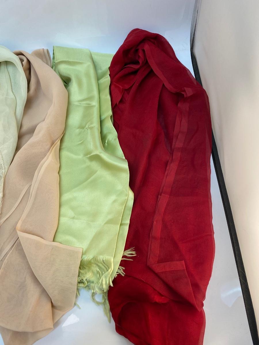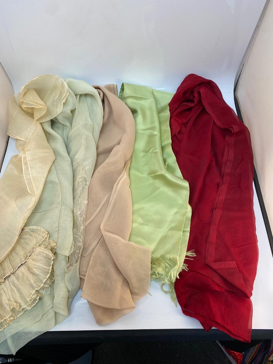 Lot of 5 Vintage Sheer Long Scarves Shoulder Wraps. Delicate fabric condition from age. Did notice a couple holes and light spots but no major rips or stains.