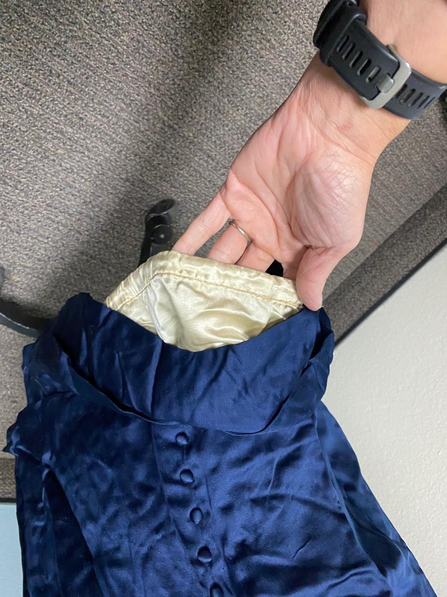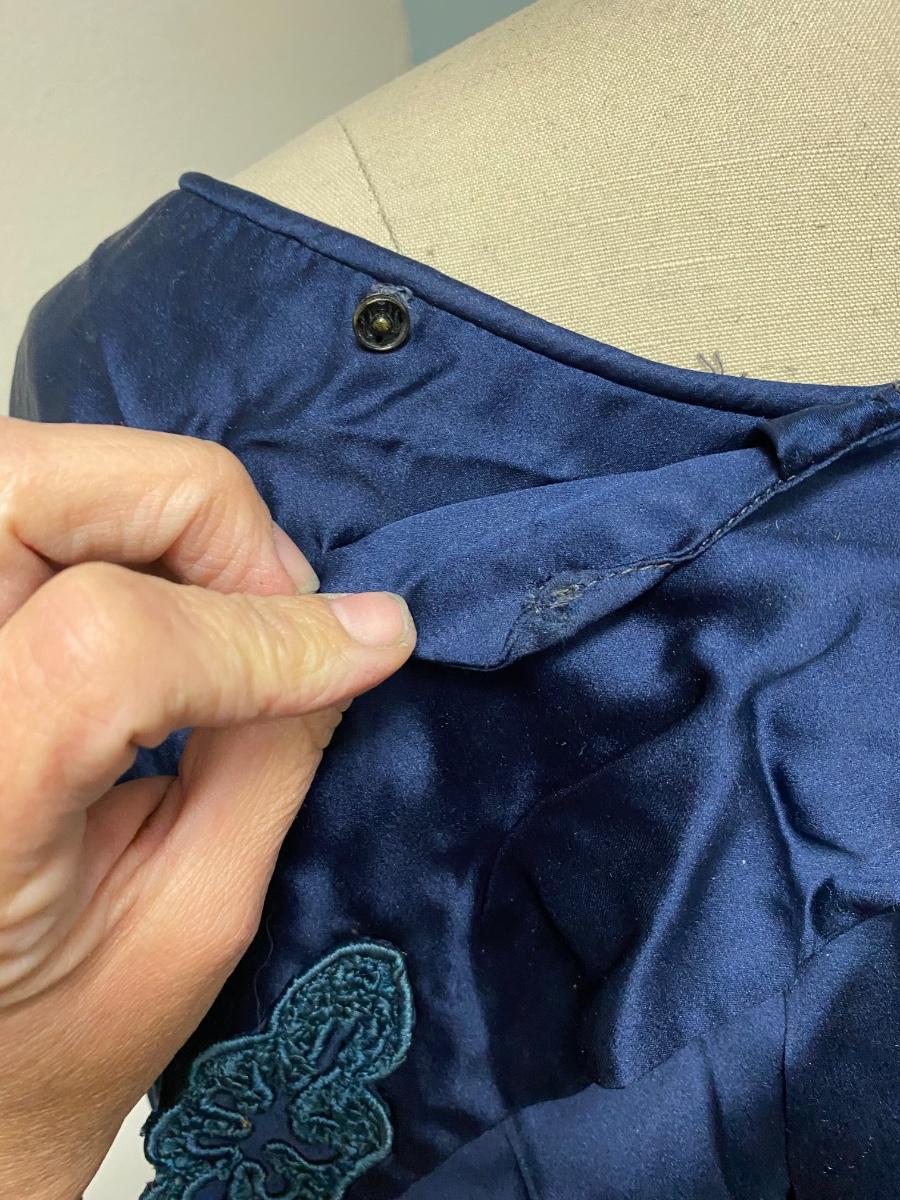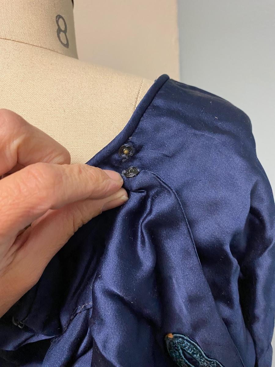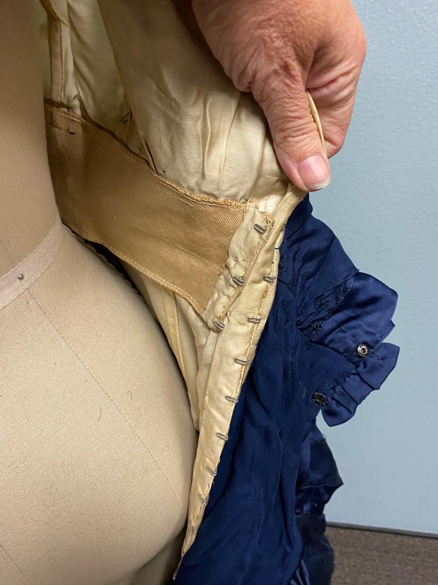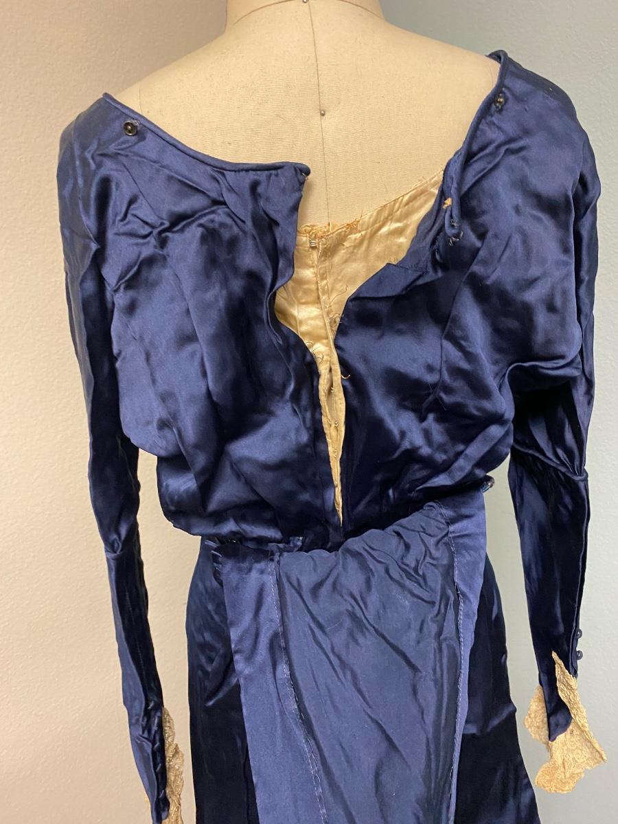 Antique Victorian Royal Blue Evening Afternoon Dress with Note. Fitted style dress, Hook and eye closures down the back with a decorative flap that attaches at the top to cover the back closures. In good antique condition, needs a couple closures replaced, no major spots or damage. A little tight on size 8. Has a handwritten note attached regarding previous owner and age.