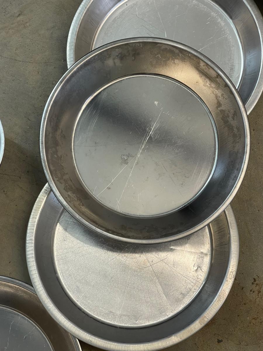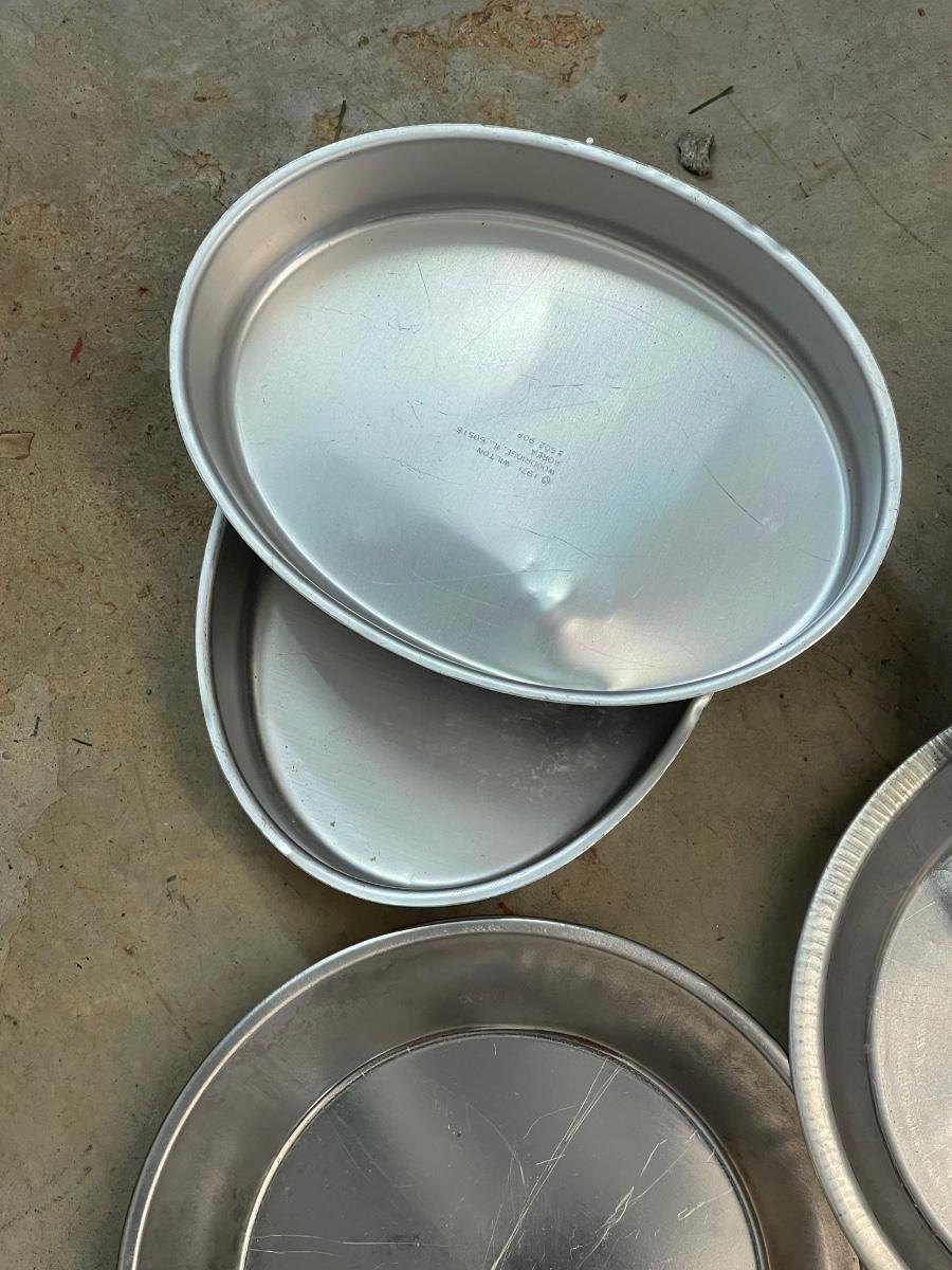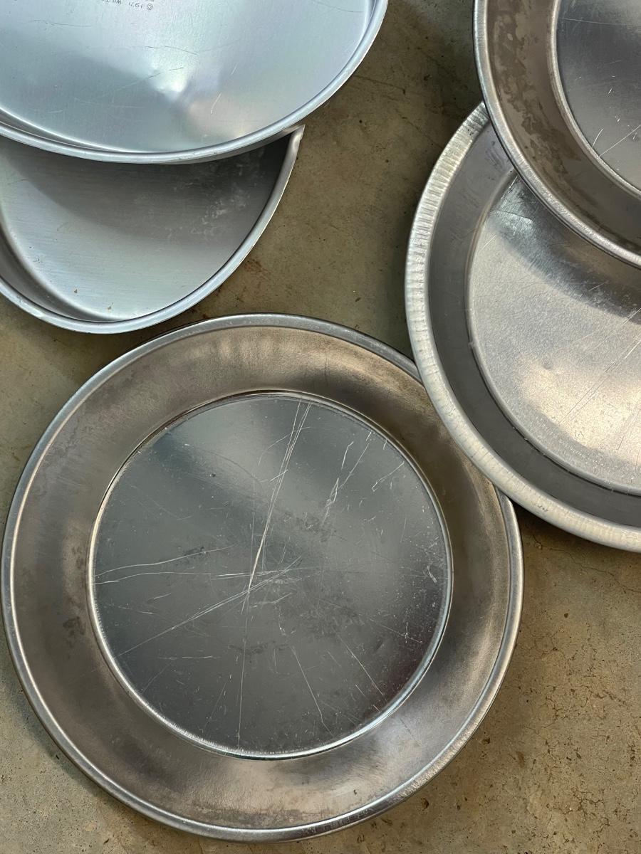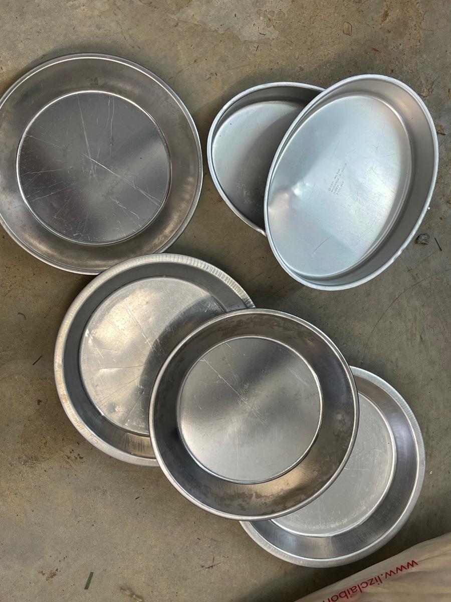 Three Vintage Clear Pie Plates - Pyrex - & 6 Oval and Round Aluminum Cake Pans