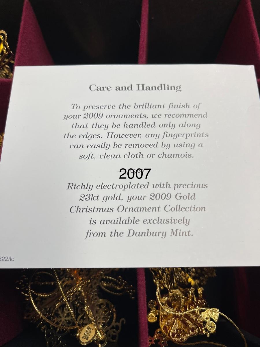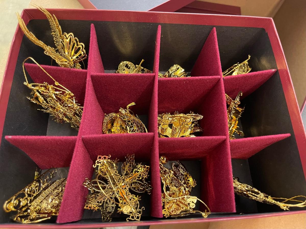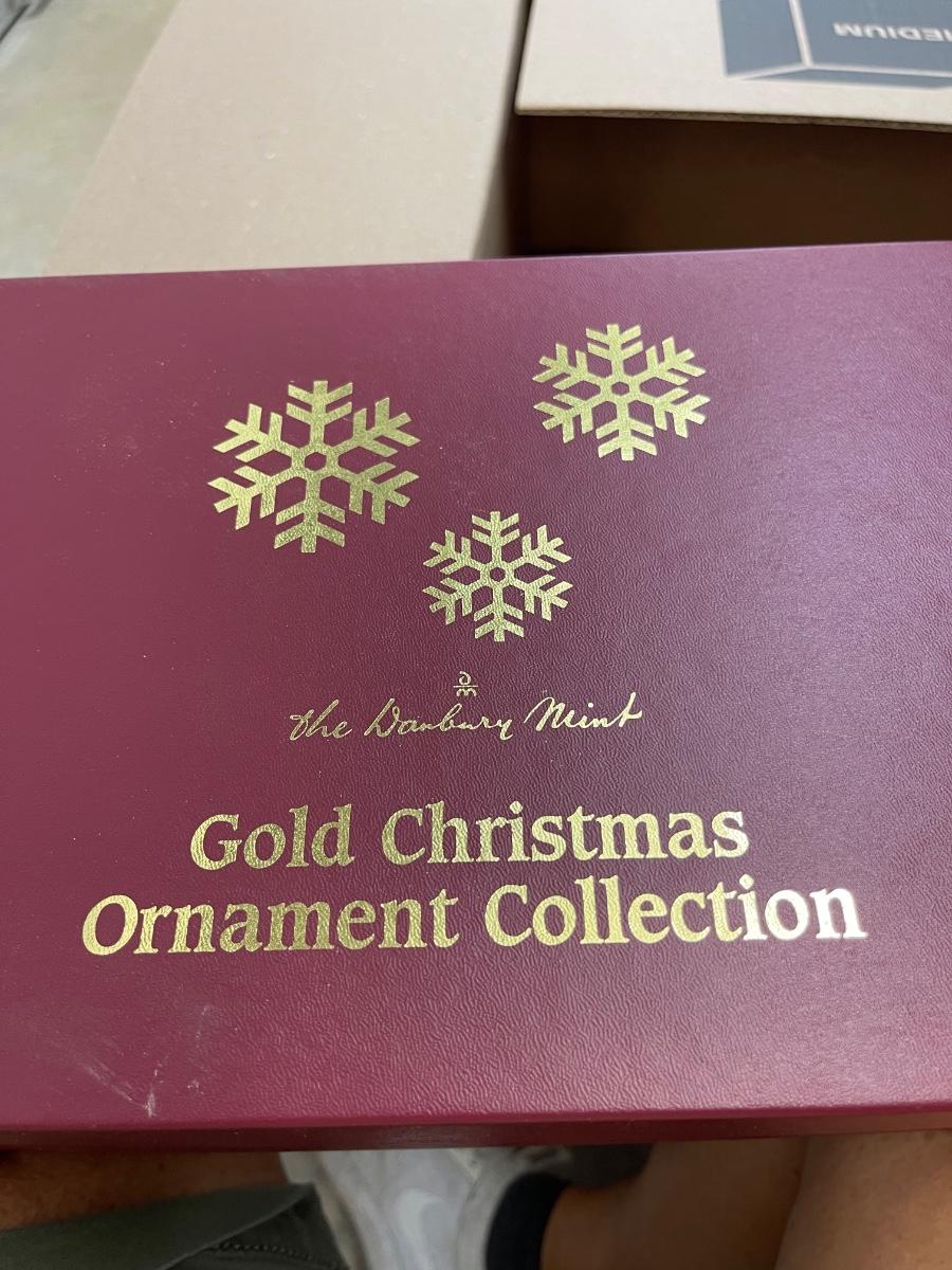 These boxes contain 12 Electroplated ornaments with 23K gold. Each ornament cost $25 so and entire box was purchased for $300 plus shipping. These are certified through Danbury Mint and gorgeous.