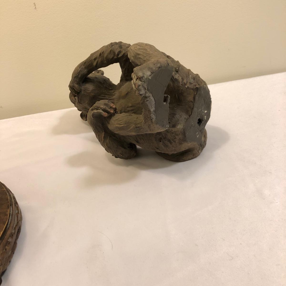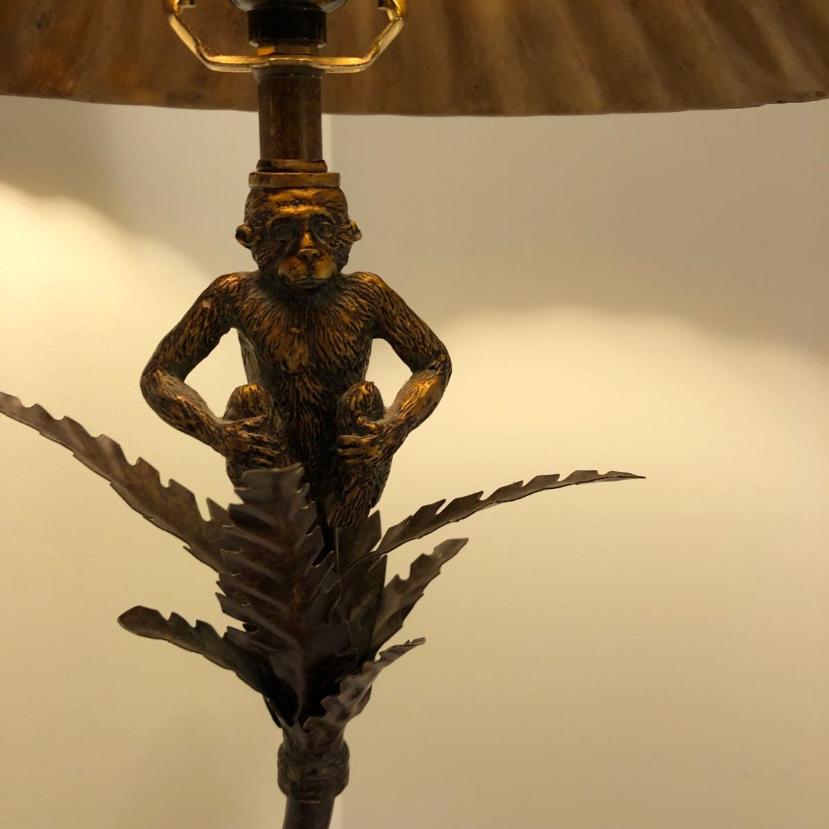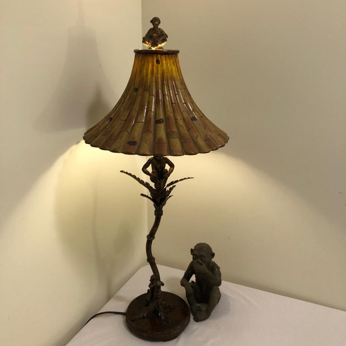 Three monkeys and a palm tree decorate this fun metal monkey table lamp. A cross-legged monkey sits on top of the metal lamp shade, another sits on top of a palm tree, and another starts to climb the base of the tree. The lamp turned on when plugged in. The lamp shade is 13.5" in diameter. The lamp is 32.5" high with a base that is 8" in diameter. A lightweight brown grey seated monkey resin sculpture is included. Shipping available.