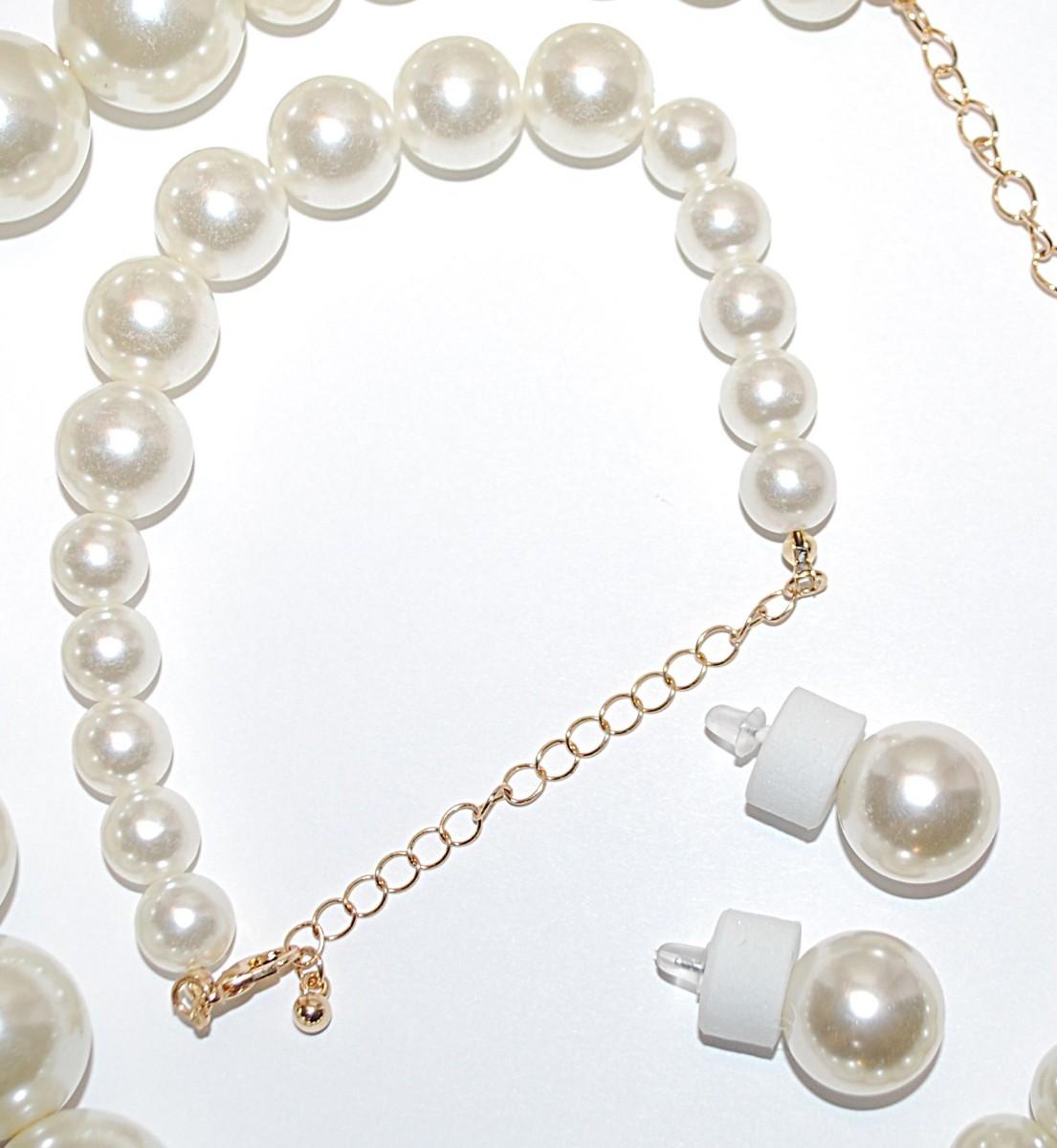 Pearl Style White GLOBES NECKLACE (14" L + Lobster Clasp) & BRACELET (3½" Opening +Toggle) & EARRINGS JEWELRY SET with Gold Tone Setting + Matching Earrings Pair with Stud Post Clasp